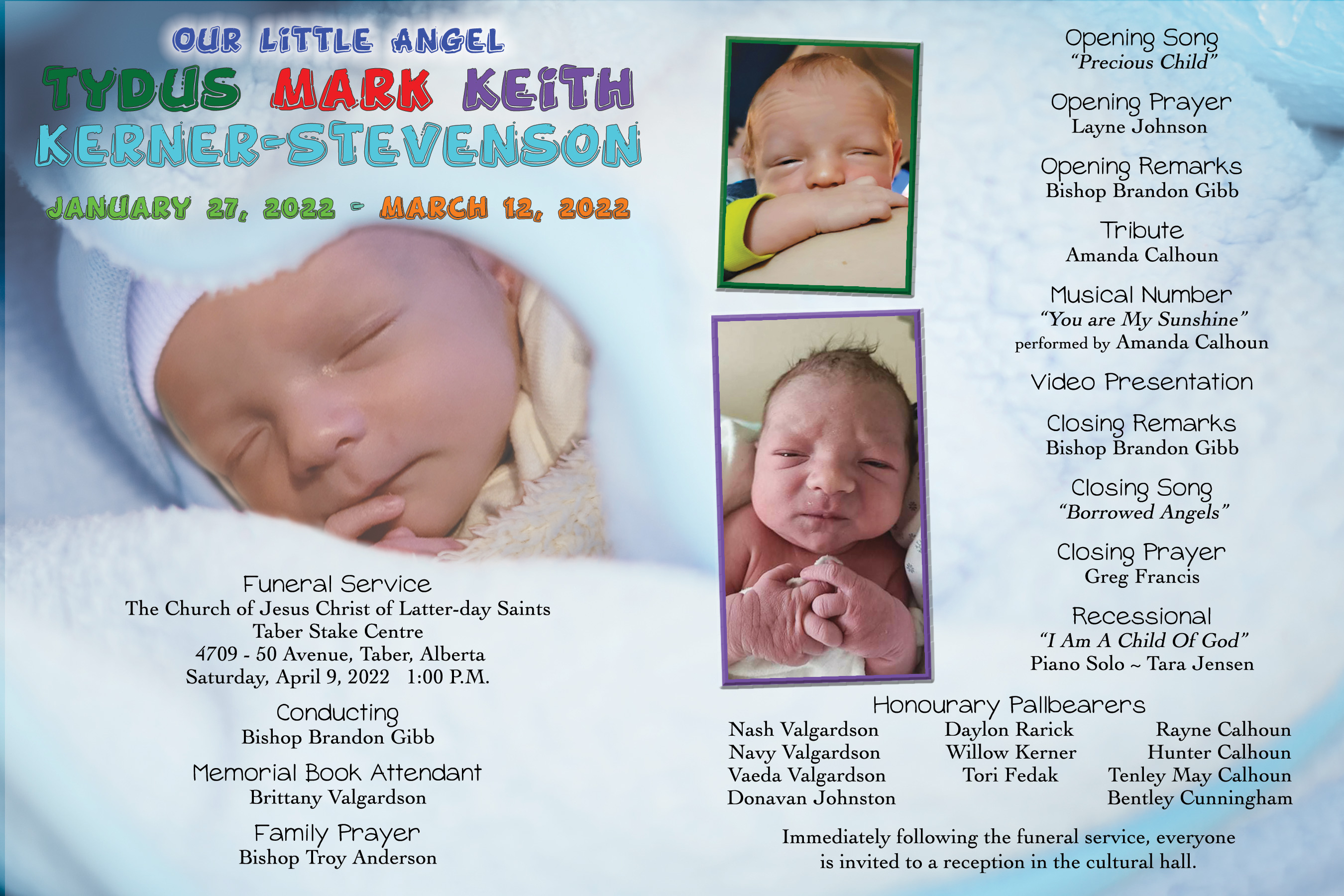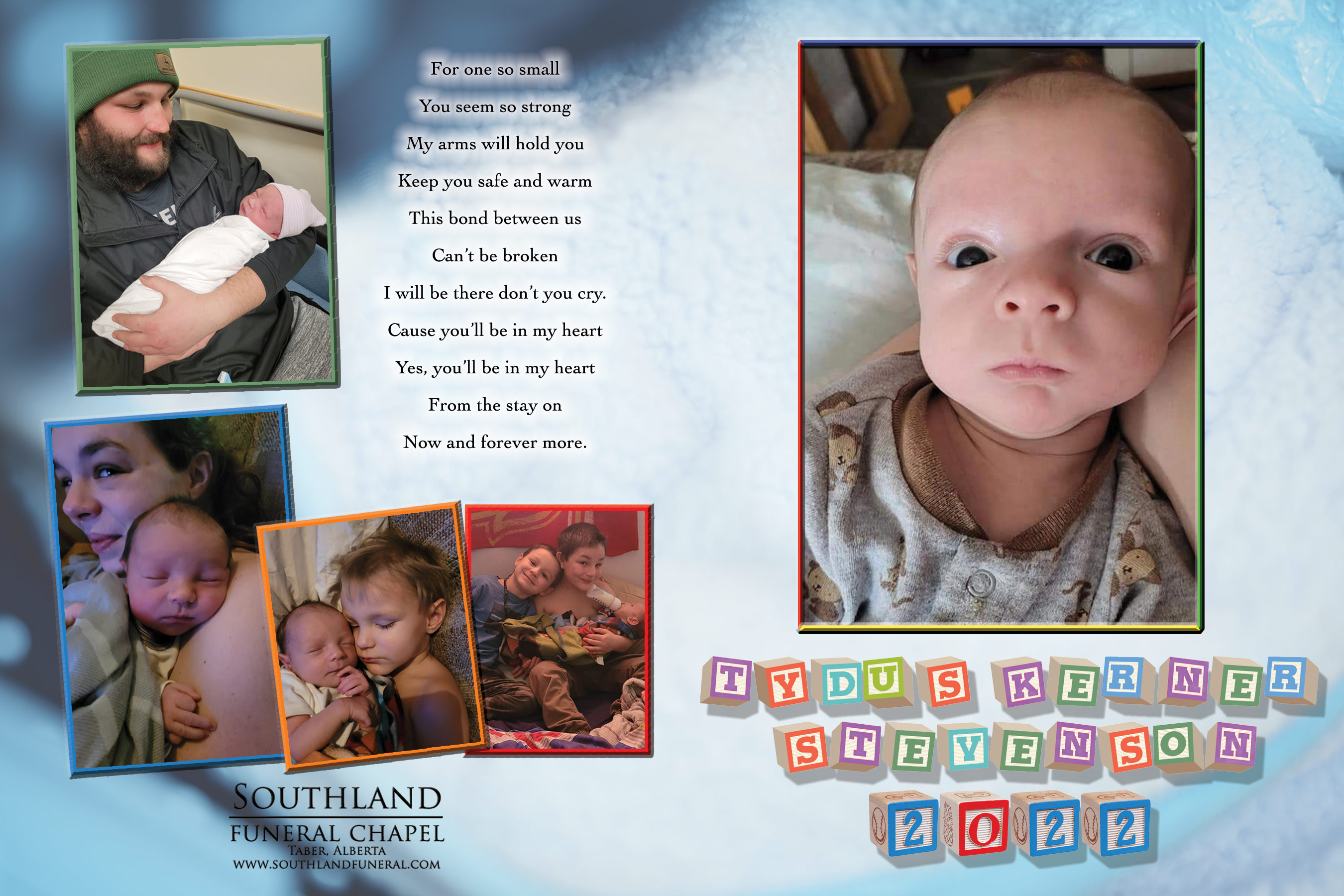 Tydus Mark Keith Kerner-Stevenson, beloved infant son of Robbi-Lee Kerner and Curtis Stevenson, passed away in Calgary on Saturday, March 12, 2022 at the age of 44 days.