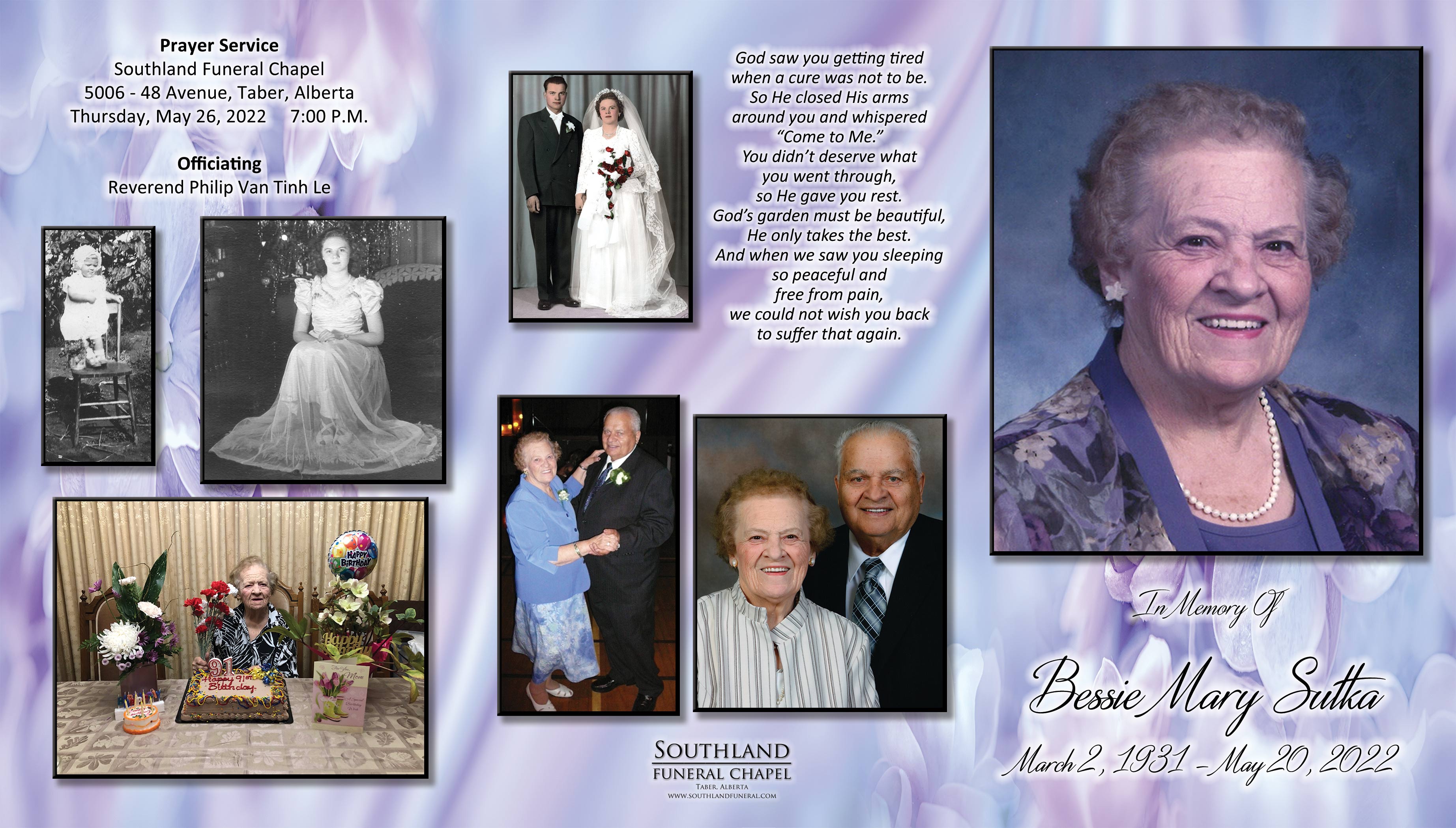 It is with great sorrow that the family of Bessie Mary Sutka (née Kacer), announce the passing of their dear mother, grandmother and great grandmother in Taber, with family by her side, on Friday, May 20, 2022 at the age of 91 years.