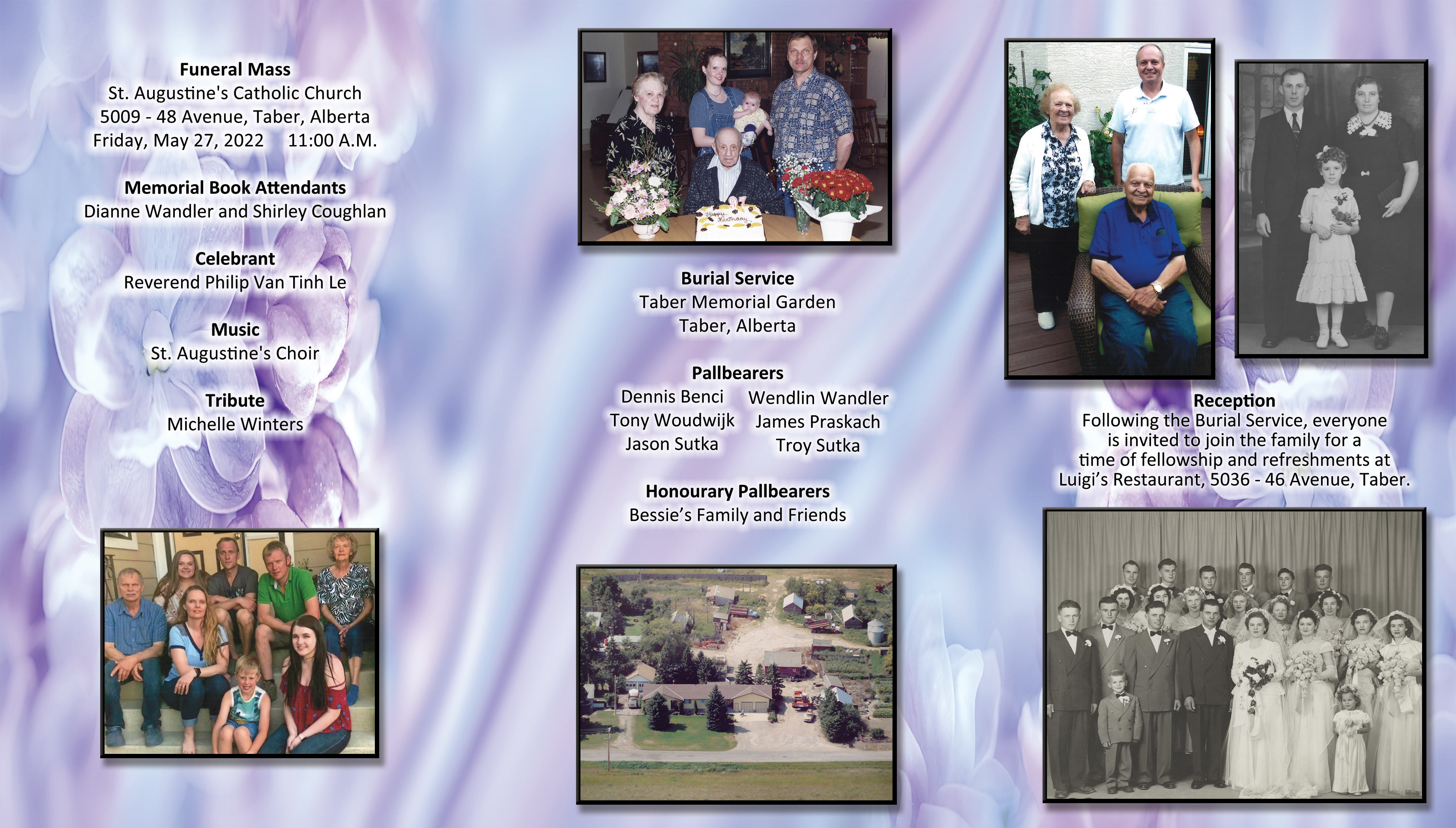 The Funeral Mass was celebrated at St. Augustine's Catholic Church, 5009 - 48 Avenue, Taber on Friday, May 27, 2022 at 11:00 A.M. Burial followed at the Taber Memorial Garden.