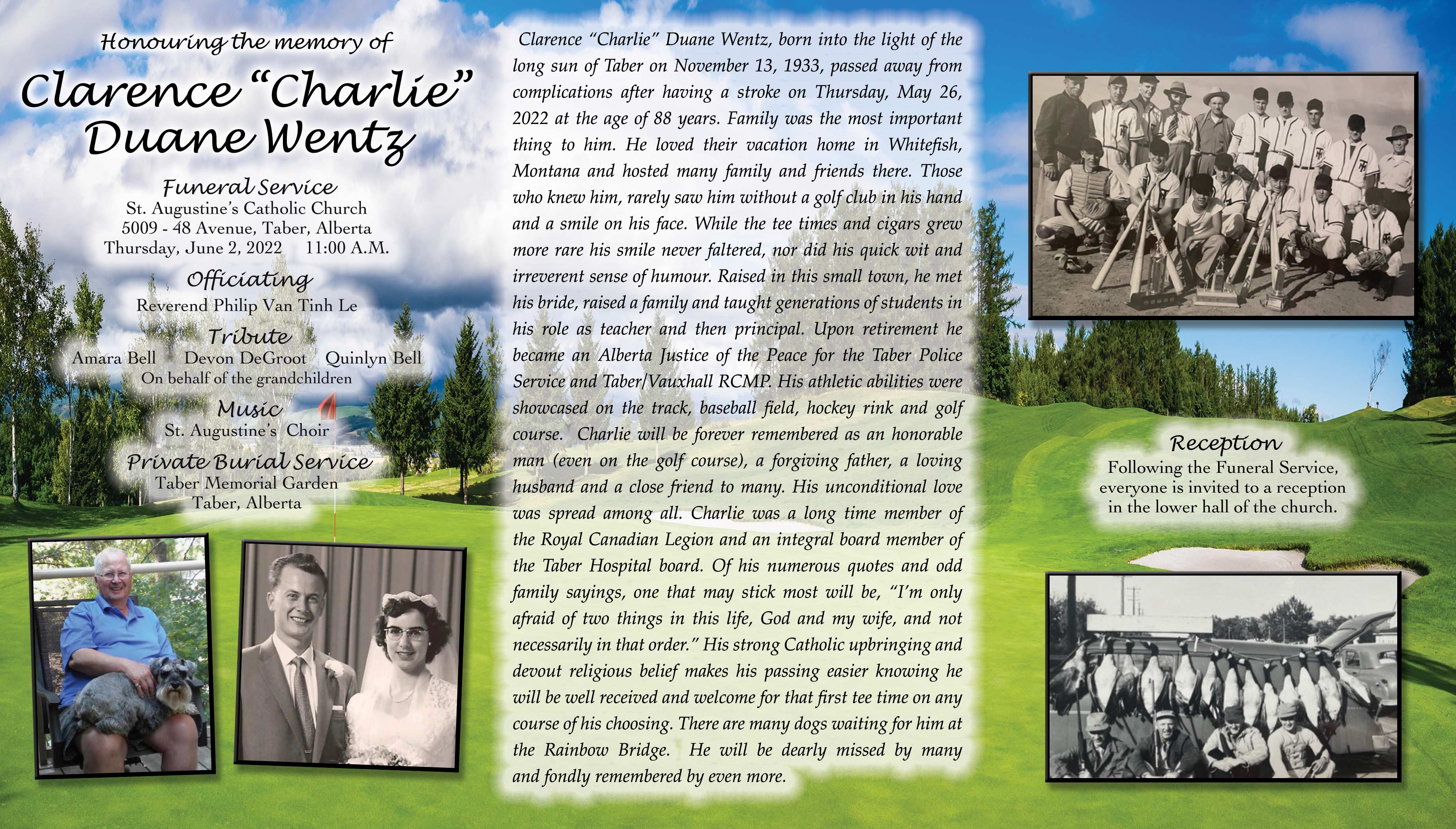 Family was the most important thing to him. He loved their vacation home in Whitefish, Montana and hosted many family and friends there. Those who knew him, rarely saw him without a golf club in his hand and a smile on his face. While the tee times and cigars grew more rare his smile never faltered, nor did his quick wit and irreverent sense of humour. Raised in this small town, he met his bride, raised a family and taught generations of students in his role as teacher and then principal. Upon retirement he became an Alberta Justice of the Peace for the Taber Police Service and Taber/Vauxhall RCMP. His athletic abilities were showcased on the track, baseball field, hockey rink and golf course. Charlie will be forever remembered as an honorable man (even on the golf course), a forgiving father, a loving husband and a close friend to many. His unconditional love was spread among all. Charlie was a long time member of the Royal Canadian Legion and an integral board member of the Taber Hospital board. Of his numerous quotes and odd family sayings, one that may stick most will be, “I’m only afraid of two things in this life, God and my wife, and not necessarily in that order.” His strong Catholic upbringing and devout religious belief makes his passing easier knowing he will be well received and welcome for that first tee time on any course of his choosing. There are many dogs waiting for him at the Rainbow Bridge. He will be dearly missed by many and fondly remembered by even more.