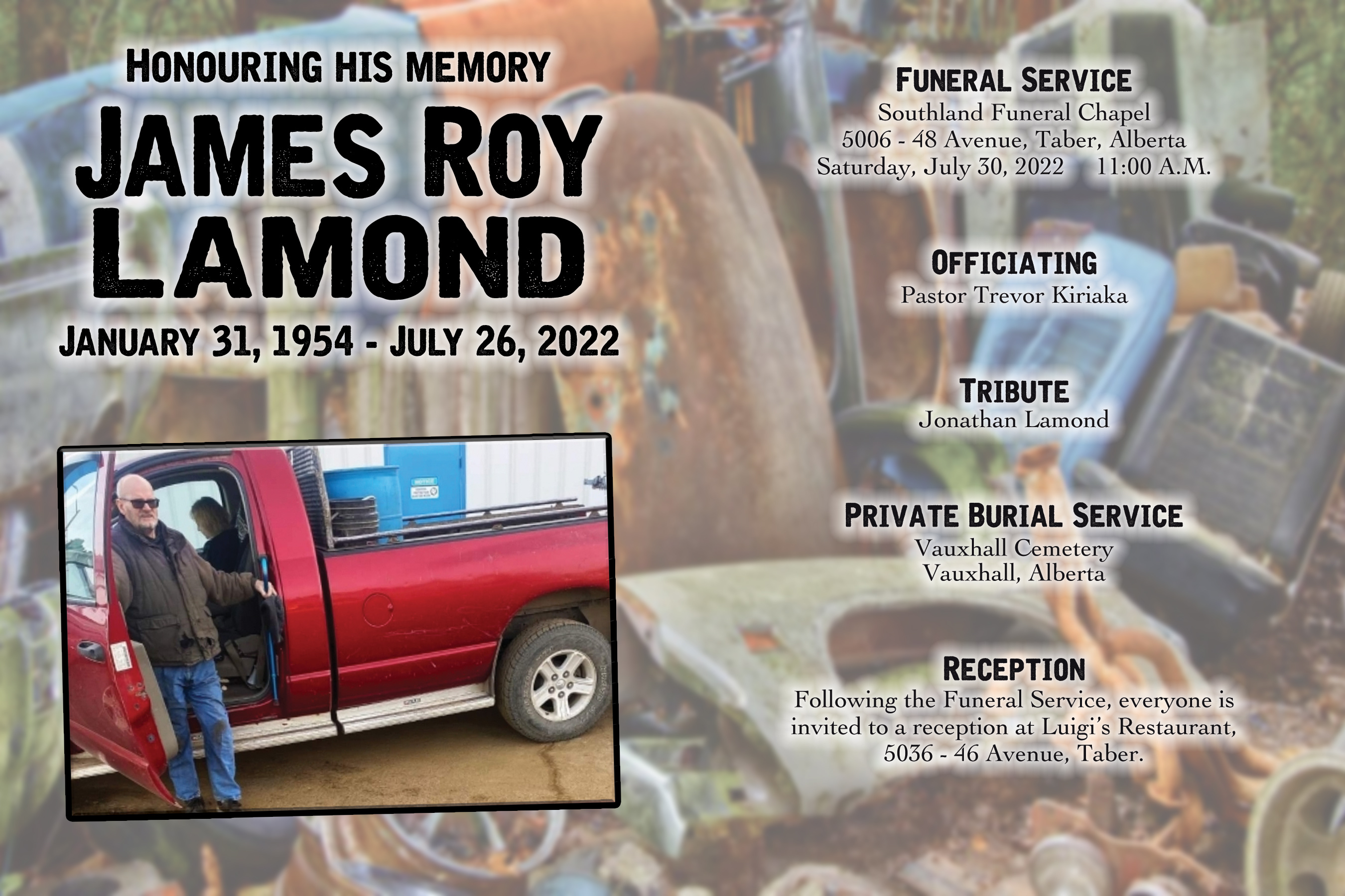 The Funeral Service was held at Southland Funeral Chapel, 5006 - 48 Avenue, Taber on Saturday, July 30, 2022 at 11:00 A.M. A private burial service followed at the Vauxhall Cemetery.