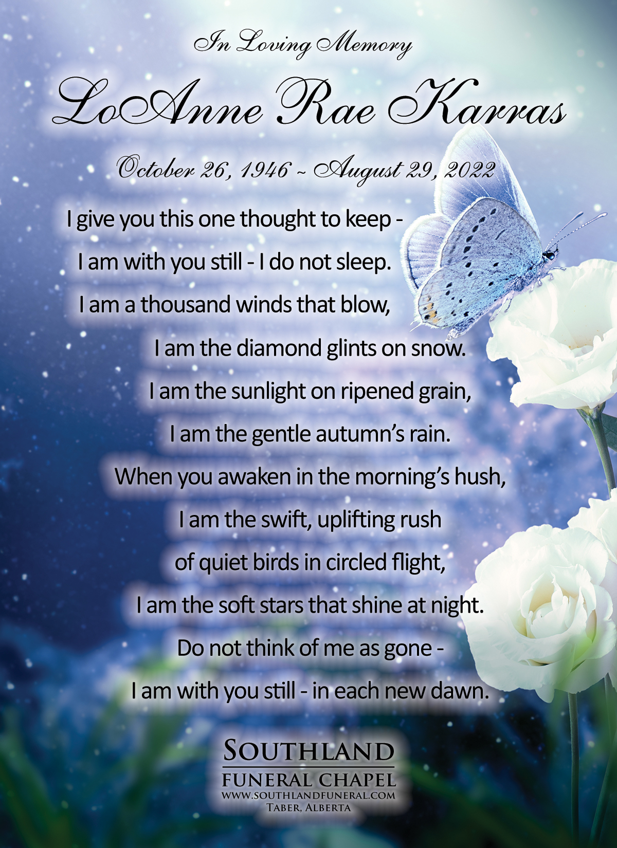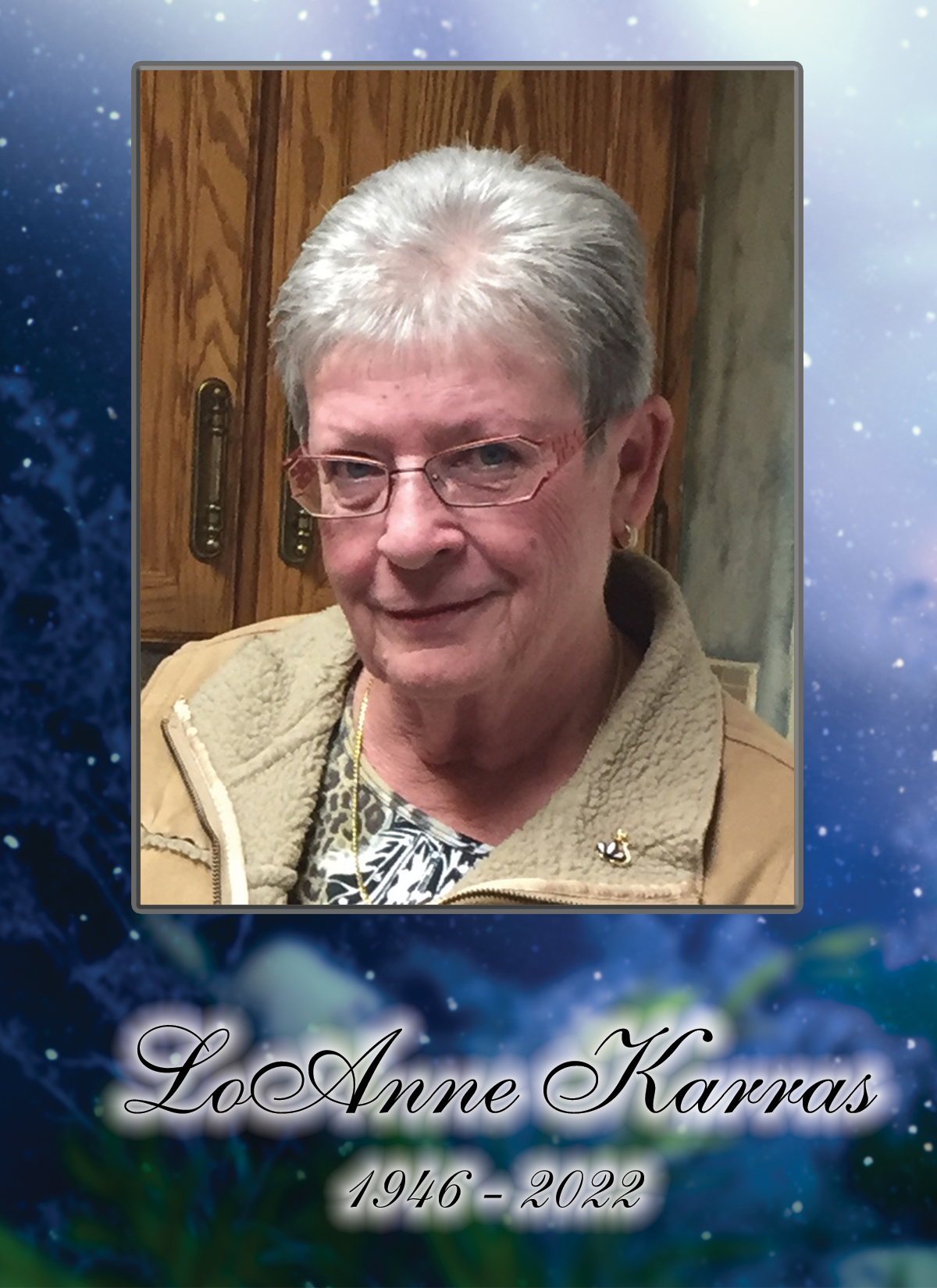 LoAnne Rae Karras, belove wife of Chuck Karras, passed away peacefully in Lethbridge, with family by her side, on Monday, August 29, 2022 at the age of 75 years.