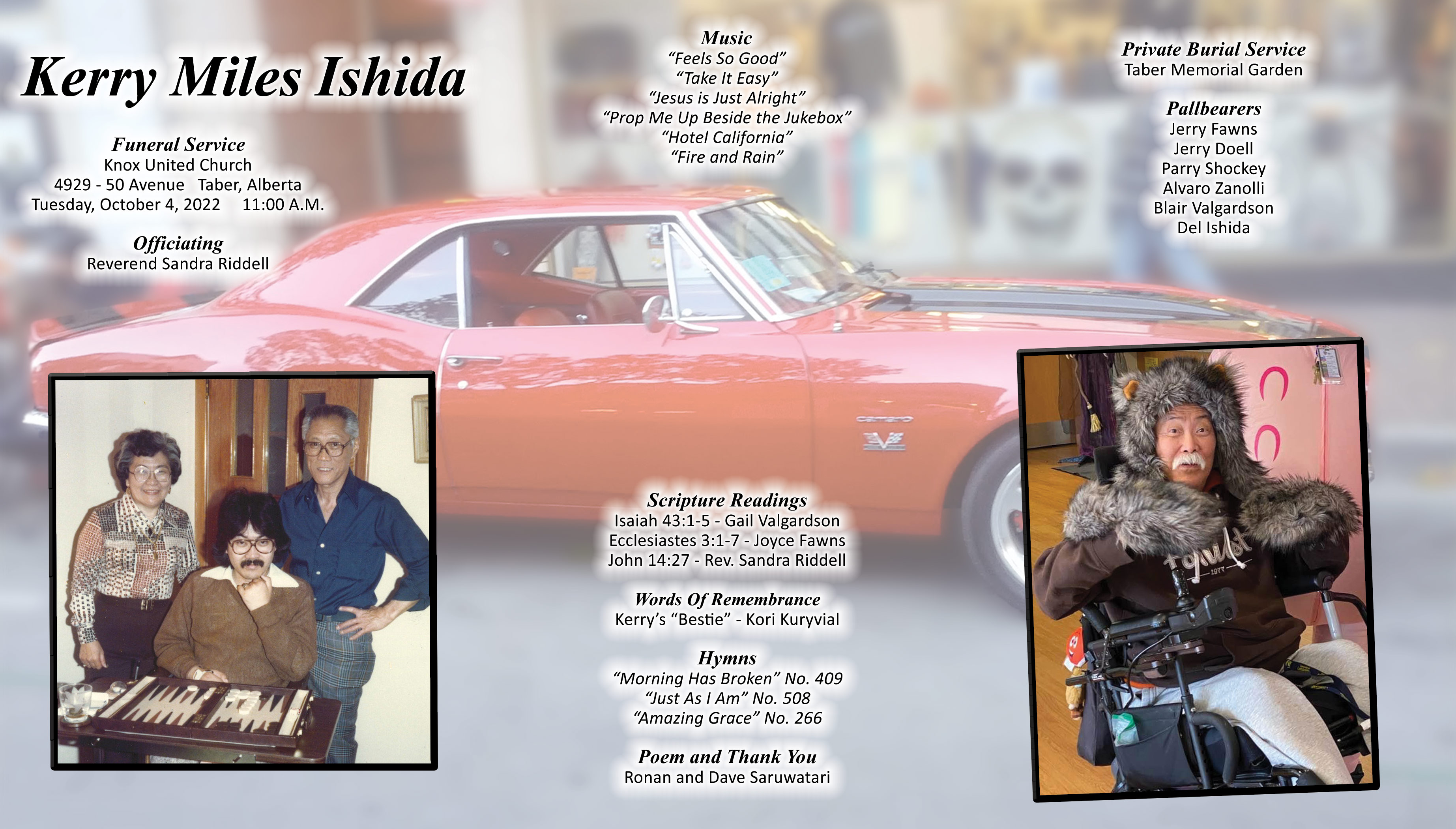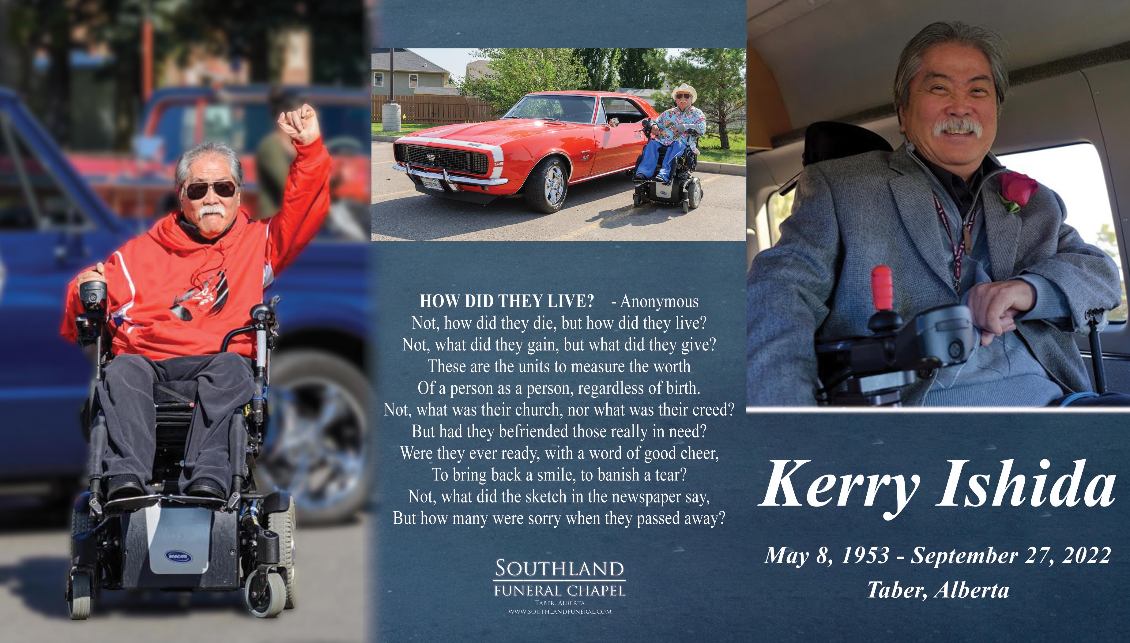 Kerry Miles Ishida, passed away peacefully in Lethbridge, the evening of Tuesday, September 27, 2022 at the age of 69 years and has joyfully reunited with his mom and dad. Kerry is free of pain and zooming around the Heavens in his vintage Camaro, cranking his 70s tunes and shouting “Let’s go Oilers!".