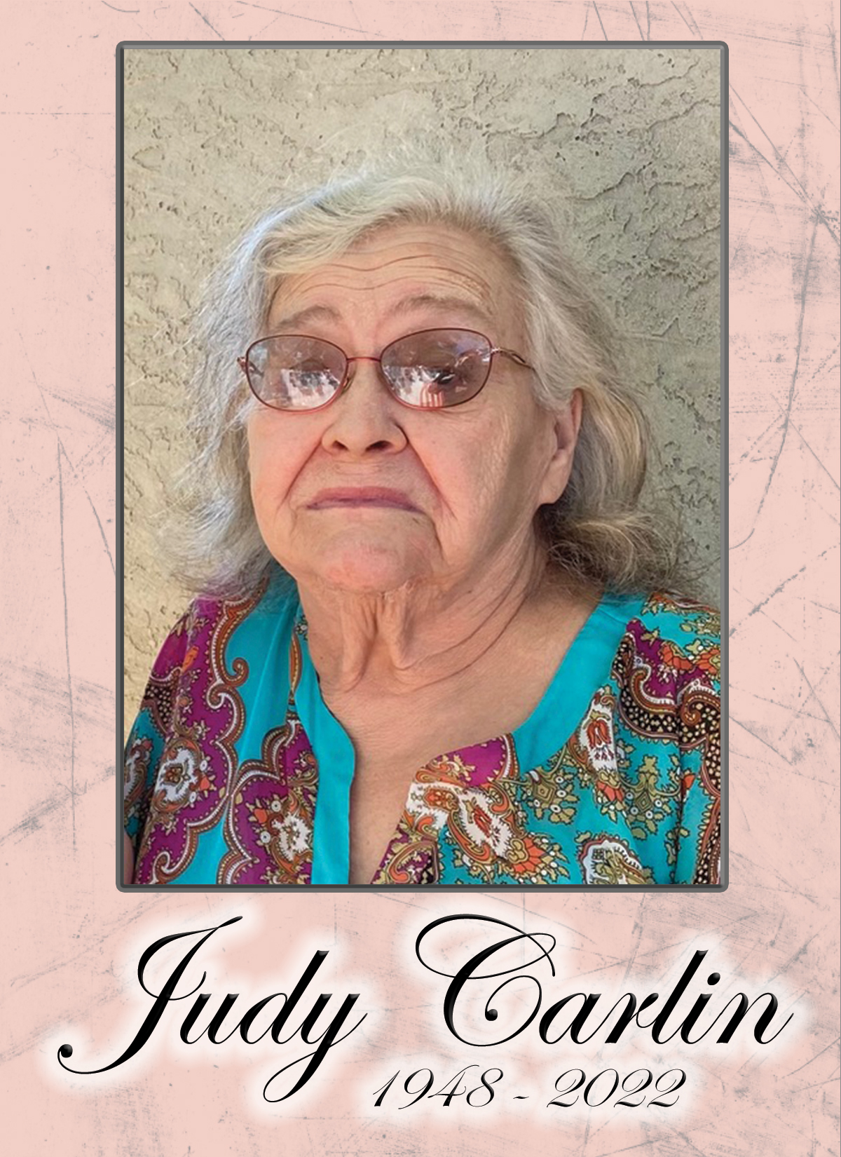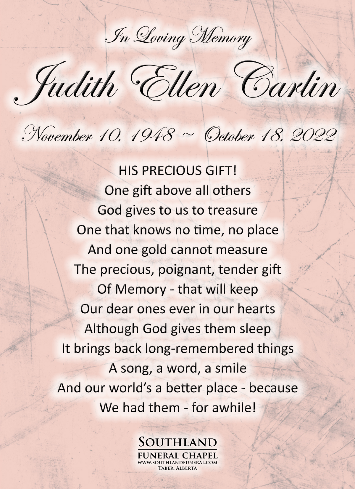 Judith Ellen Carlin (née Evans), beloved wife of the late Sergio Carlin, passed away peacefully in Taber after a long illness on Tuesday, October 18, 2022 at the age 73 years.