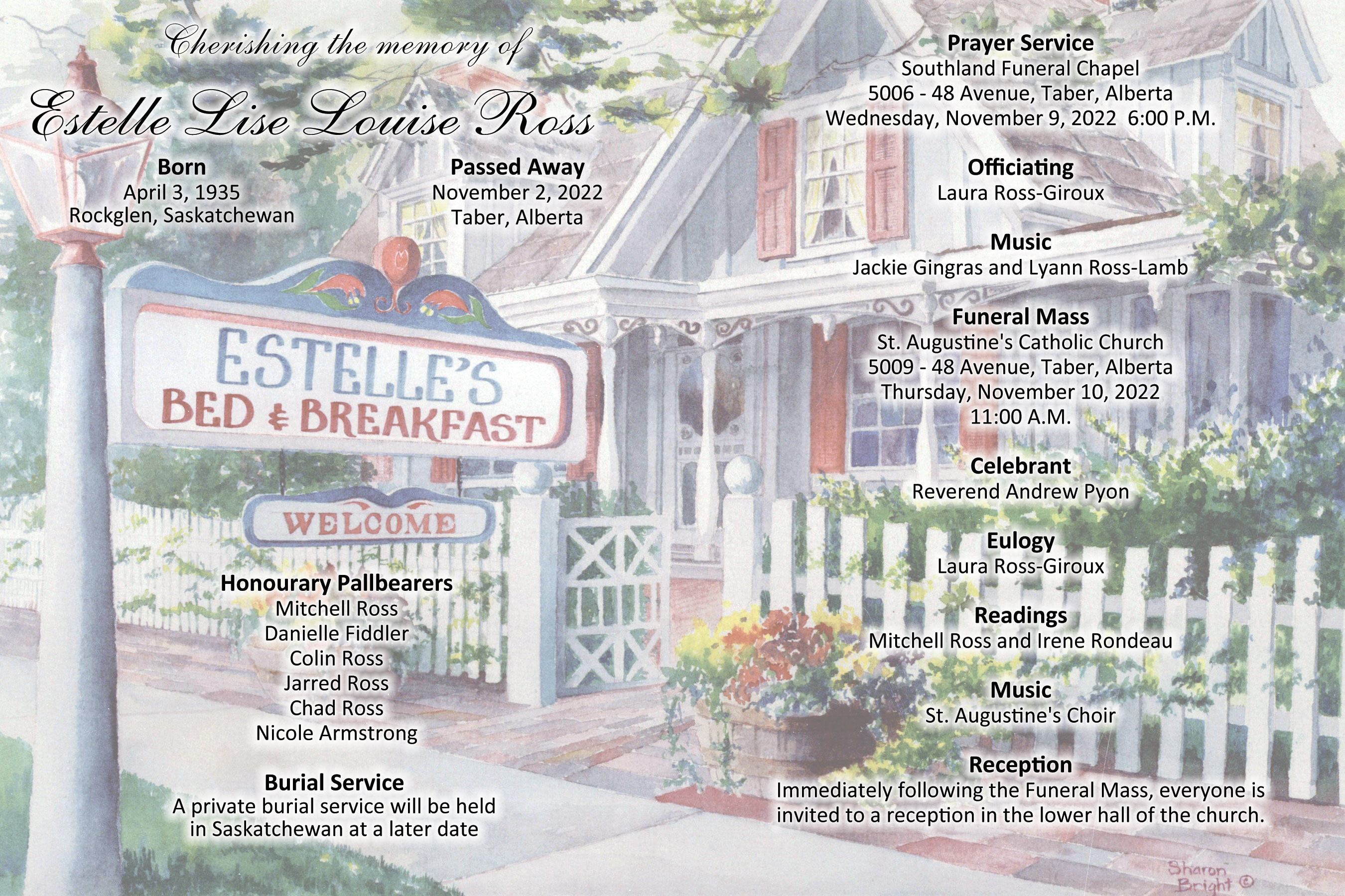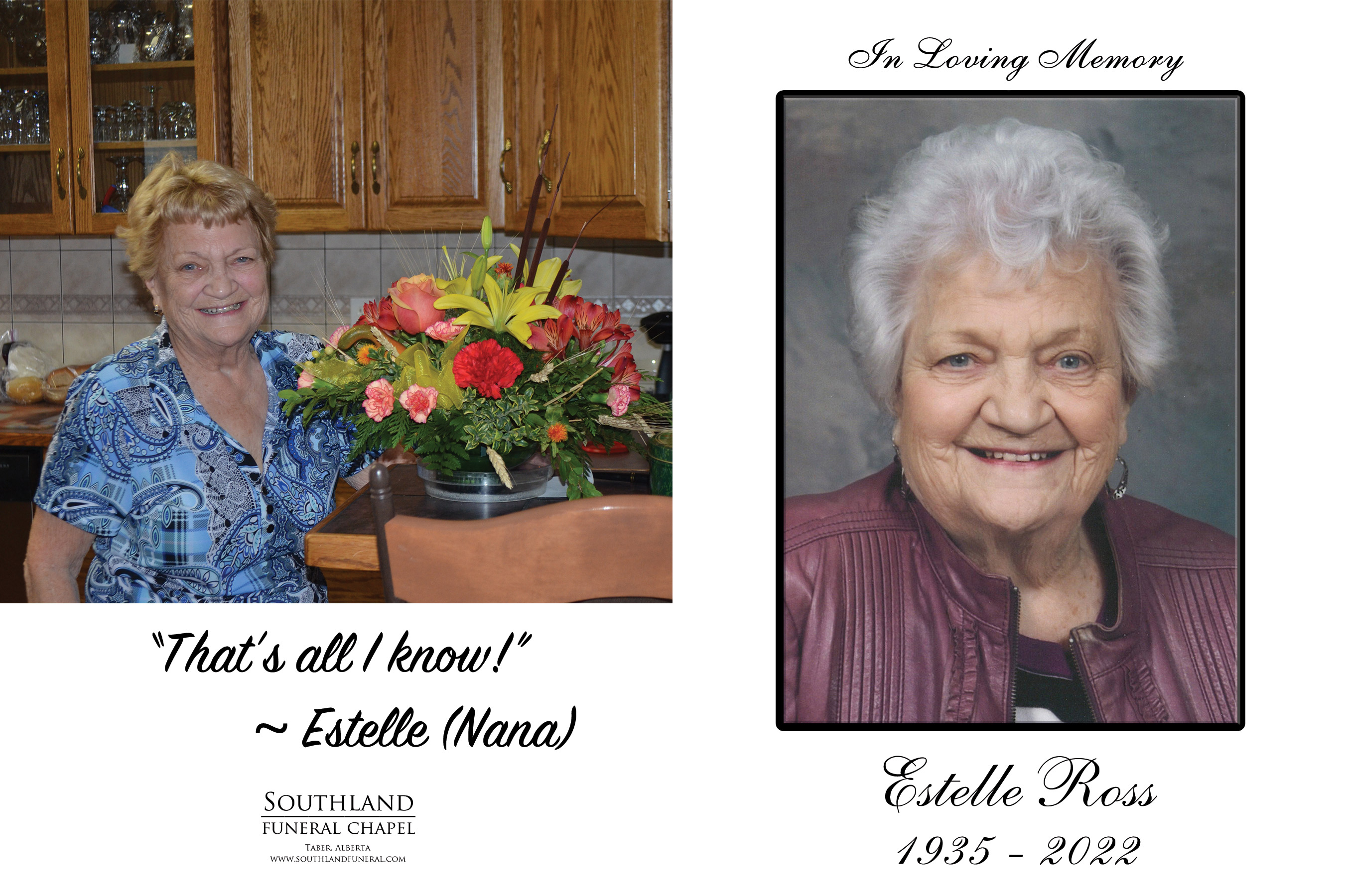 Relatives and friends were invited to Prayers at Southland Funeral Chapel, 5006 - 48 Avenue, Taber on Wednesday, November 9, 2022 at 6:00 P.M.