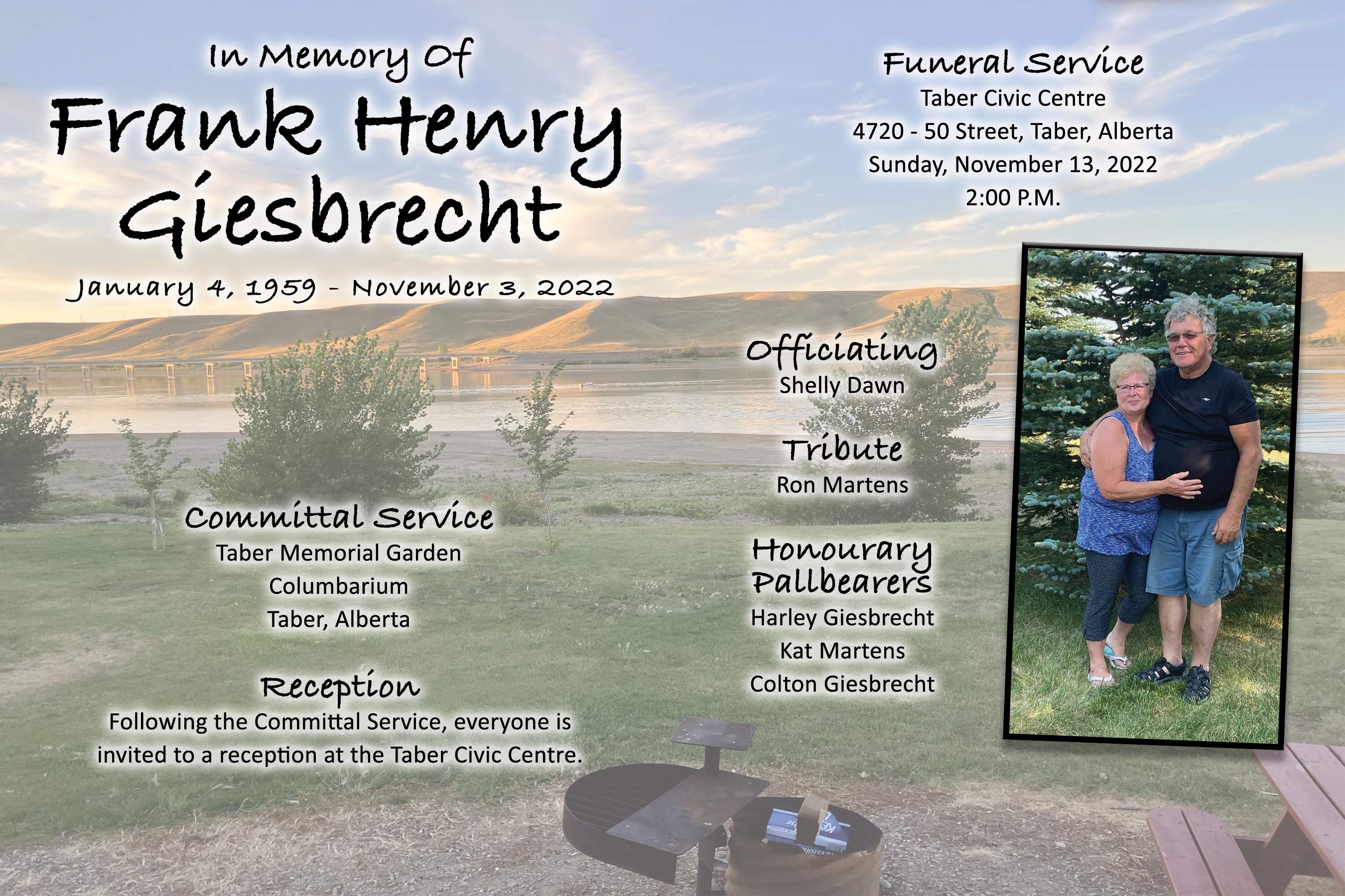 The Funeral Service was held at the Taber Civic Centre, 4720 - 50 Street, Taber on Sunday, November 13, 2022 at 2:00 P.M. with Life Celebrant Shelly Bassett officiating. A committal service followed at the Taber Memorial Garden.