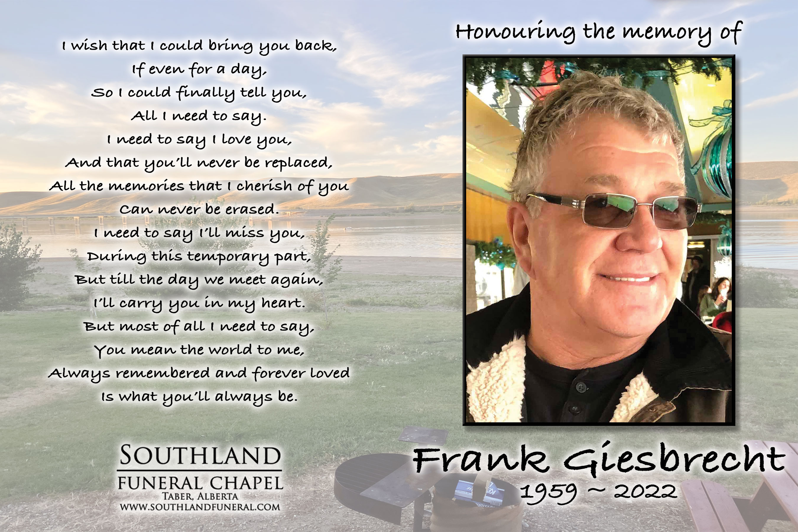Besides his loving wife Ruth, Frank is survived by their daughter Sheila (Ron) Martens of Taber and his granddaughters Harley Giesbrecht and Katarina Martens. He is also survived by his brother Merl (Carol) Giesbrecht (their son Colton); his aunt Trudy Giesbrecht; brother-in-law Bill Hutchison; sisters-in-law Jeanne (Wes) McMann, Charlotte (Harry) Stolarchuk, Norma (James) Turner, Ellen Miller, Patti (James) Mason and Raydene (Vern) Boutiler; brothers-in-law Andy Chapman, Dan (Monique) Chapman and numerous other family members.