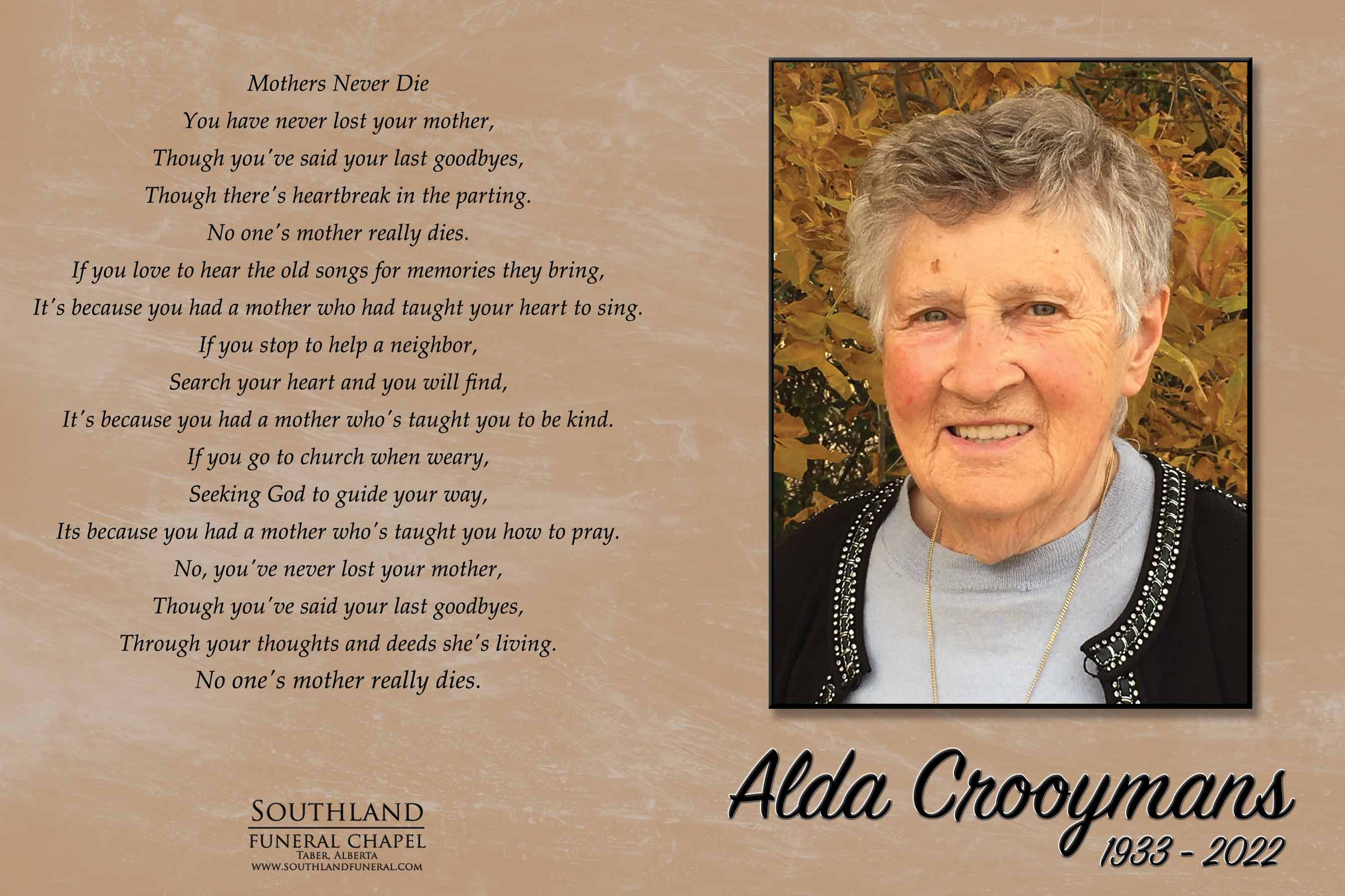Alda is survived by daughter Marylene (Philip) Van Steekelenburg of Millicent and their children Emma and Aaron; sons John (Shawna) Crooymans of Bow Island and their children Sarah, Annaliese and Anthony (Janelle); Joseph (Margriet) Crooymans of Bow Island and their children Brennan (Lauren) great granddaughter Evelyn, Caytlin (Jordan), Morgan and Nathan; Andrew Crooymans and his children Andrea, Jessica, Mattias and Kyle. She is also survived by four sisters, three brothers, several sisters-in-law and numerous nieces and nephews.