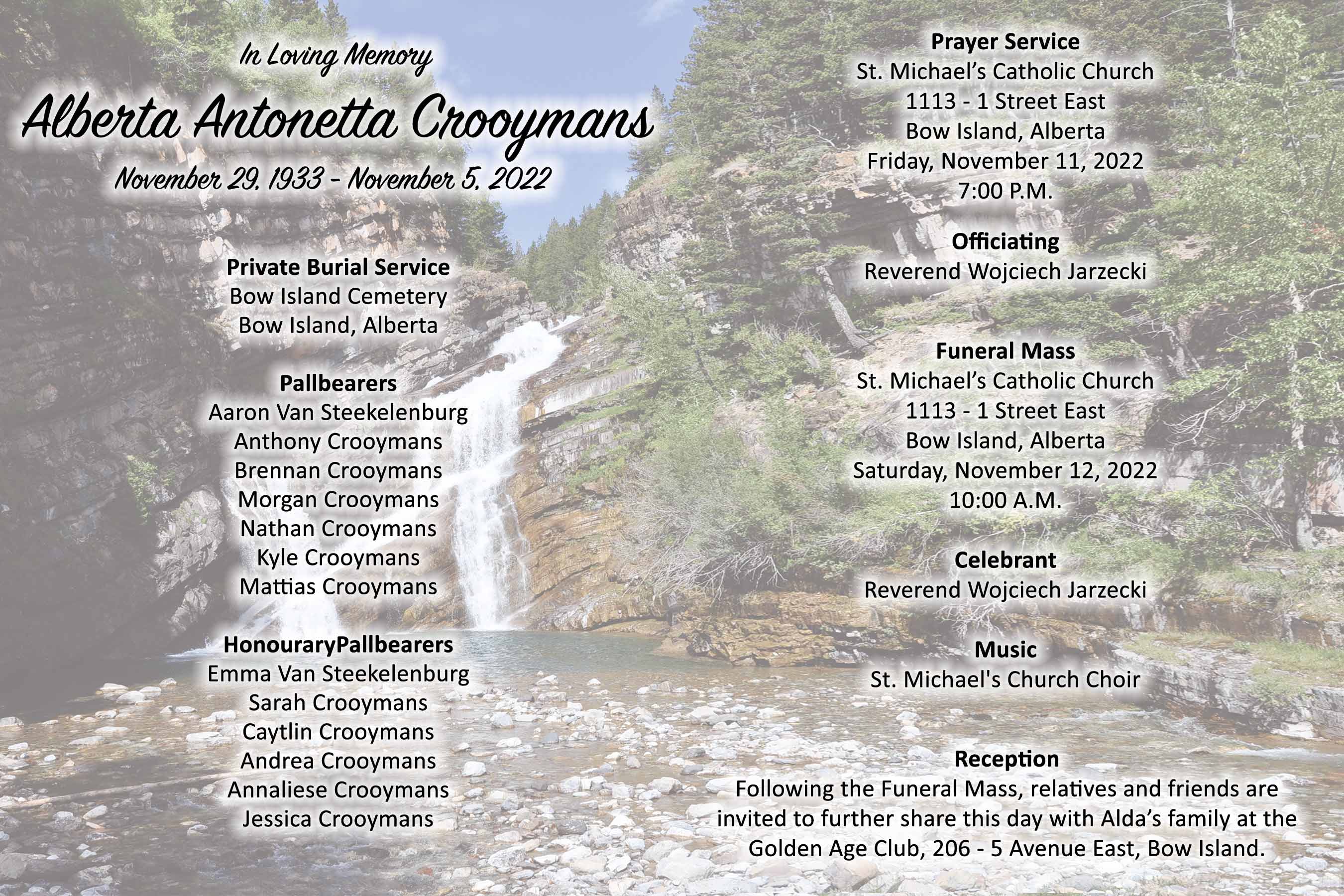 Relatives and friends were invited to Prayers at St. Michael's Catholic Church, 1113 - 1 Street East, Bow Island on Friday, November 11, 2022 at 7:00 P.M.