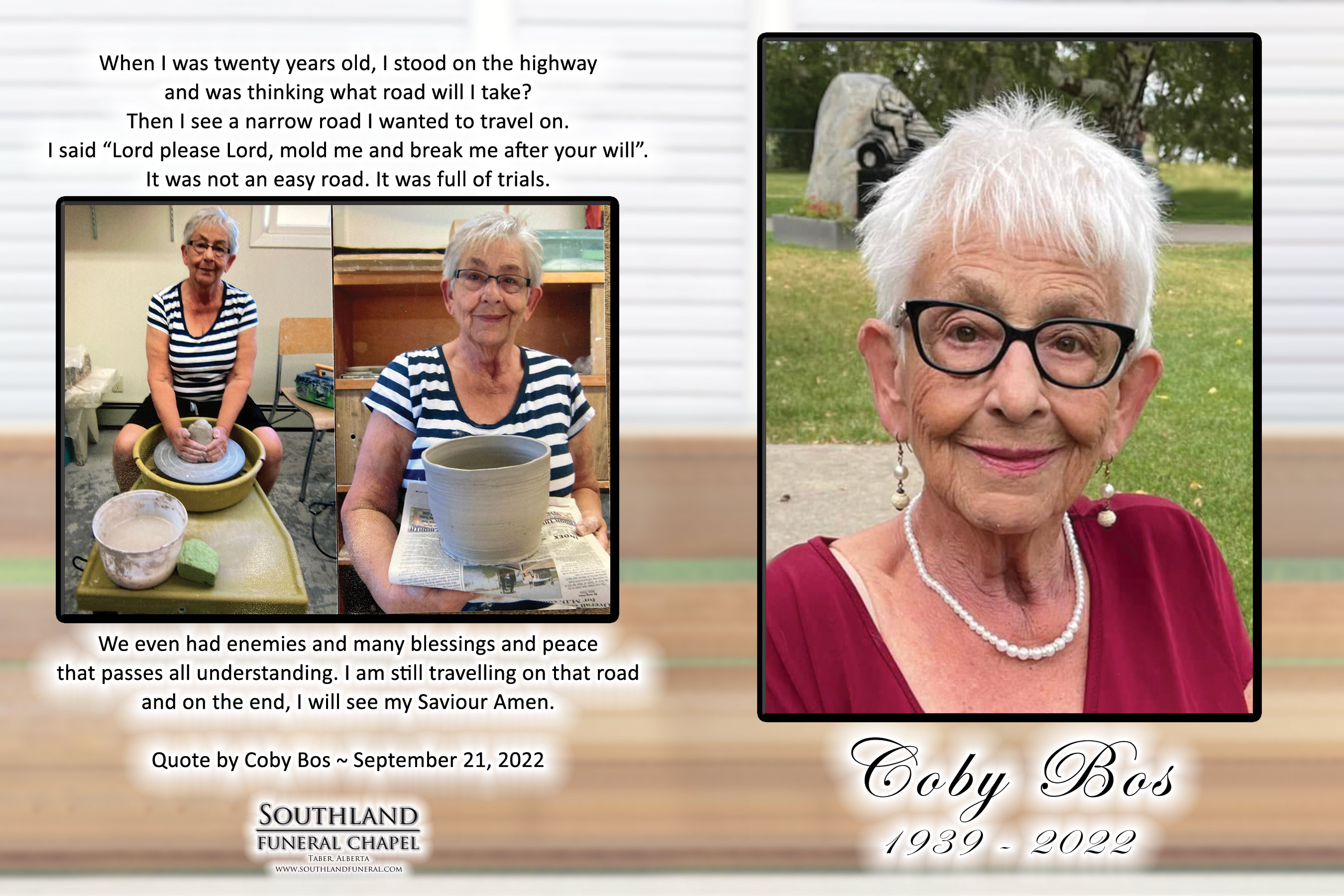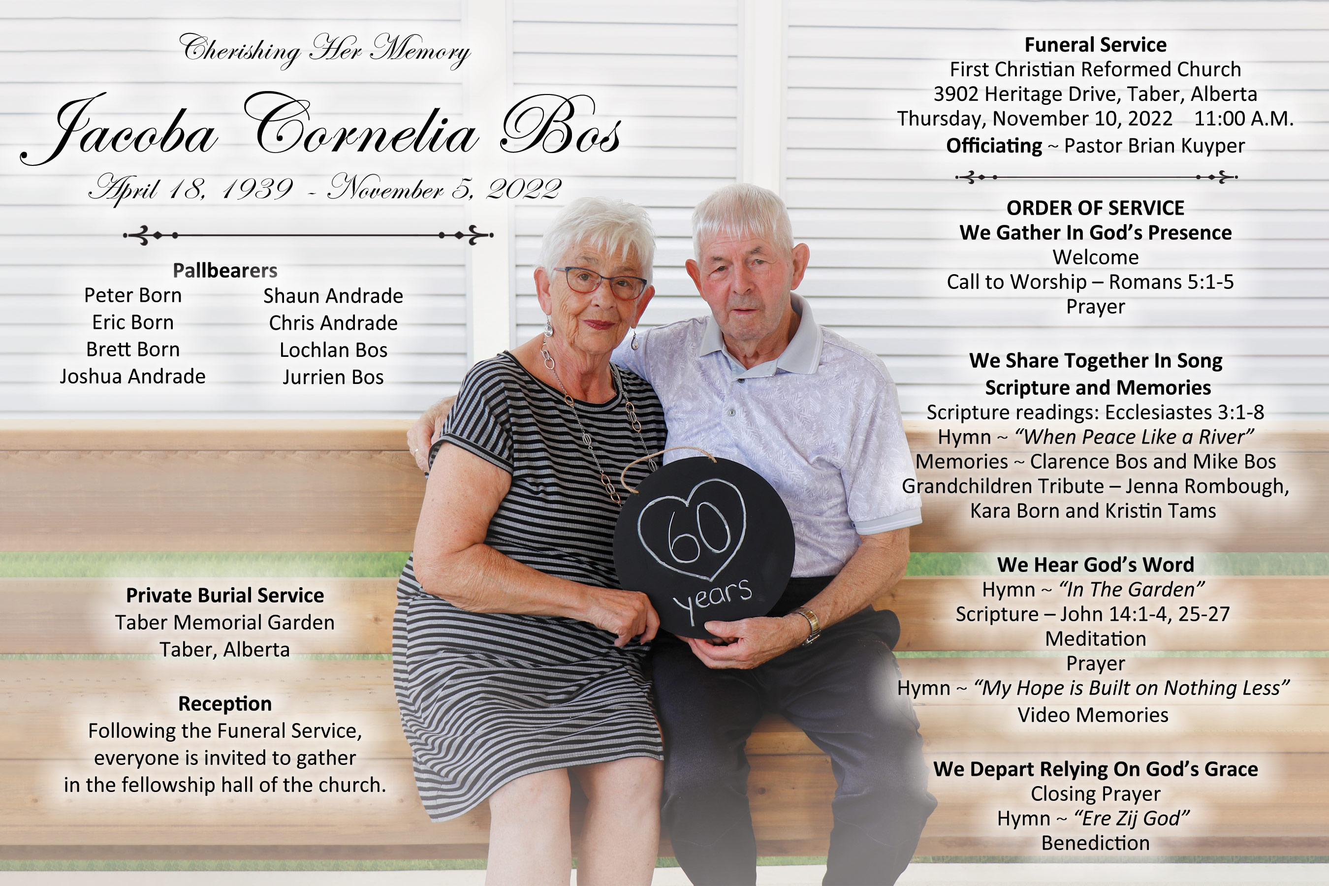 The Funeral Service was held at the First Christian Reformed Church, 3902 Heritage Drive, Taber on Thursday, November 10, 2022 at 11:00 A.M.