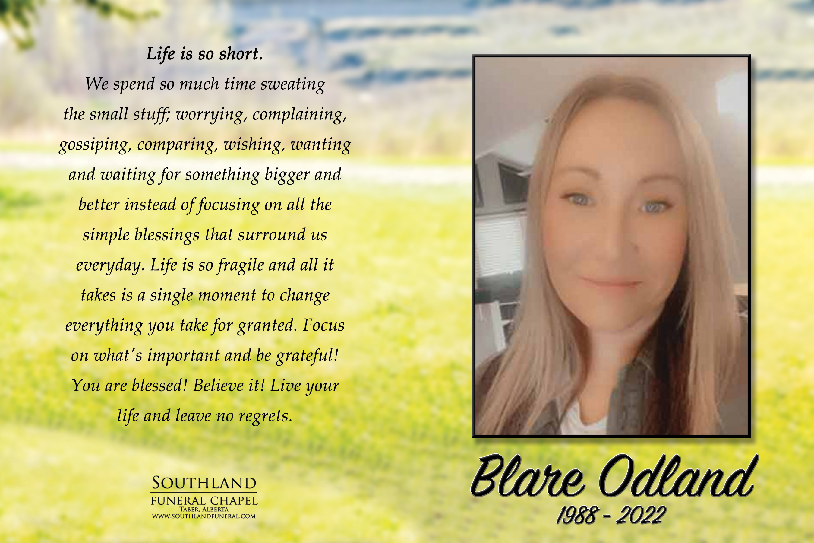 Blare Jeanette Odland, beloved mother of Zoey and Bradie, passed away in Lethbridge on Friday, November 25, 2022 at the age of 34 years.