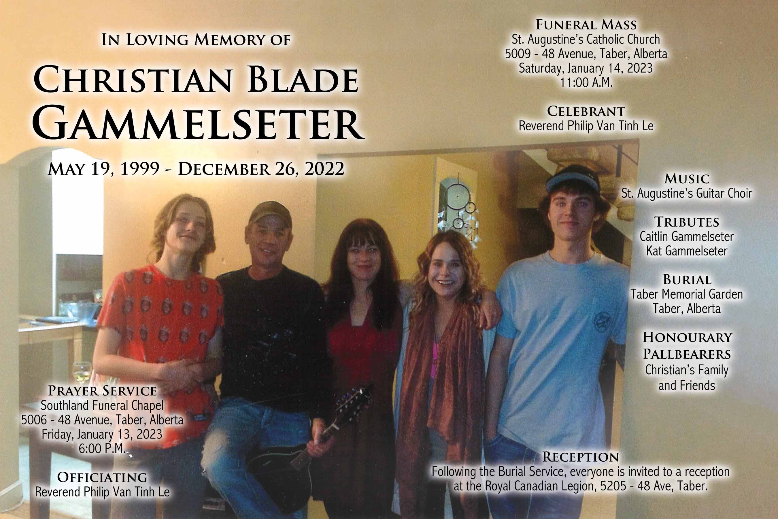 Christian Blade Gammelseter, beloved son of the late Alanna Sharratt-Joblonkay, passed away unexpectedly in Surrey, British Columbia on Monday, December 26, 2022 at the age of 23 years.