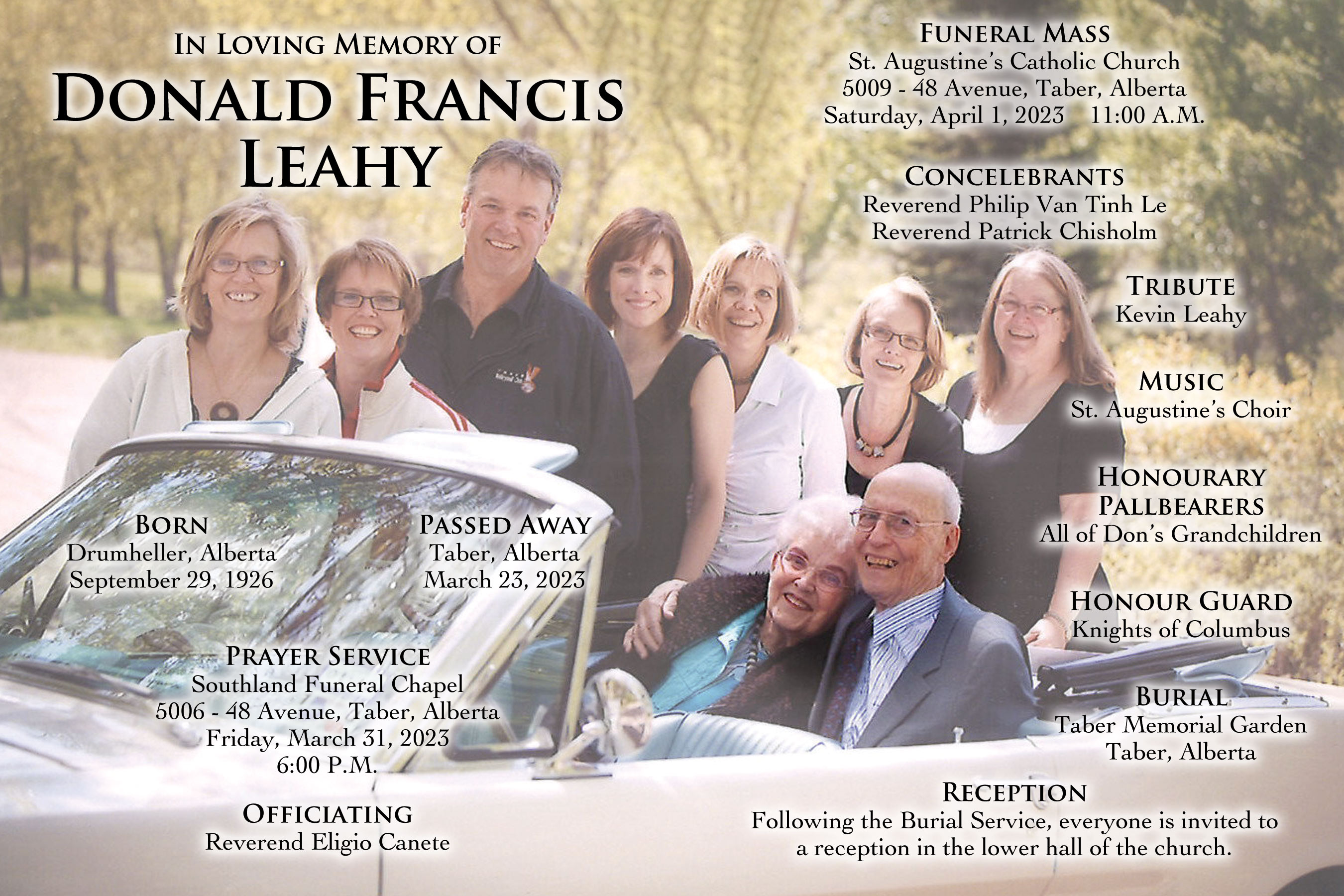 The Funeral Mass was celebrated at St. Augustine's Catholic Church, 5009 - 48 Avenue, Taber on Saturday, April 1, 2023 at 11:00 A.M. Burial followed at the Taber Memorial Garden.
