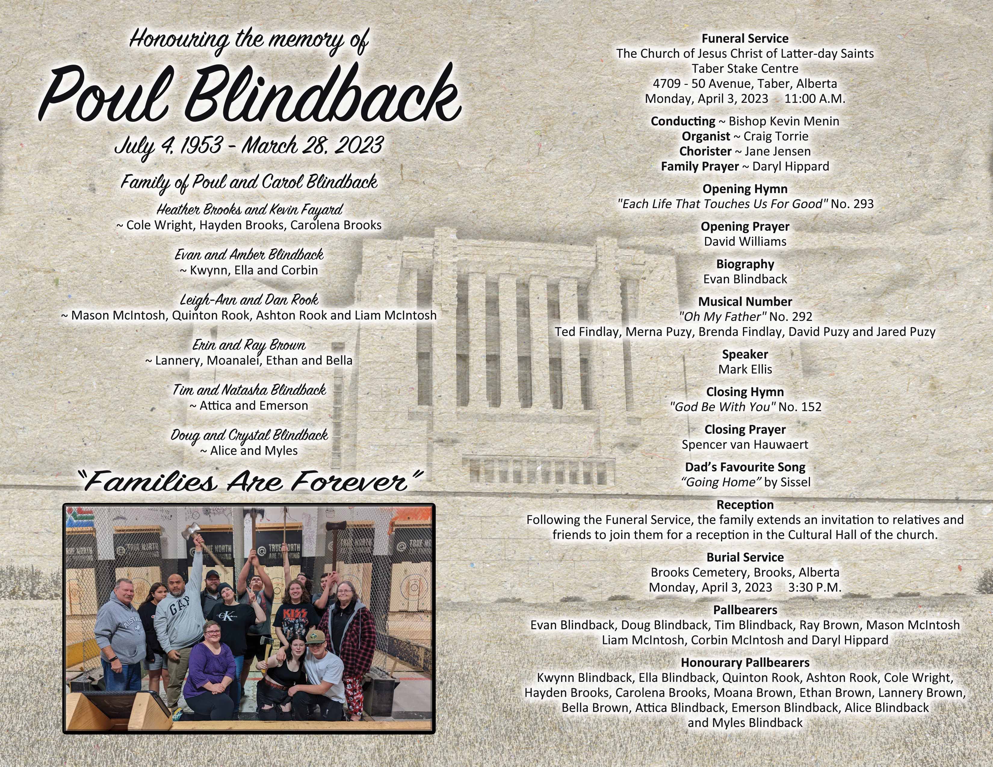 Besides Carol (nee Wright), his loving wife of forty seven years, Poul will be deeply missed by their children Evan (Amber) Blindback of Taber, Tim (Natasha) Blindback of North Bay, Ontario, Doug (Crystal) Blindback of Taber, Heather Brooks (Kevin) of New Orleans, Leigh-ann (Dan) Rook of Shaughnessy and Erin (Ray) Brown of Australia. He was a proud grandfather to eighteen grandchildren Cole, Hayden, Carolena, Kwynn, Ella, Corbin, Mason, Liam, Quinton, Ashton, Lannery, Moana, Ethan, Isabella, Attica, Emerson, Alice and Myles. He is also survived by his sister Kim Blindback.