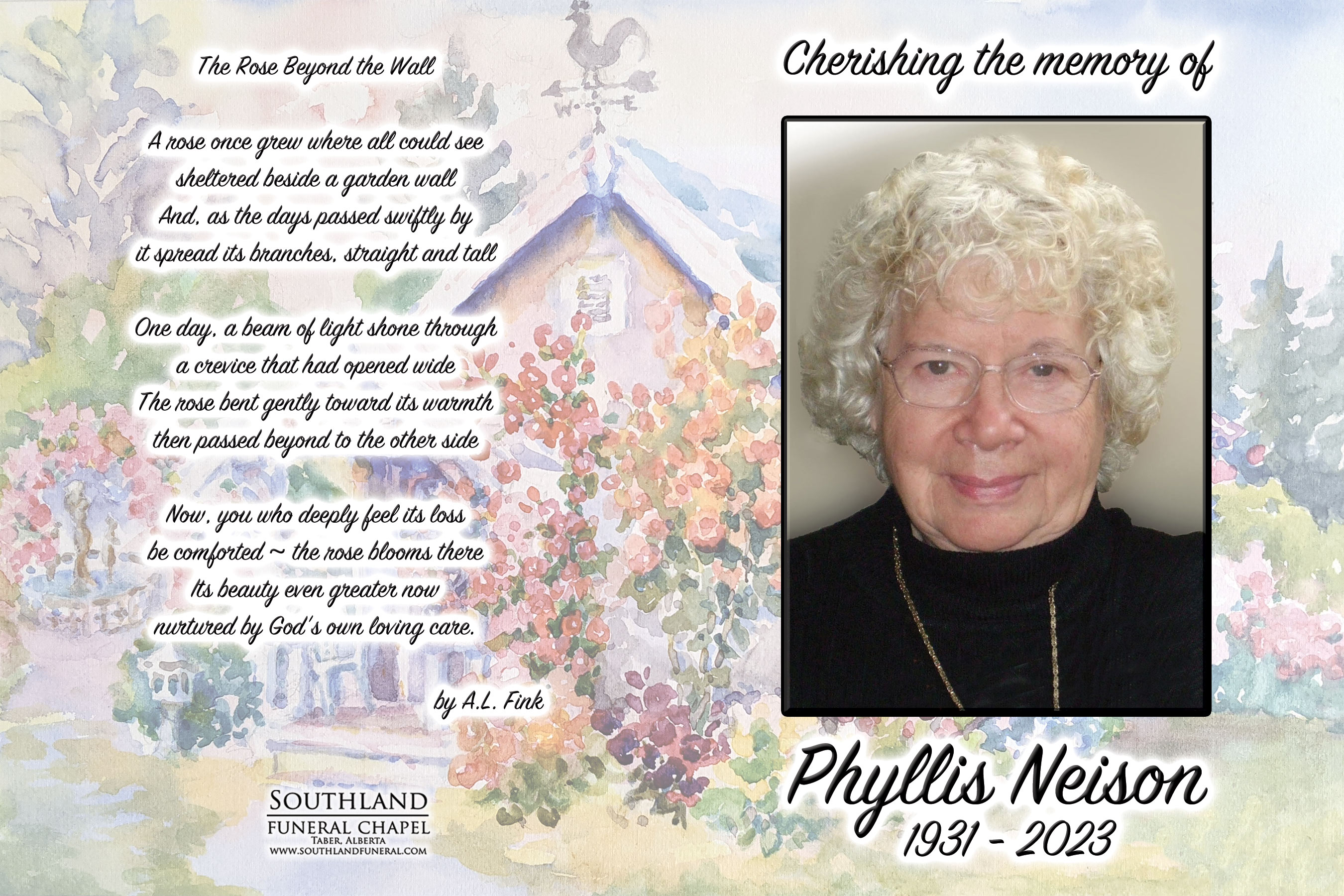 Phyllis Elizabeth Neison (nee Danforth), beloved wife of Alexander Neison, passed away peacefully at the Cairnsmore Place Long-term Care facility in Duncan, British Columbia on Friday, April 7, 2023 at the age of 91 years.