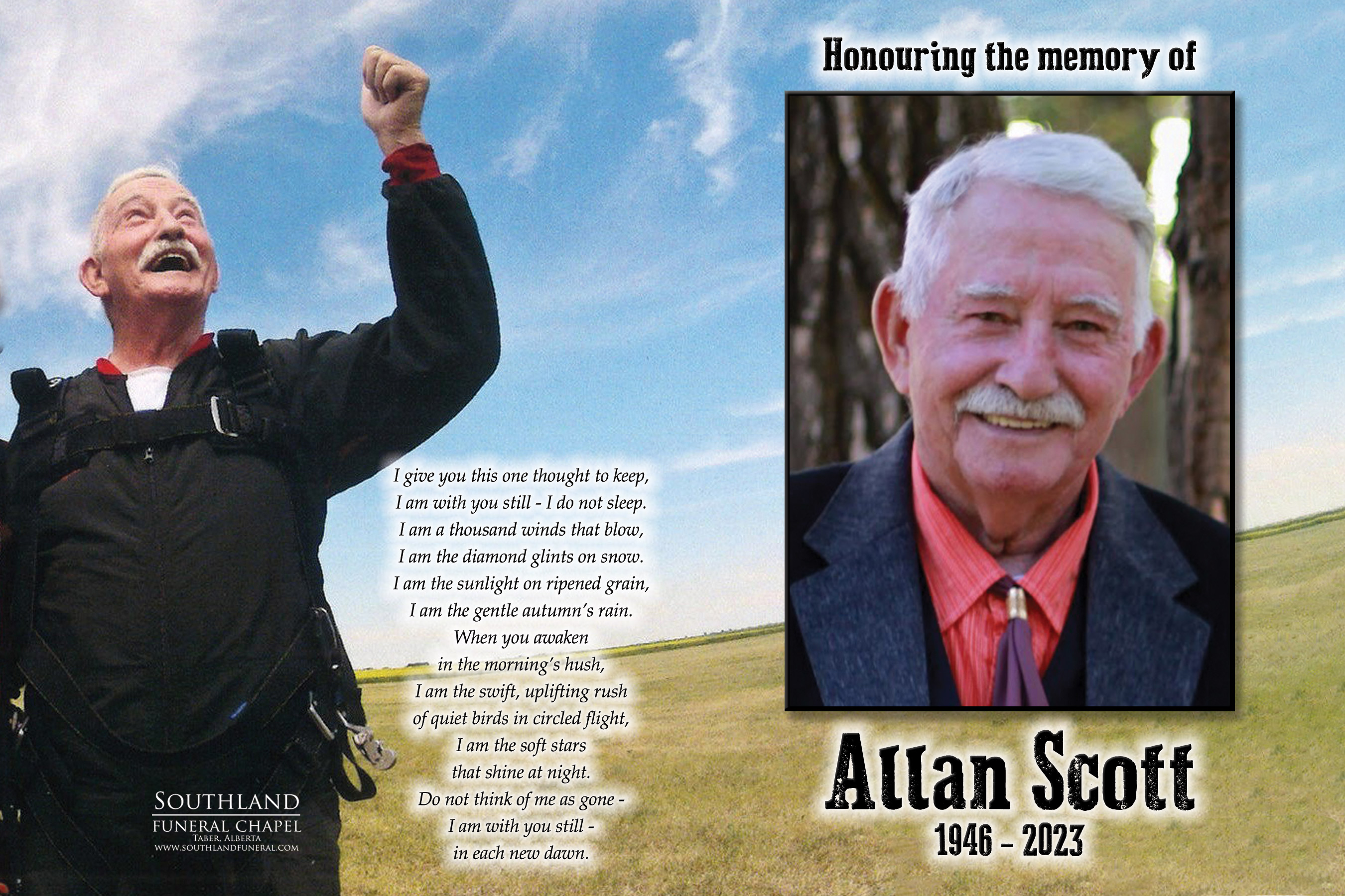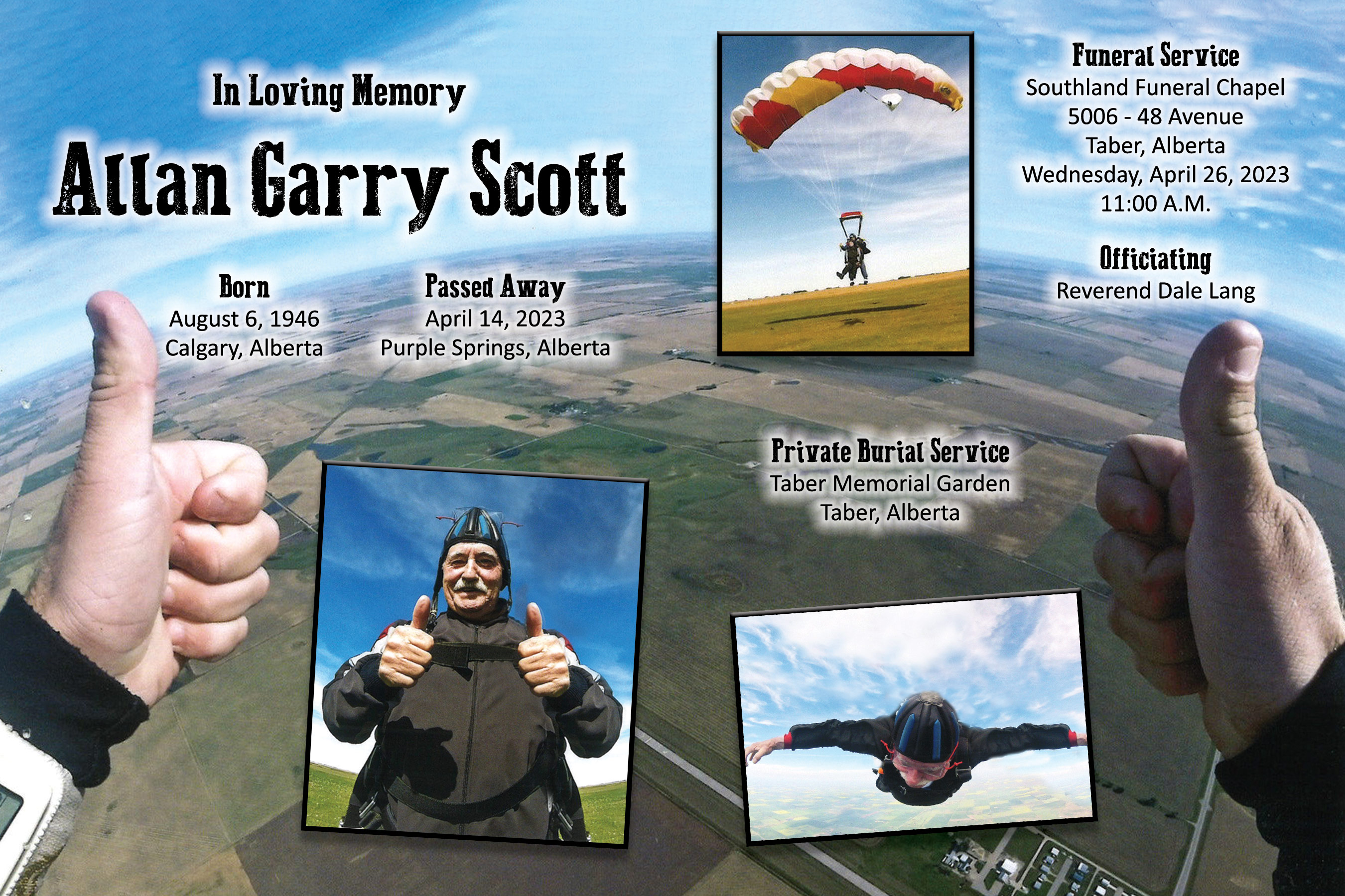 Allan enjoyed the fact that he was able to fulfill a lifelong dream of going skydiving in recent years. He also loved his time volunteering with the Taber Ag Society and the Wildrose Mounted Shooters.