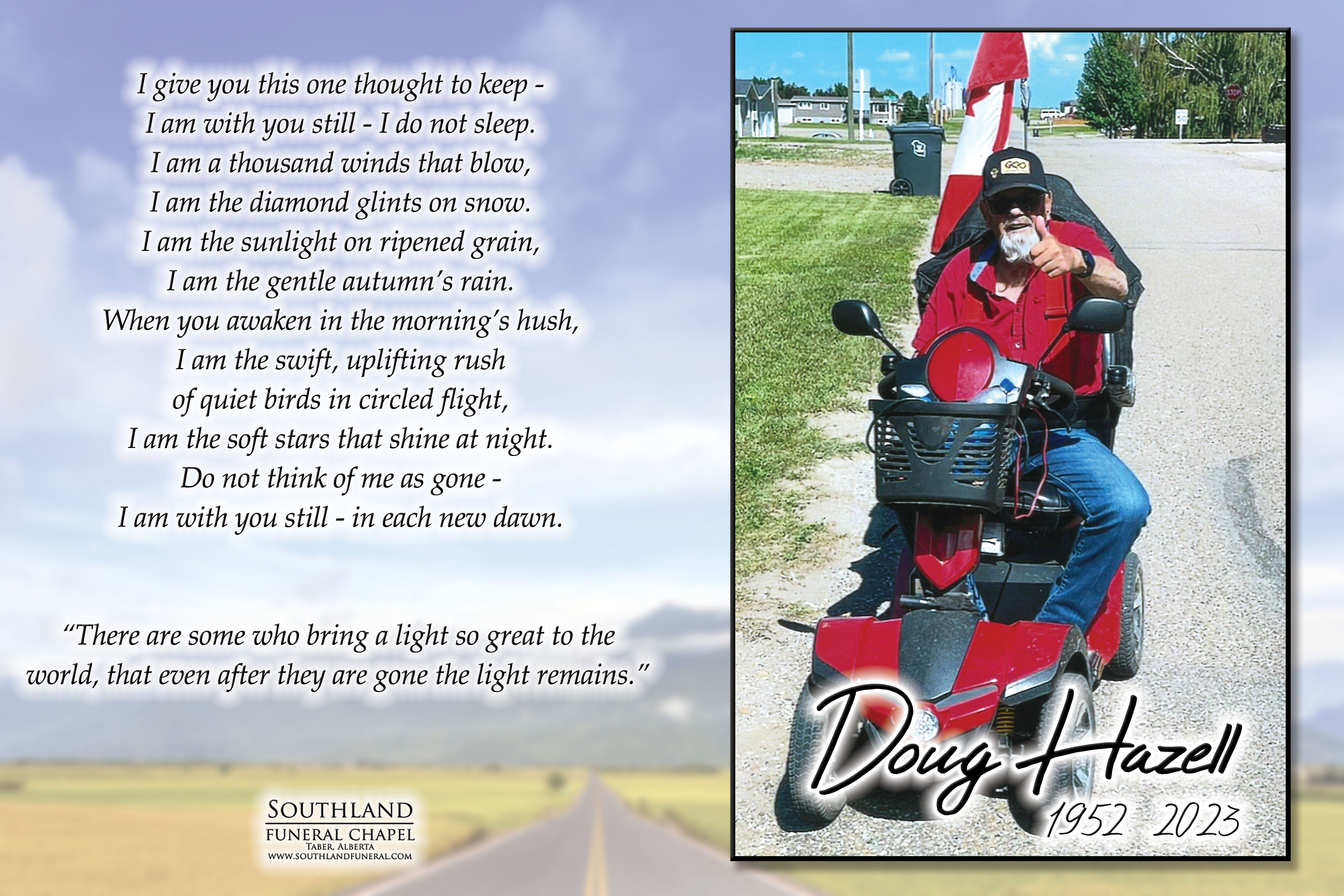 Doug was welcomed into this world in Taber on May 22, 1952, the second child of four born to Curtis and Arliene Hazell. Throughout his life, Doug had a love for motorbikes. As he progressed to his later years, you could often see him motoring down the highway with his scooter, always with a big wave and a healthy smile. On December 30, 2011 Doug married his best friend and soulmate Mary Vermillion. Together they lived in Grassy Lake in a house filled with love and laughter with their pets Boo Boo, Maggie, Prince and Bentley.