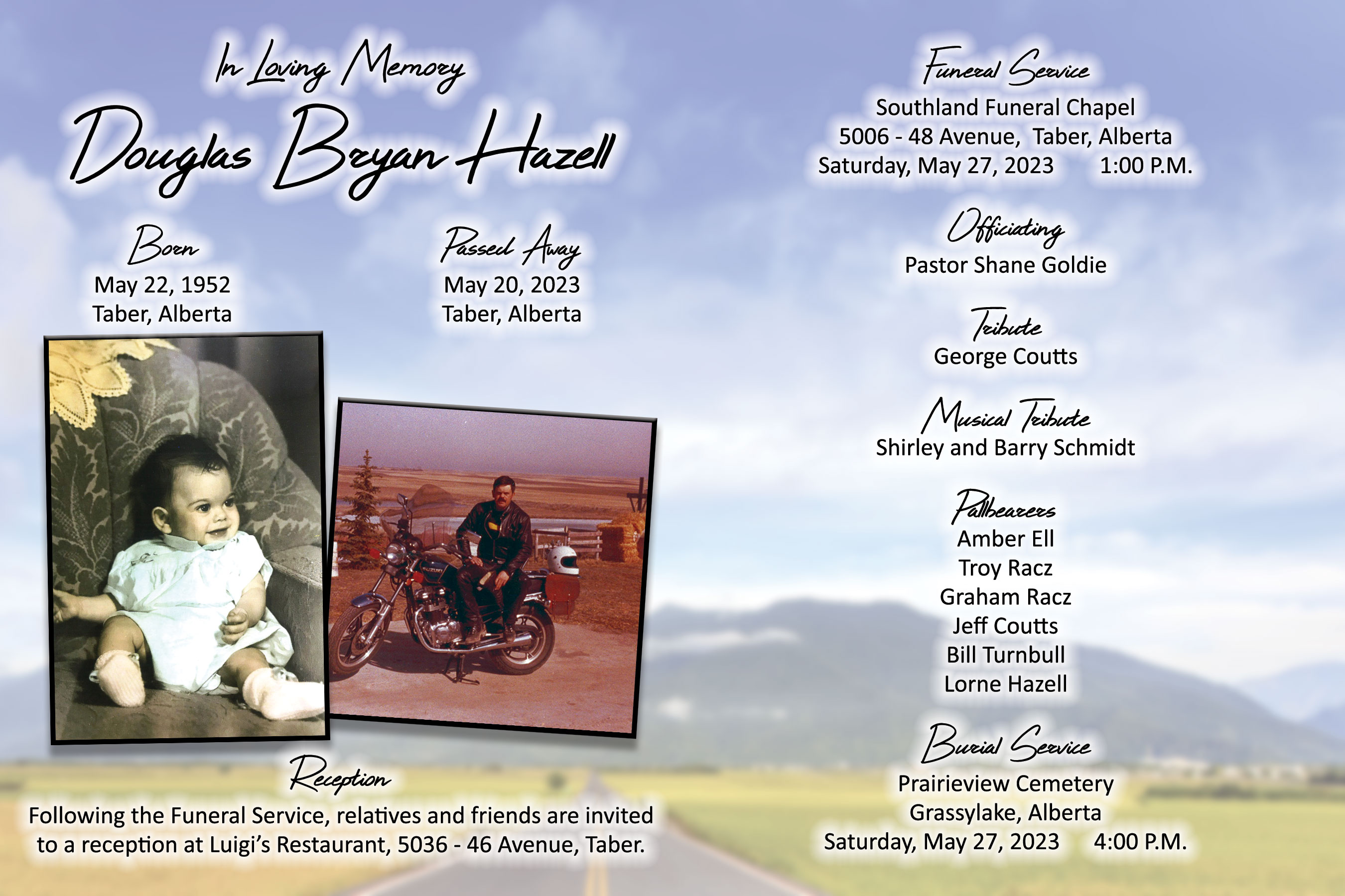 It is with deep sorrow, heavy hearts and love that we announce the passing of Douglas Bryan Hazell, beloved husband of Mary Hazell. Doug passed away peacefully in Taber on Saturday, May 20, 2023 at the age of 70 years.