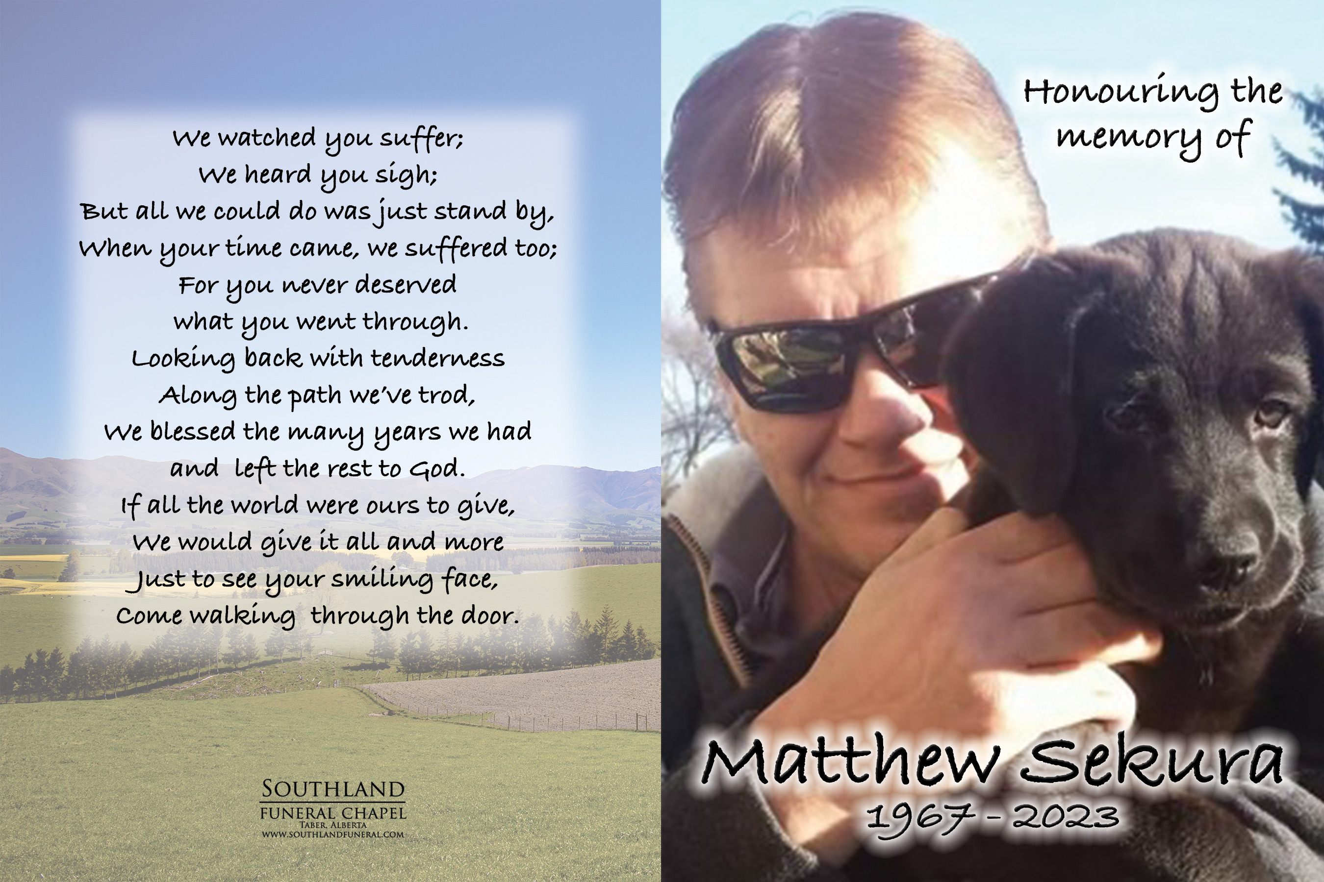 Relatives and friends were invited to meet with the family at Southland Funeral Chapel, 5006 - 48 Avenue, Taber on Friday, June 23, 2023 between 10:00 A.M. and 10:45 A.M.