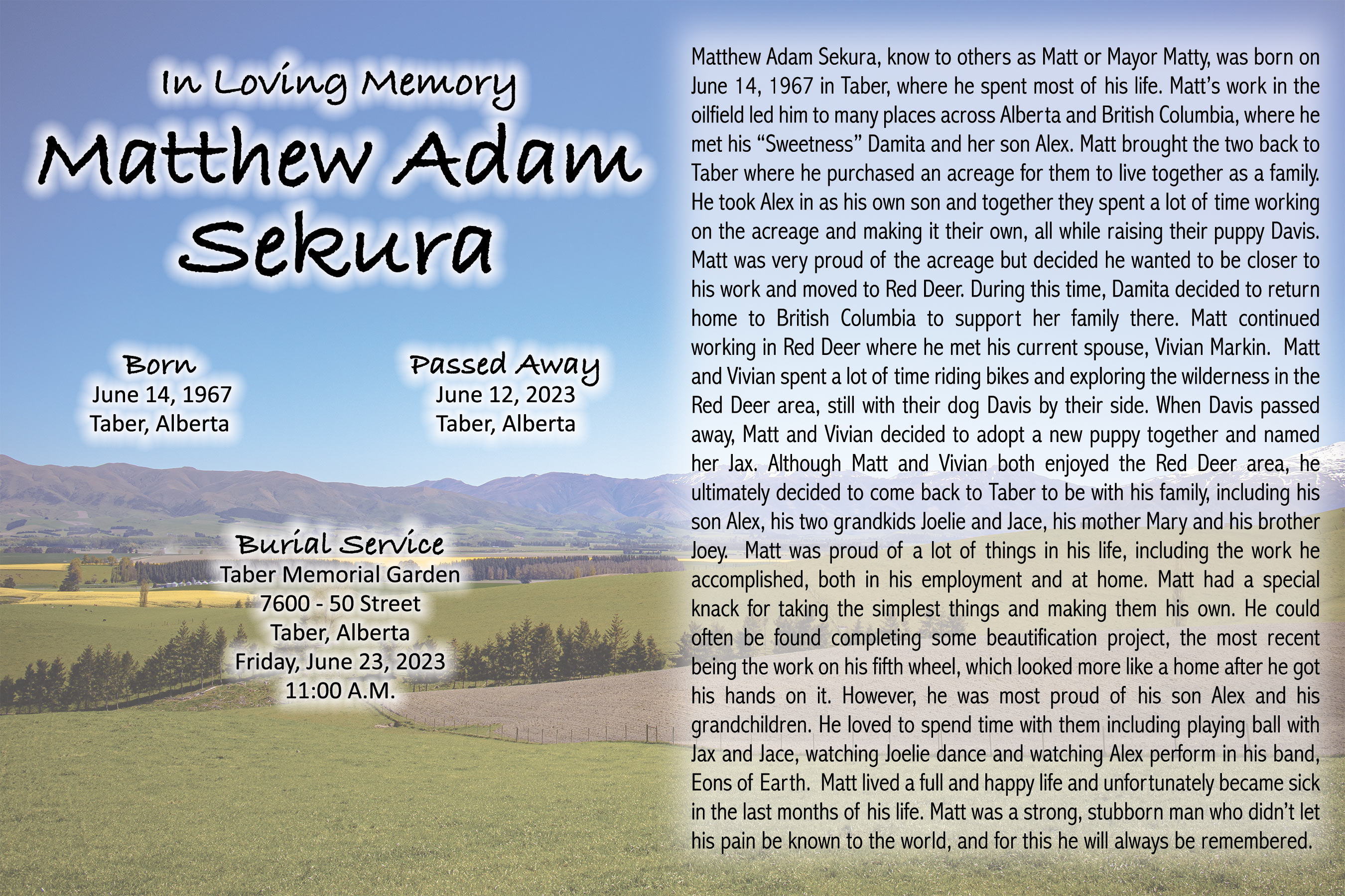 The Burial Service was held at the Taber Memorial Garden, 7600 - 50 Street, Taber on Friday, June 23, 2023 at 11:00 A.M.