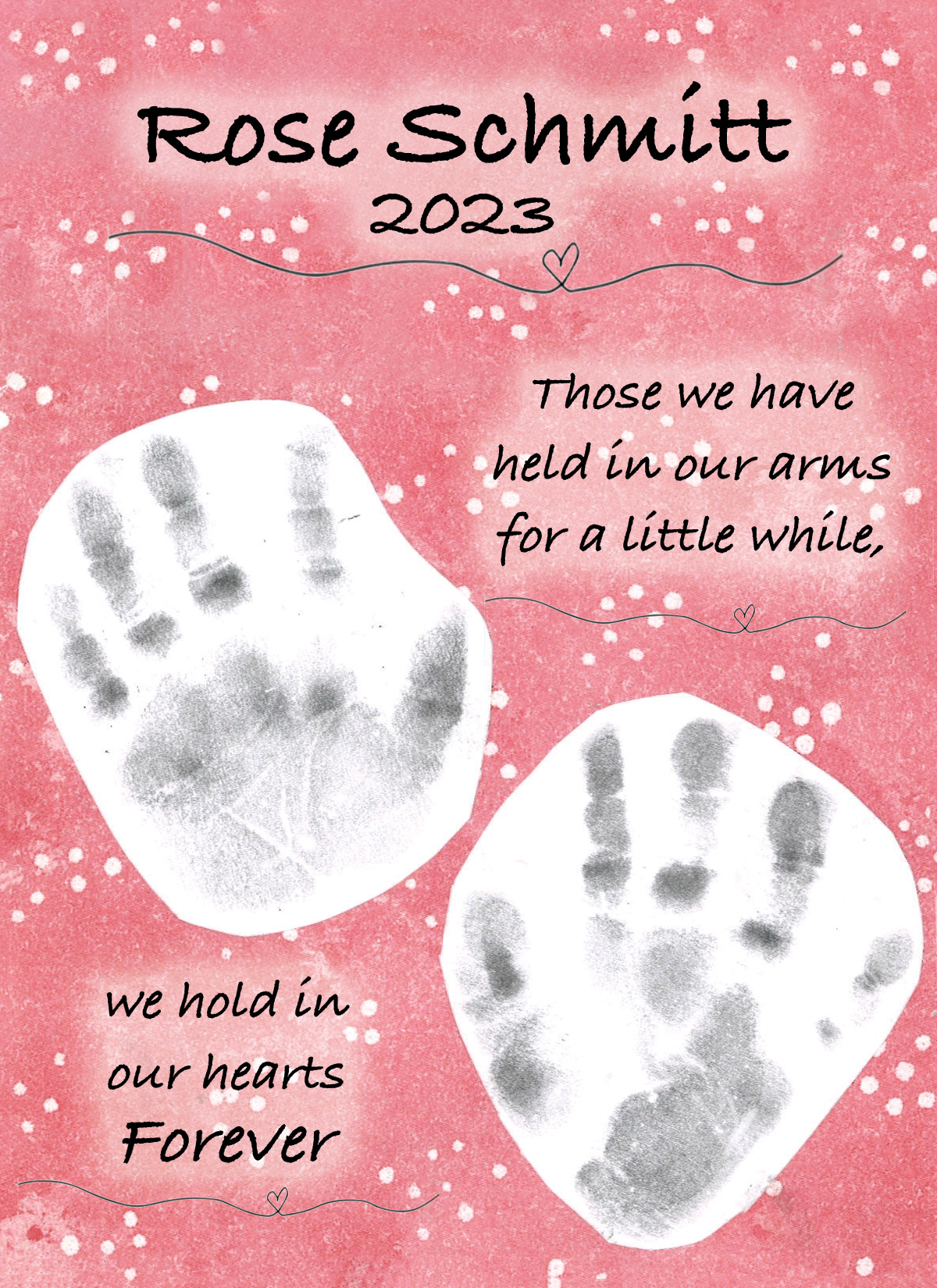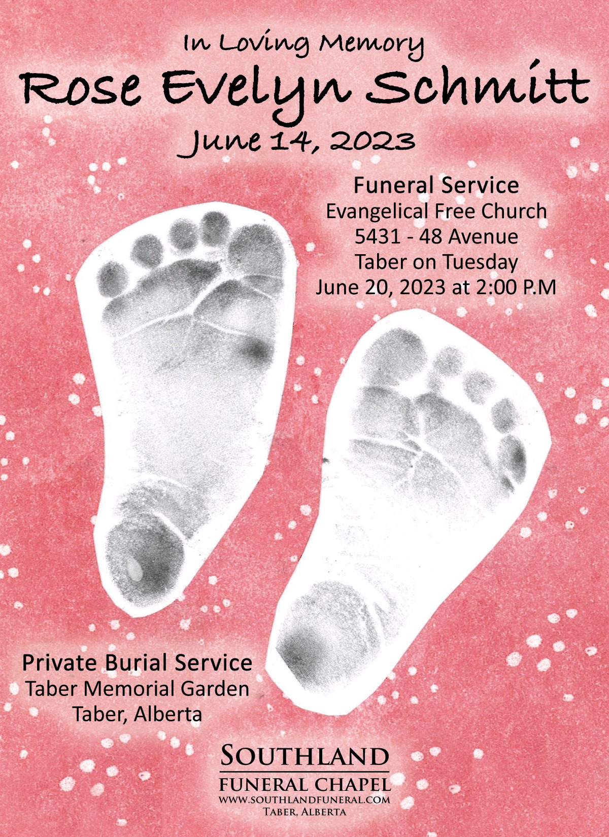 Rose Evelyn Schmitt, beloved infant daughter of Jake and Mary Schmitt, passed away in Lethbridge on Wednesday, June 14, 2023.