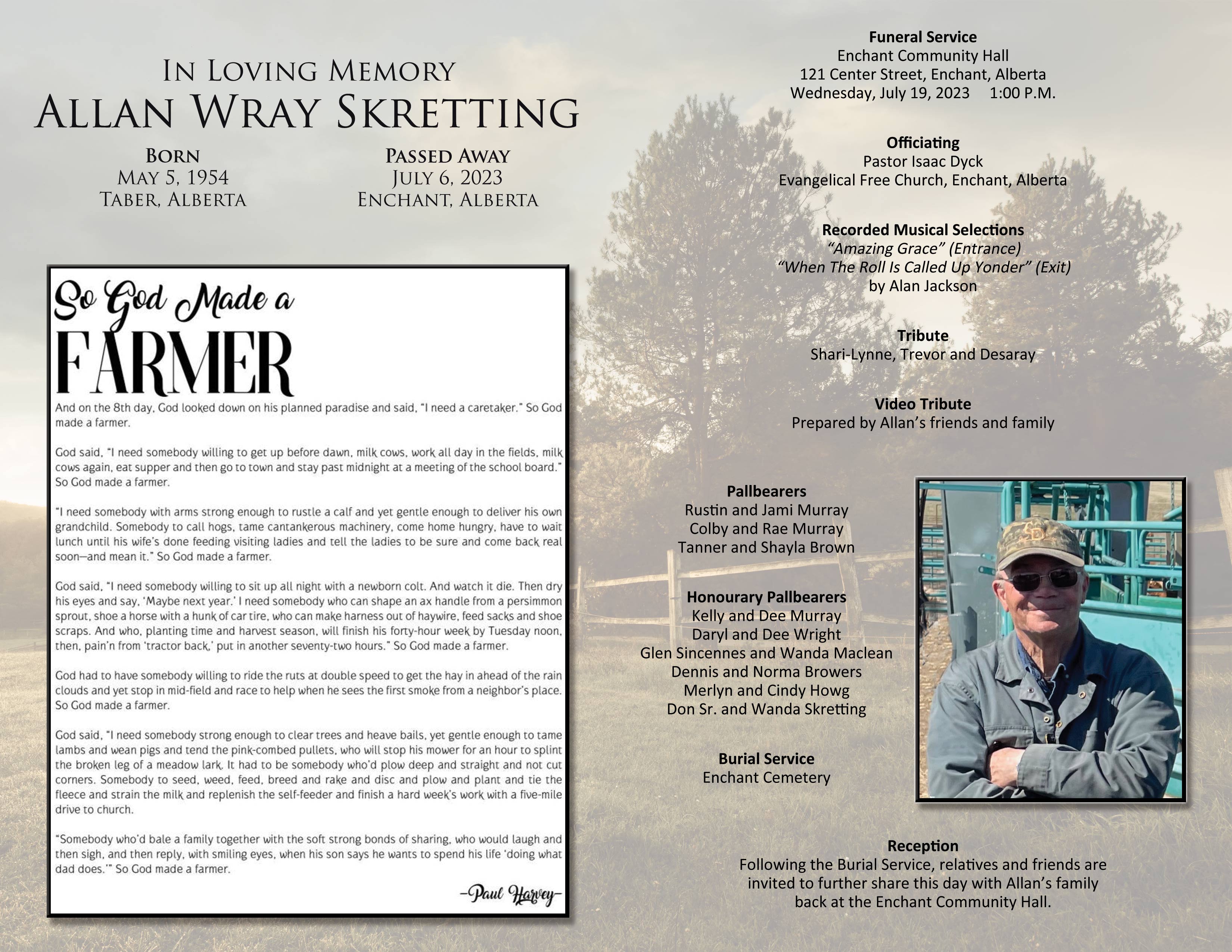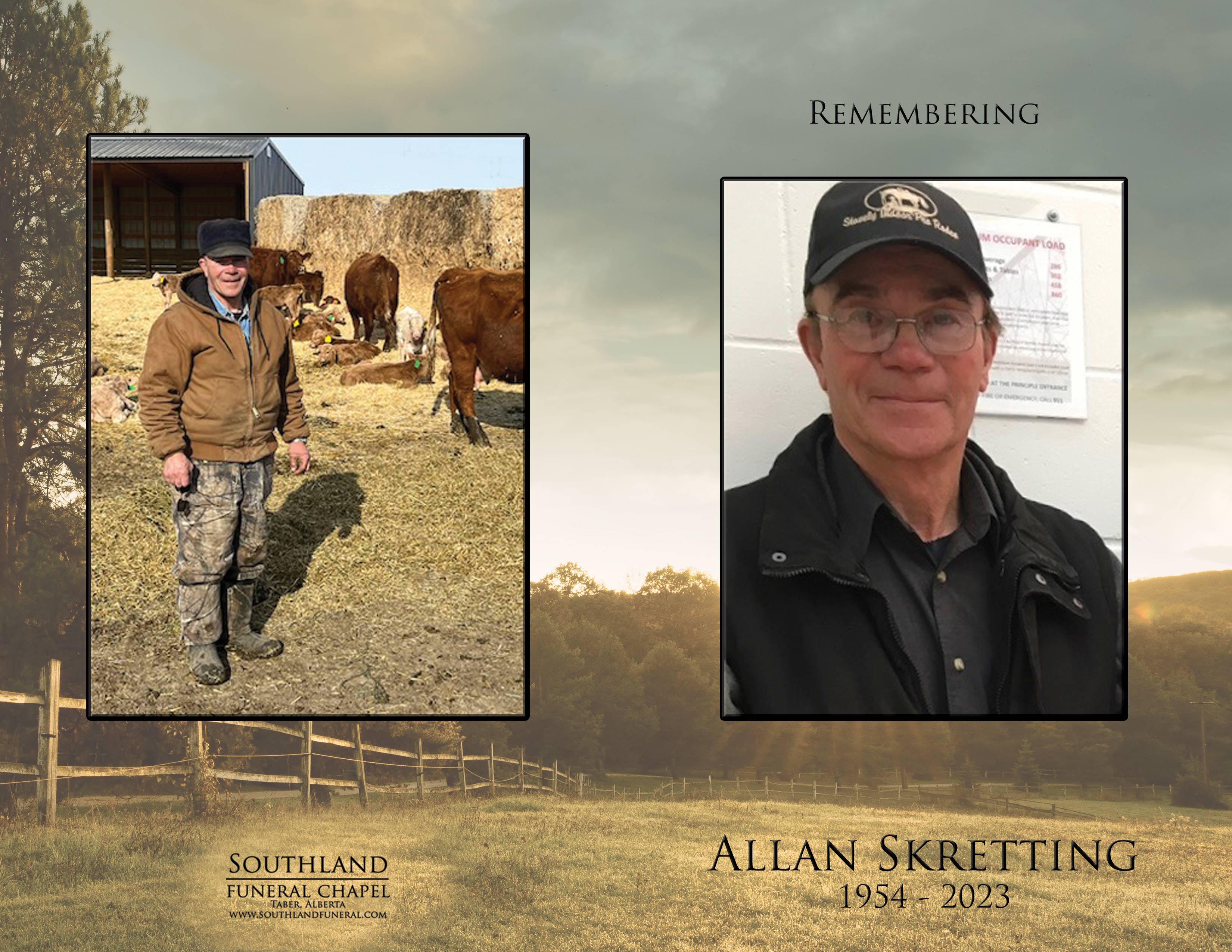 Allan Wray Skretting, beloved husband of Ruth Skretting, passed away unexpectedly on his farm west of Enchant on Thursday, July 6, 2023 at the age of 69 years.