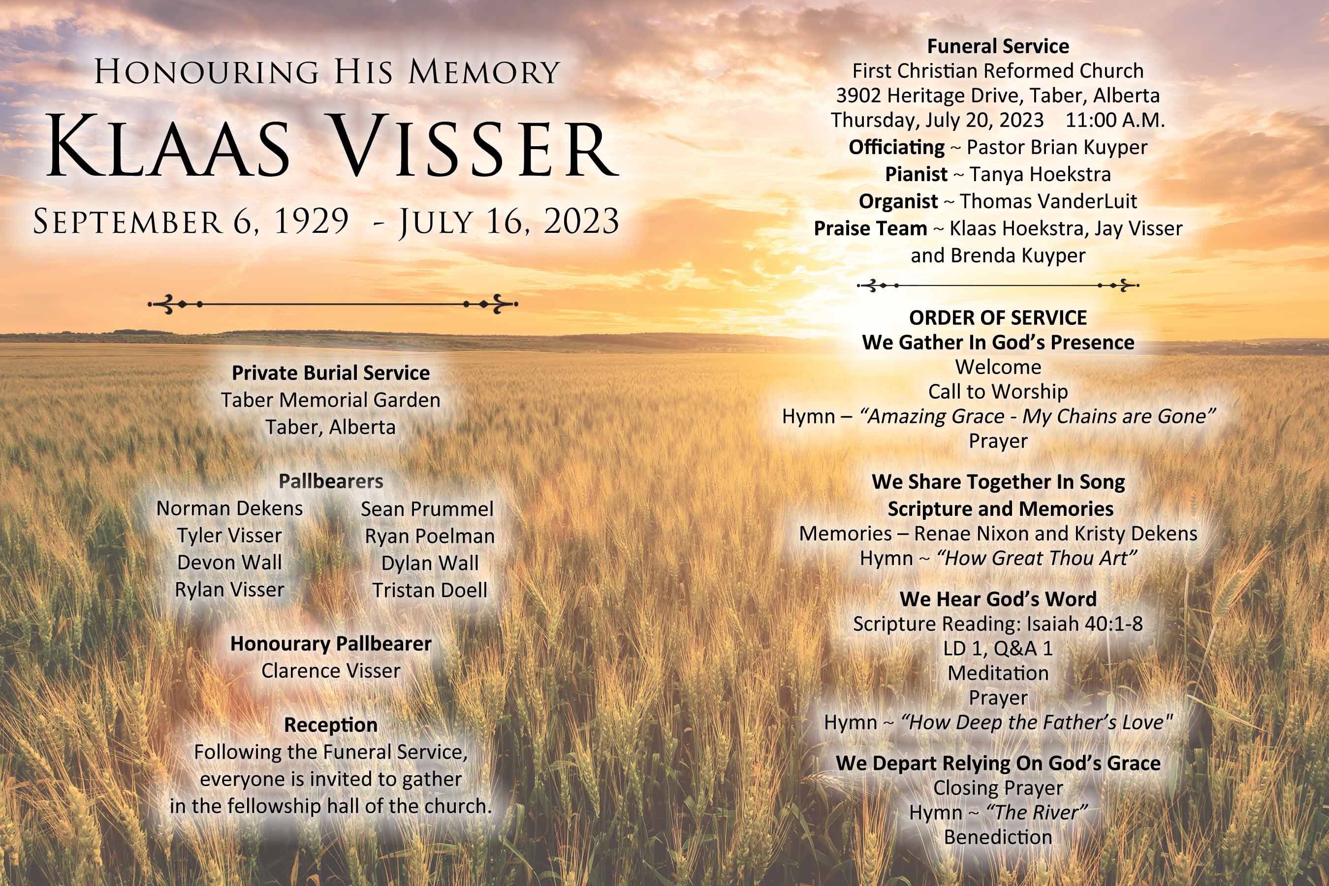 The Funeral Service was held at the First Christian Reformed Church, 3902 Heritage Drive, Taber on Thursday, July 20, 2023 at 11:00 A.M.