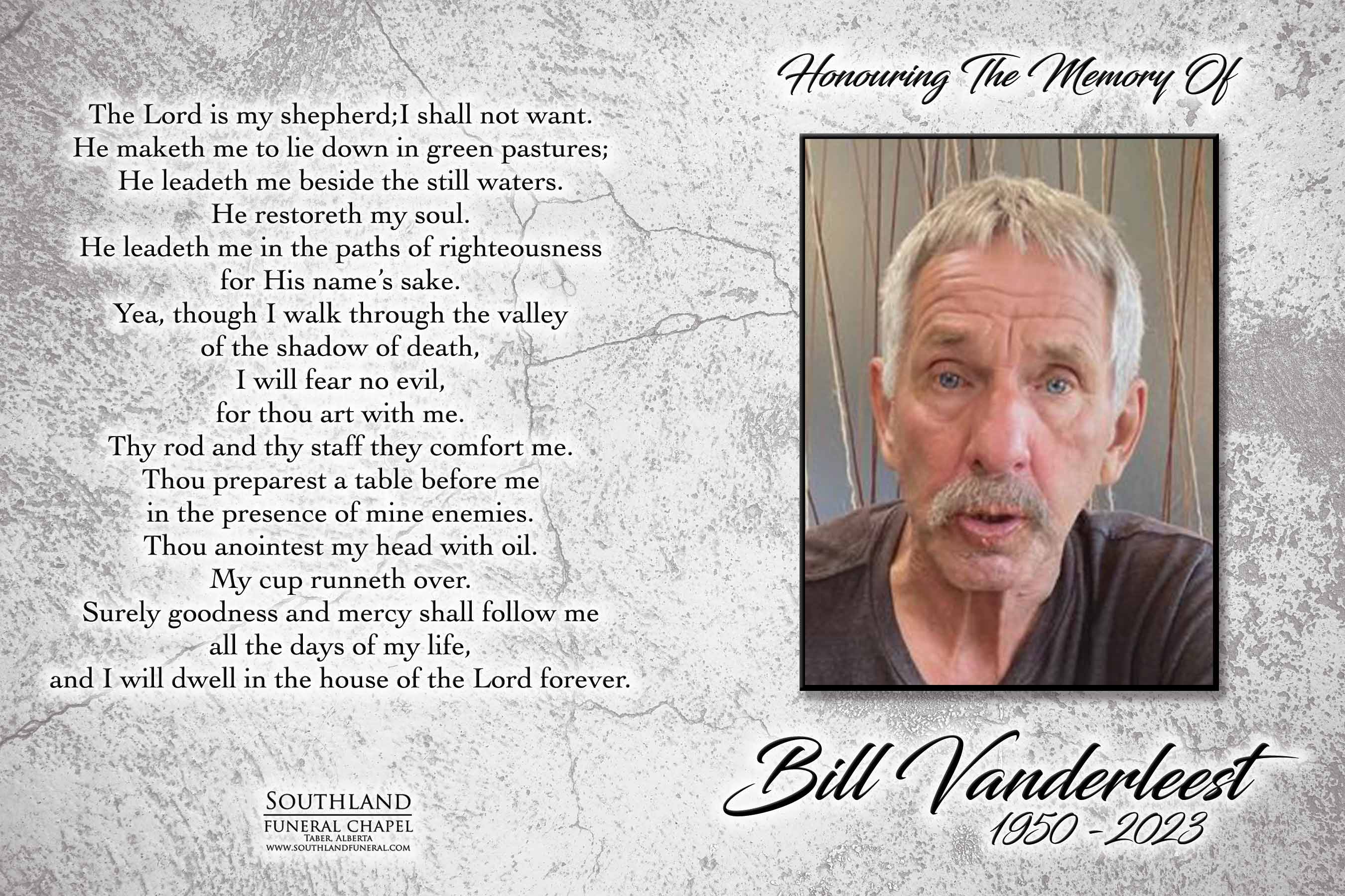 Bill leaves to mourn his siblings Vena (Gerrit de Jong) Vandersteen of Taber, Rika Vanderleest of Lethbridge, Cory (Diane) Vanderleest of Sooke, British Columbia and their families.