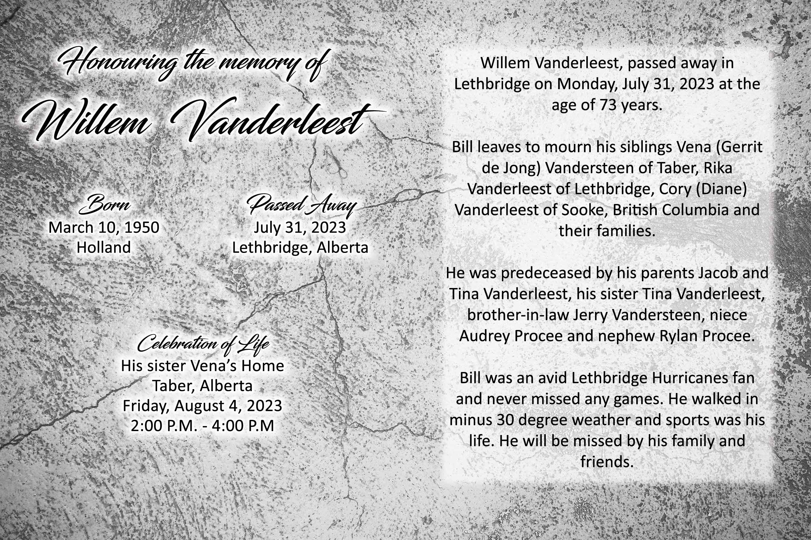 Willem Vanderleest, passed away in Lethbridge on Monday, July 31, 2023 at the age of 73 years.