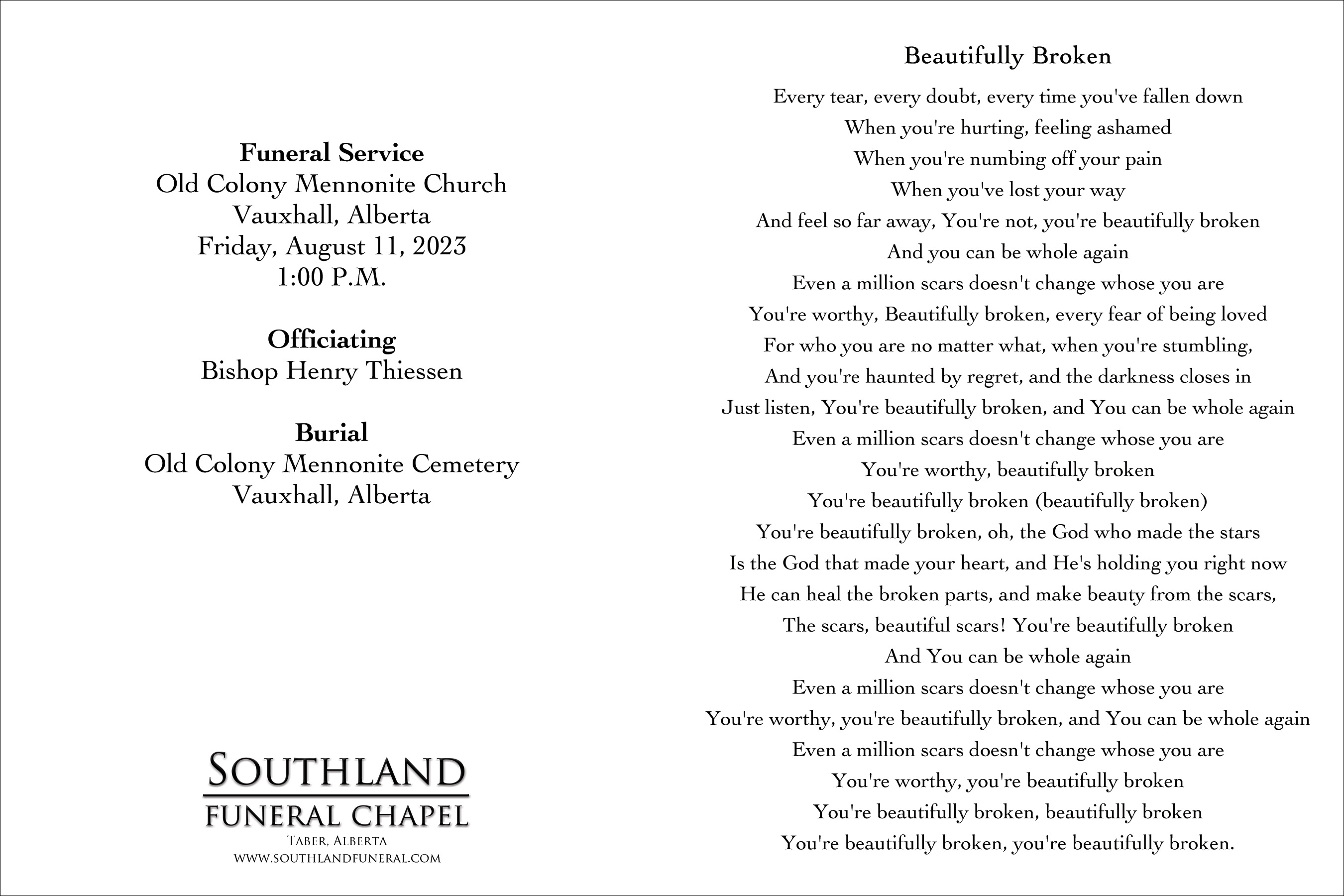 The Funeral Service was held at the Old Colony Mennonite Church, Vauxhall (travel north of Vauxhall on Highway 36 ten kilometres, then nine kilometres west on Highway 526 and finally one kilometre south of the Circle Hill Community Hall on Range Road 172) on Friday, August 11, 2023 at 1:00 P.M. Burial followed at the Old Colony Mennonite Cemetery, Vauxhall.