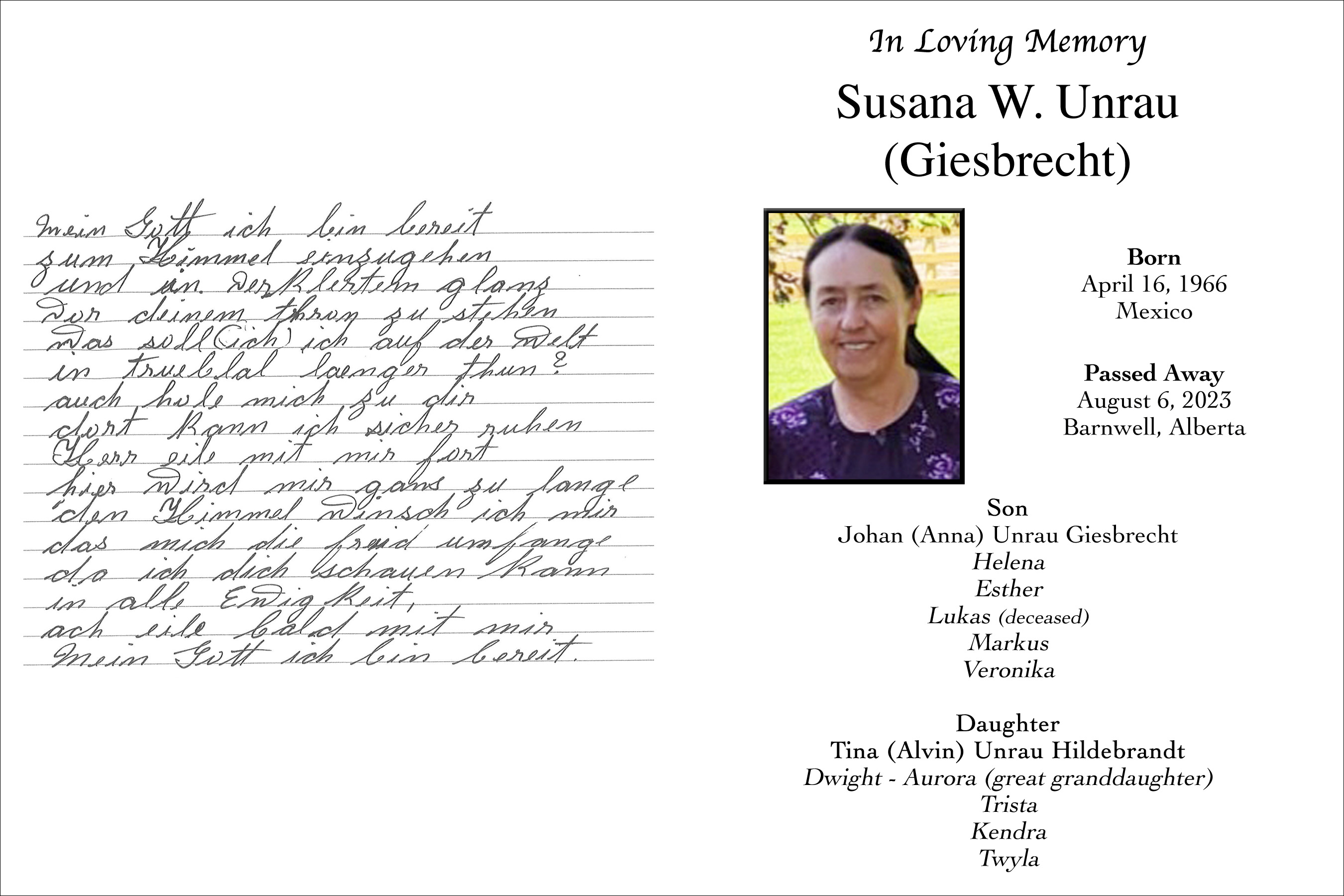 Susana Giesbrecht passed away in Barnwell on Monday, August 7, 2023 at the age of 57 years.