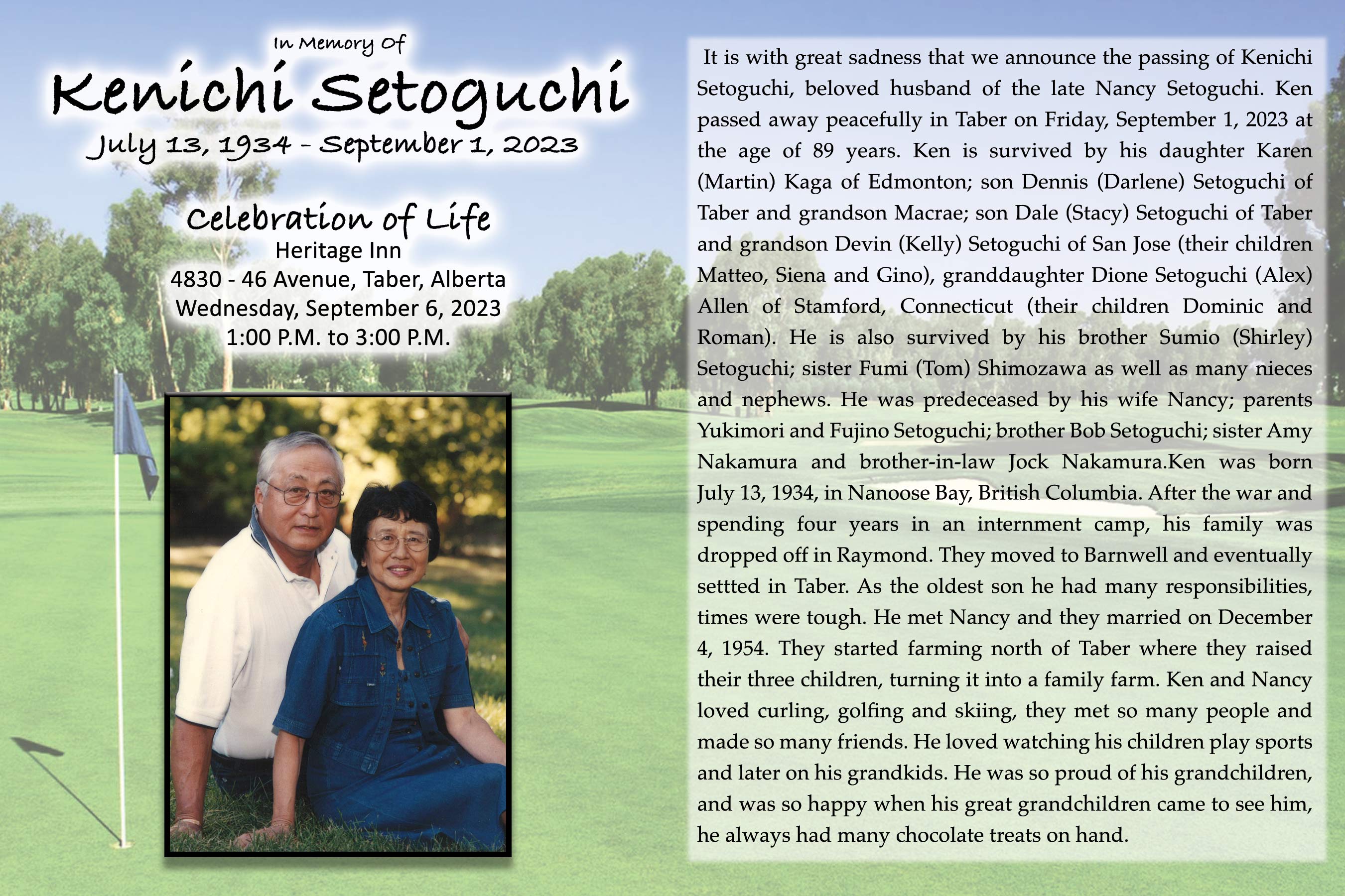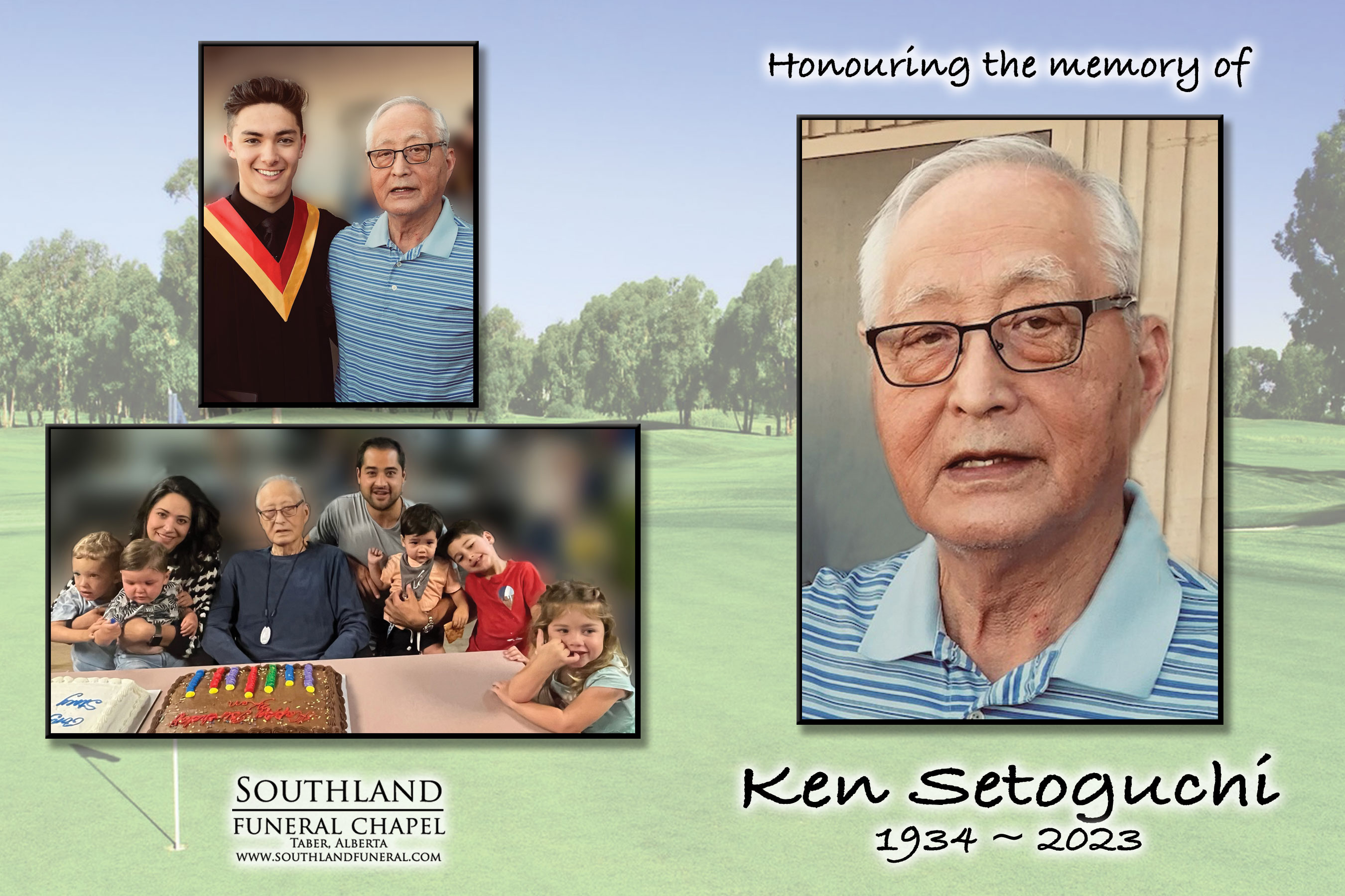 Ken is survived by his daughter Karen (Martin) Kaga of Edmonton; son Dennis (Darlene) Setoguchi of Taber and grandson Macrae; son Dale (Stacy) Setoguchi of Taber and grandson Devin (Kelly) Setoguchi of San Jose (their children Matteo, Siena and Gino), granddaughter Dione Setoguchi (Alex) Allen of Stamford, Connecticut (their children Dominic and Roman). He is also survived by his brother Sumio (Shirley) Setoguchi; sister Fumi (Tom) Shimozawa as well as many nieces and nephews.