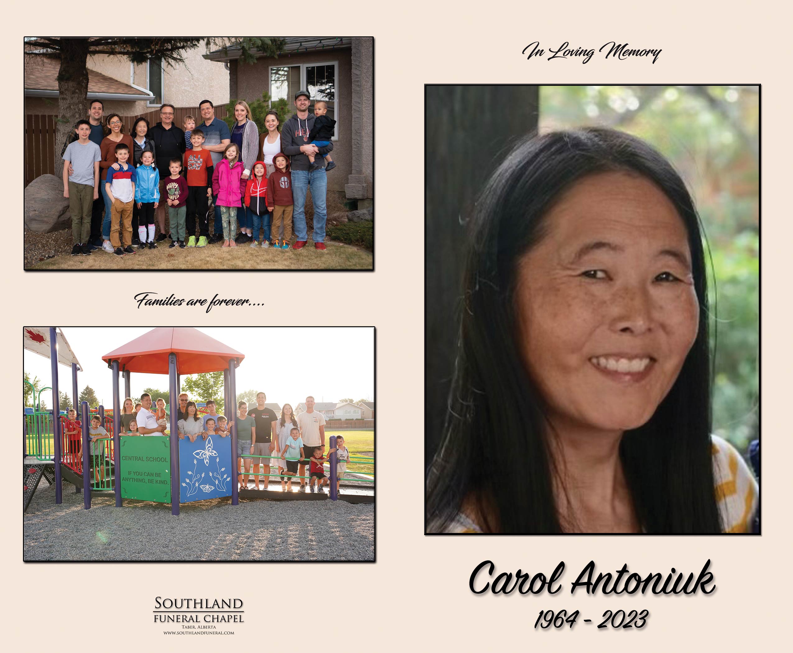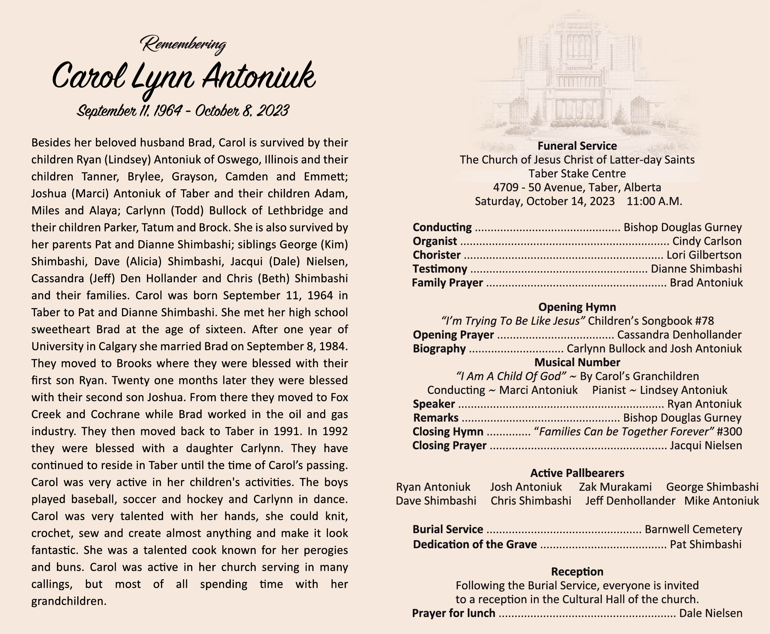 Besides her beloved husband Brad, Carol is survived by their children Ryan (Lindsey) Antoniuk of Oswego, Illinois and their children Tanner, Brylee, Grayson, Camden and Emmett; Joshua (Marci) Antoniuk of Taber and their children Adam, Miles and Alaya; Carlynn (Todd) Bullock of Lethbridge and their children Parker, Tatum and Brock. She is also survived by her parents Pat and Dianne Shimbashi; siblings George (Kim) Shimbashi, Dave (Alicia) Shimbashi, Jacqui (Dale) Nielsen, Cassandra (Jeff) Den Hollander and Chris (Beth) Shimbashi and their families.