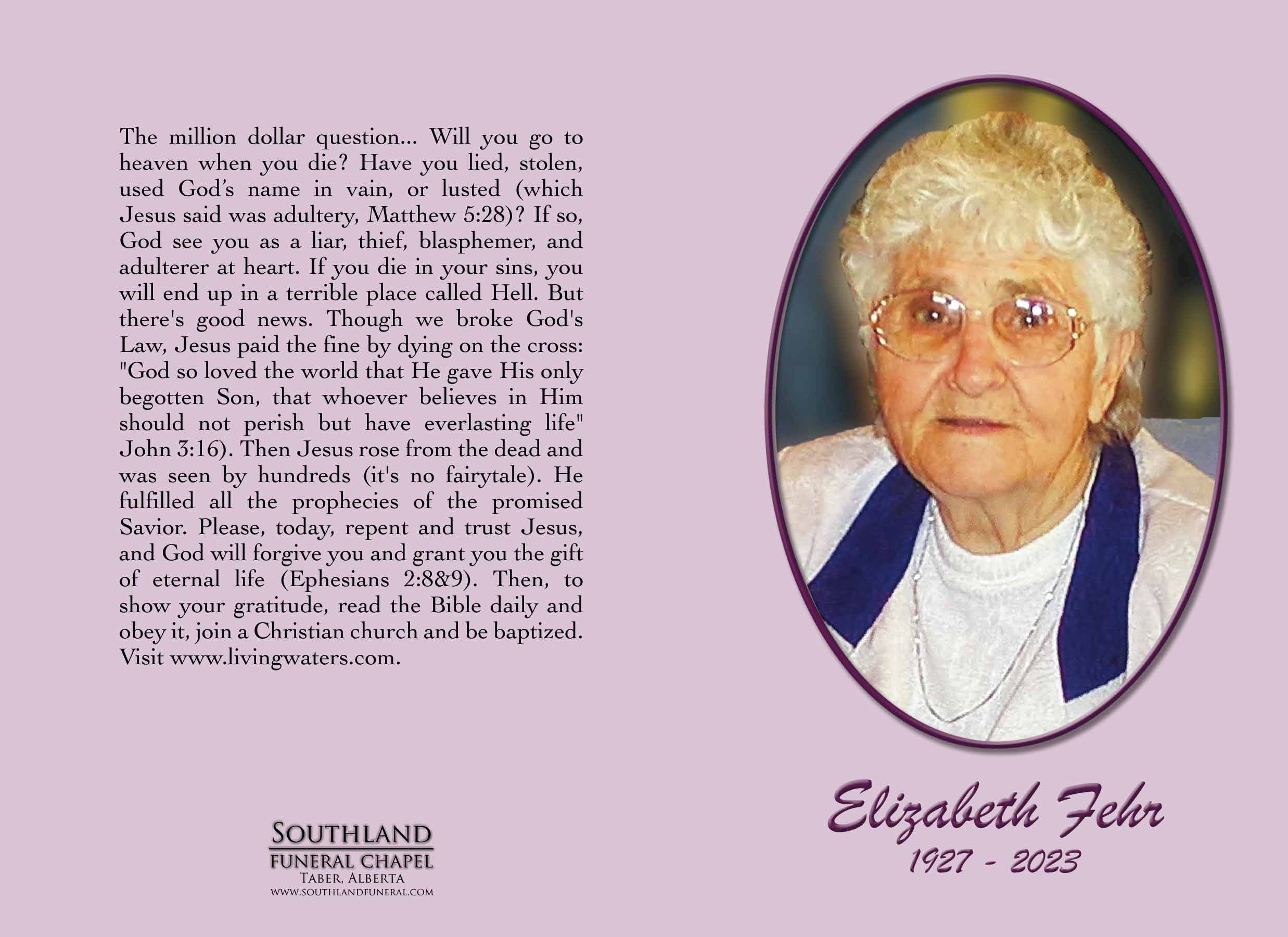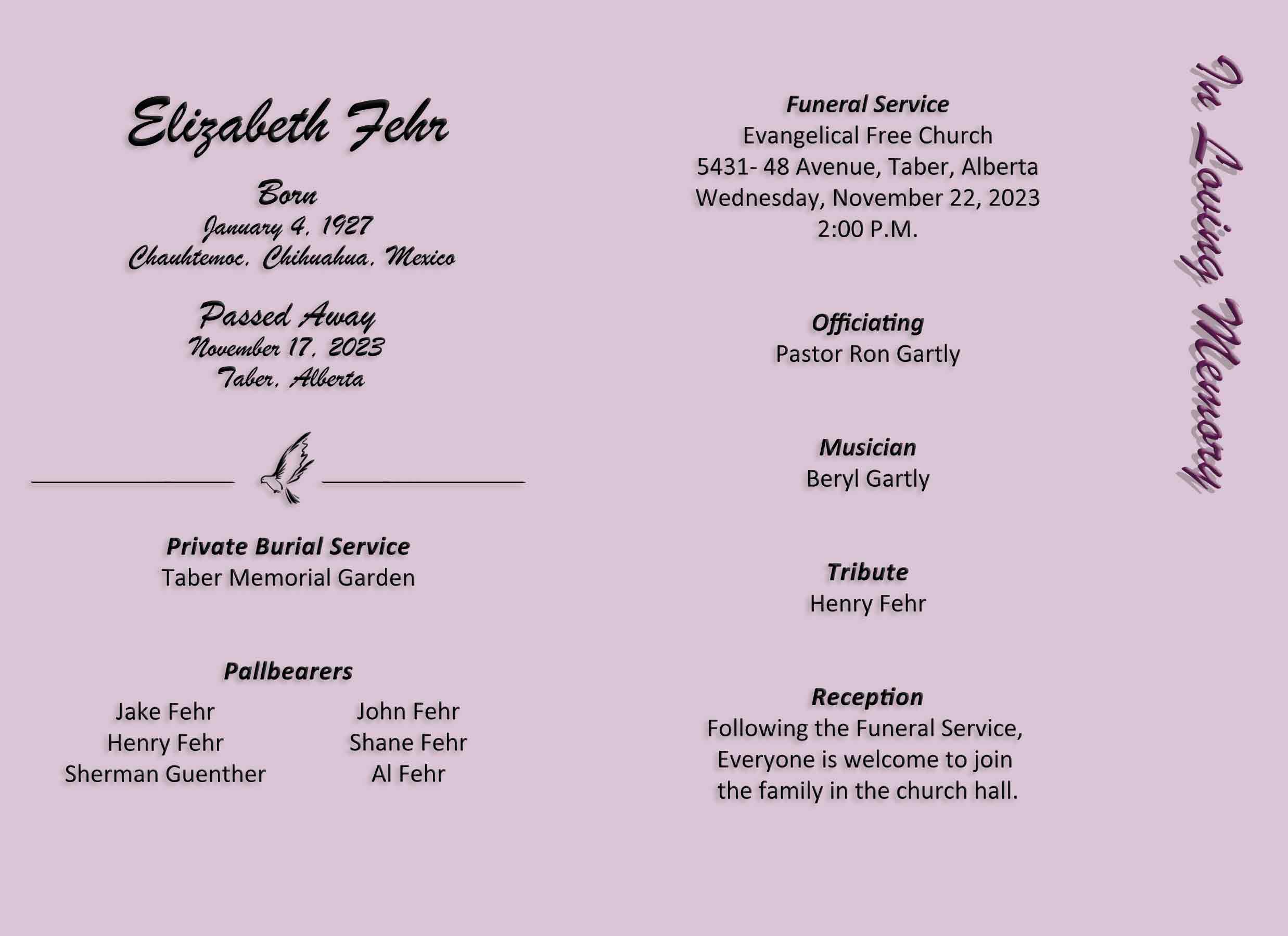 Elizabeth Fehr, beloved wife of the late Abram Fehr, passed away peacefully in Taber, surrounded by her family on Friday, November 17, 2023 at the age of 96 years.