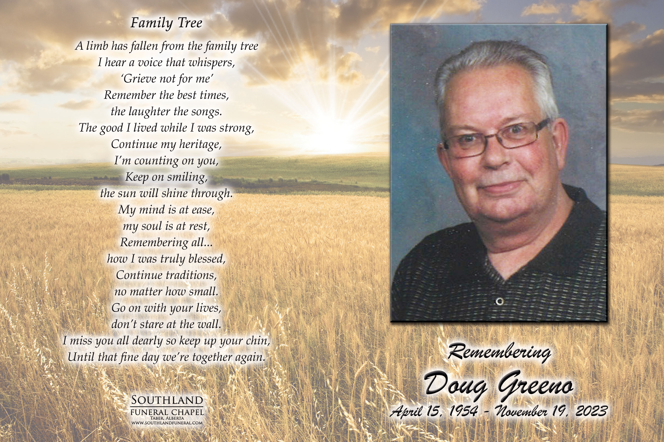 Doug will be dearly missed by his wife of 47 years, Margitta; son James Sandon (Christine) Greeno of Lac Ste. Anne; daughters Chelsey (Jason) Hamel of Medicine Hat and Lacey Zaiser of Taber. He will also be lovingly remembered by his grandchildren Trinity (Kai), Trace, Kaitlin, Kenadie, Jordon (Shawn), Jayleen (Jeff), Myla and Owen; siblings Sharon (Gordon) Meidinger of Medicine Hat, David (Judy) Greeno of Taber and Wilma (Morris) Hrabluik of Calgary.