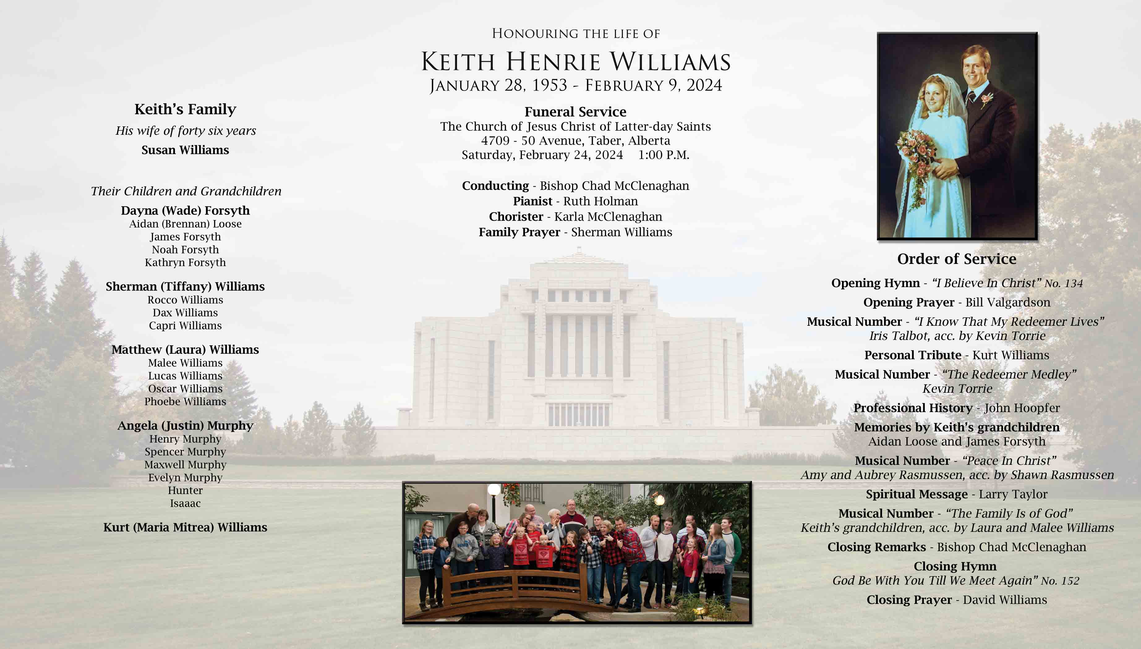Relatives and friends were invited to meet the family at The Church of Jesus Christ of Latter-day Saints, Taber Stake Centre, 4709 - 50 Avenue, Taber on Friday, February 23, 2024 between 7:00 P.M. and 8:00 P.M. and at the church prior to the funeral service on Saturday, February 24, 2024 between 12:00 P.M. and 12:45 P.M.