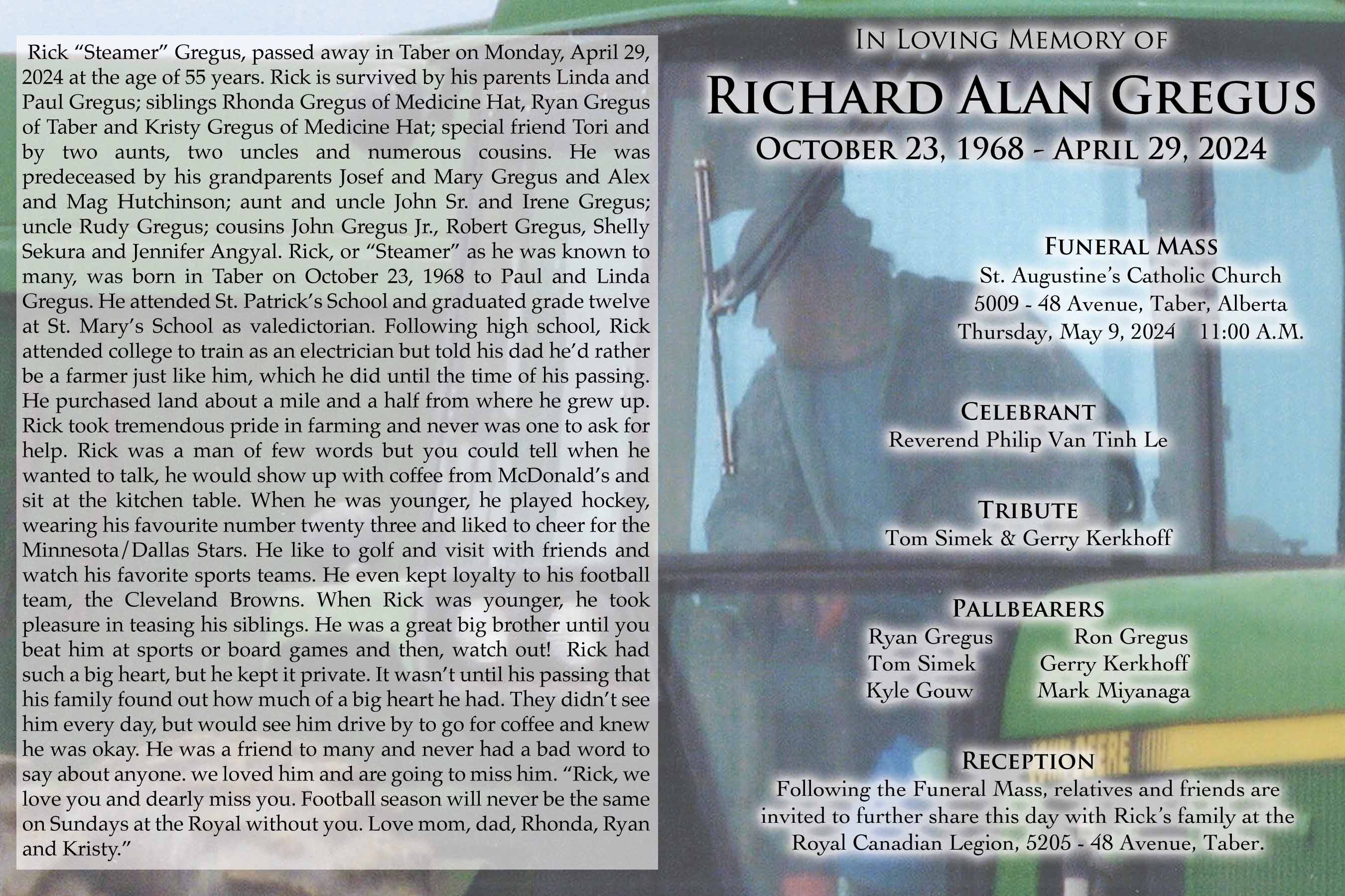 Rick, or “Steamer” as he was known to many, was born in Taber on October 23, 1968 to Paul and Linda Gregus. He attended St. Patrick’s School and graduated grade twelve at St. Mary’s School as valedictorian. Following high school, Rick attended college to train as an electrician but told his dad he’d rather be a farmer just like him, which he did until the time of his passing. He purchased land about a mile and a half from where he grew up. Rick took tremendous pride in farming and never was one to ask for help.