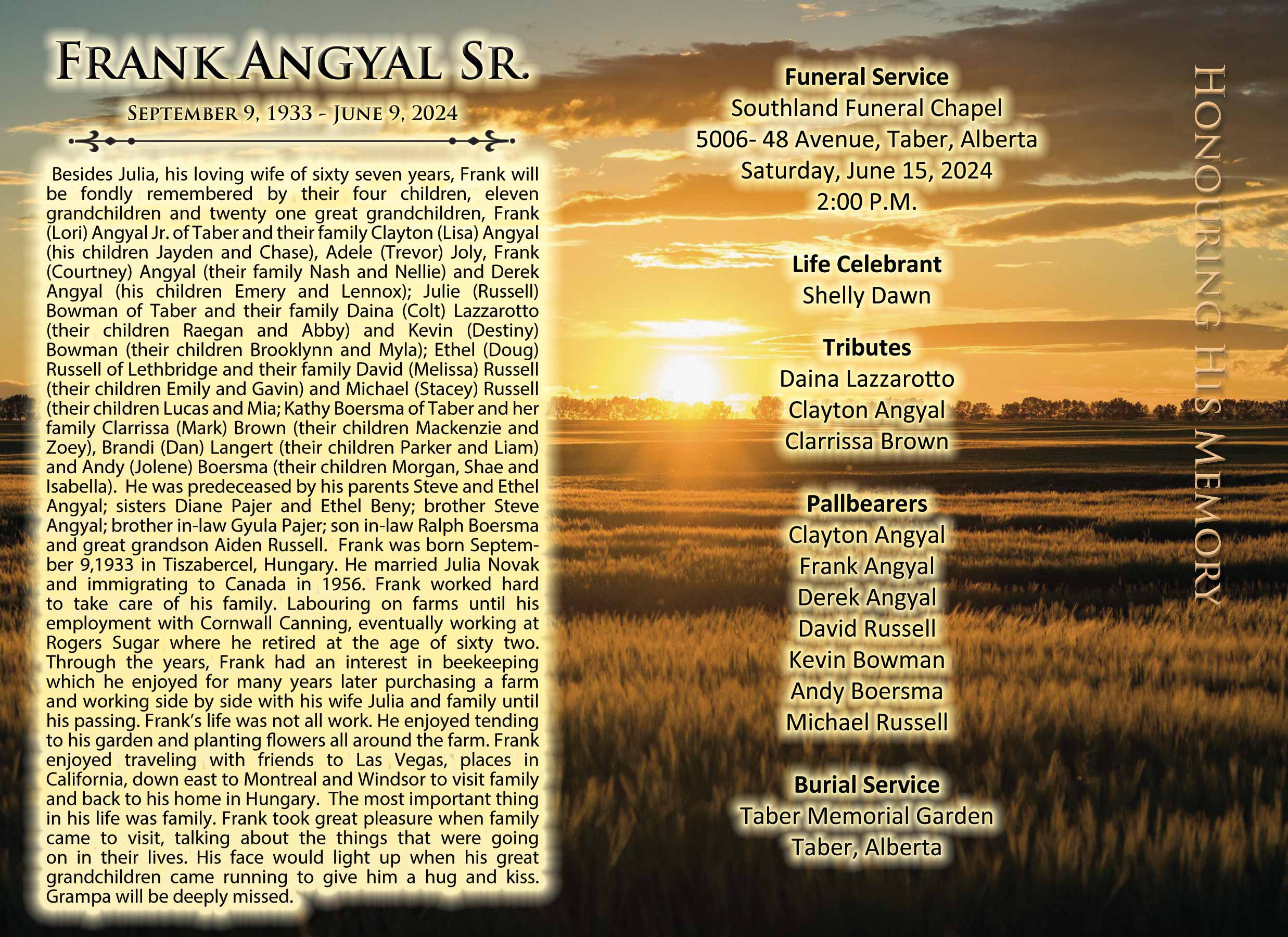 Besides Julia, his loving wife of sixty seven years, Frank will be fondly remembered by their four children, eleven grandchildren and twenty one great grandchildren, Frank (Lori) Angyal Jr. of Taber and their family Clayton (Lisa) Angyal (his children Jayden and Chase), Adele (Trevor) Joly, Frank (Courtney) Angyal (their family Nash and Nellie) and Derek Angyal (his children Emery and Lennox); Julie (Russell) Bowman of Taber and their family Daina (Colt) Lazzarotto (their children Raegan and Abby) and Kevin (Destiny) Bowman (their children Brooklynn and Myla); Ethel (Doug) Russell of Lethbridge and their family David (Melissa) Russell (their children Emily and Gavin) and Michael (Stacey) Russell (their children Lucas and Mia; Kathy Boersma of Taber and her family Clarrissa (Mark) Brown (their children Mackenzie and Zoey), Brandi (Dan) Langert (their children Parker and Liam) and Andy (Jolene) Boersma (their children Morgan, Shae and Isabella).