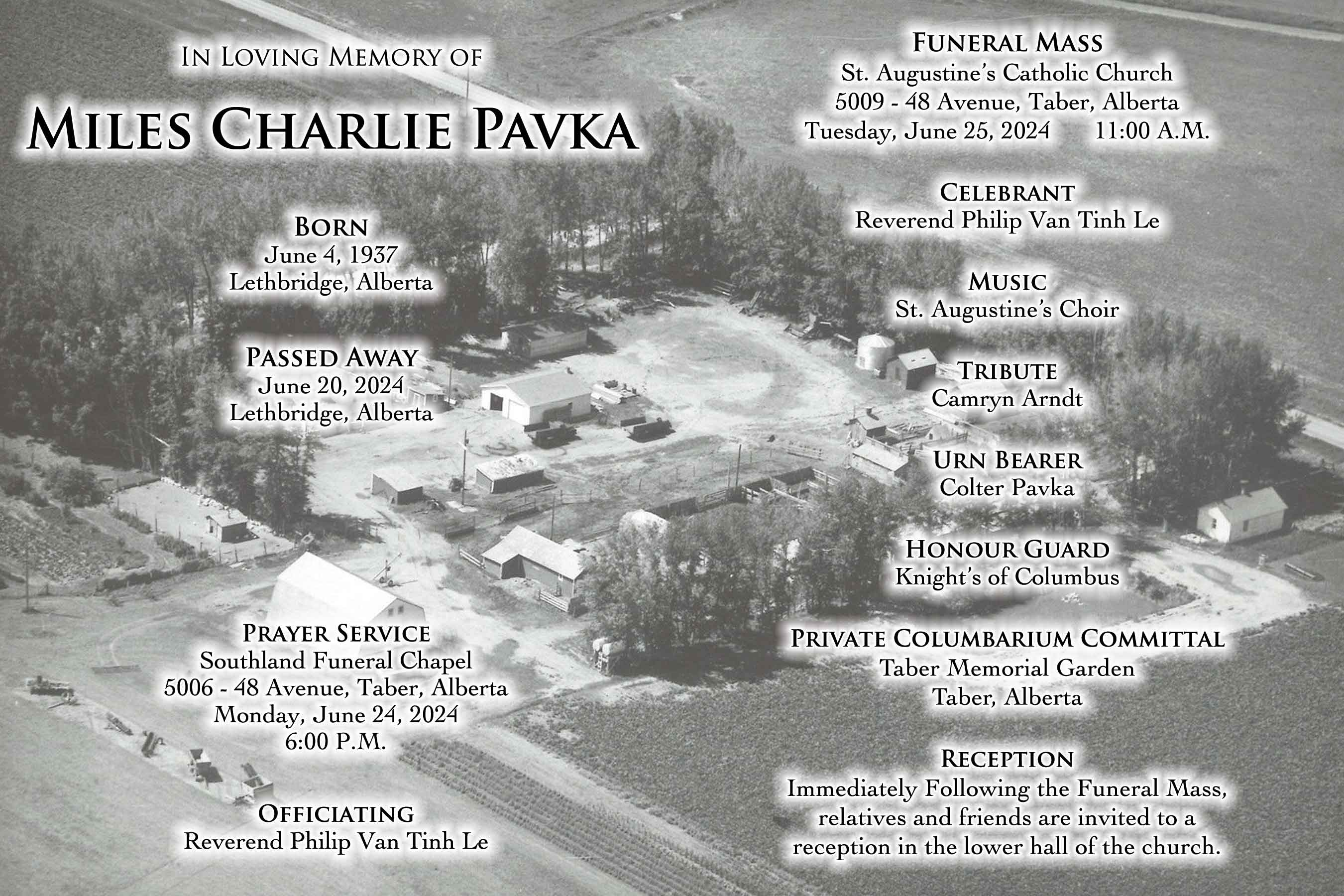The Funeral Mass was celebrated at St. Augustine's Catholic Church, 5009 - 48 Avenue, Taber on Tuesday, June 25, 2024 at 11:00 A.M. A private committal service followed at the Taber Memorial Garden.