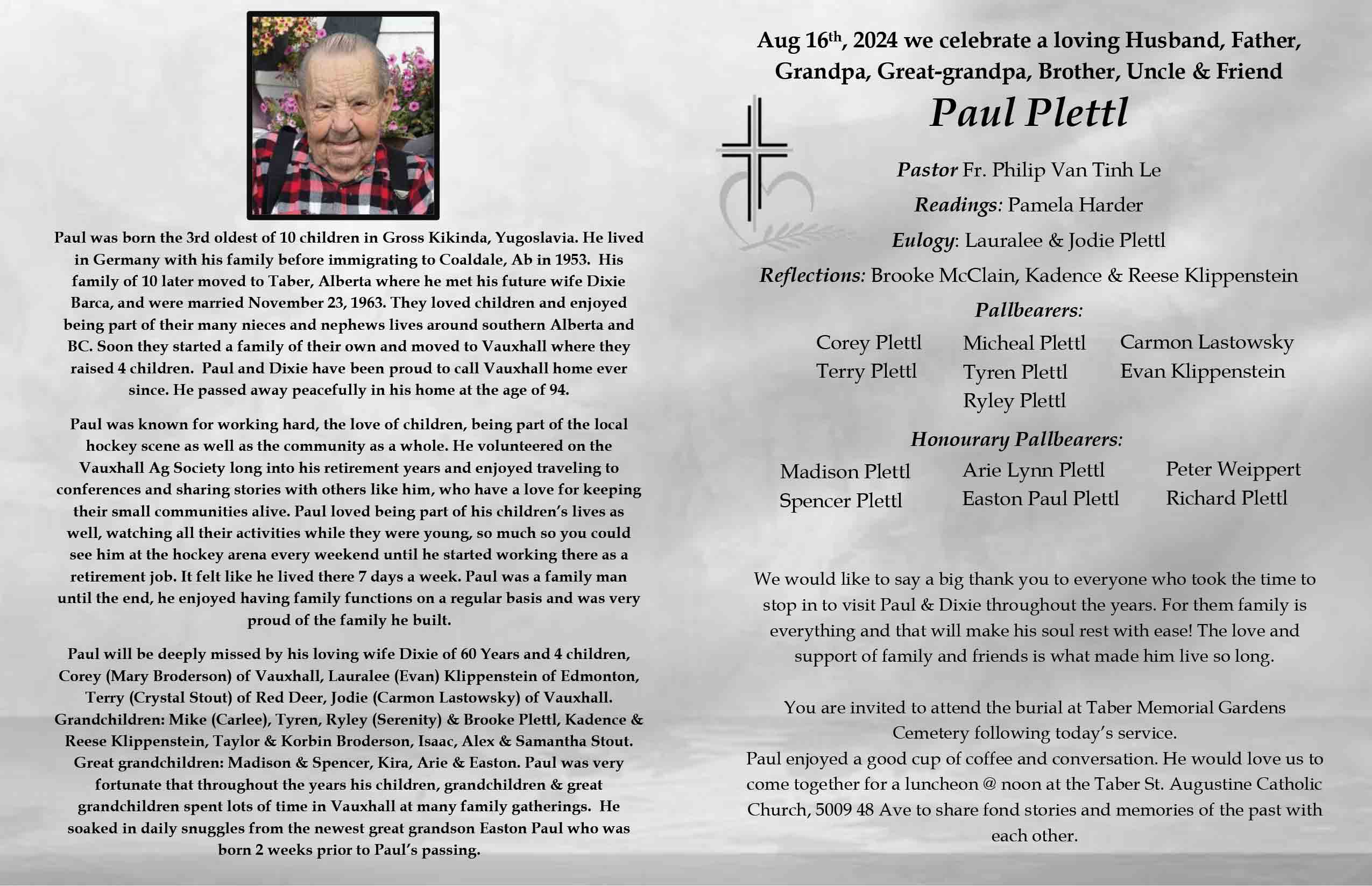 The Funeral Service was held at St. Augustine's Catholic Church, 5009 - 48 Avenue, Taber on Friday, August 16, 2024 at 11:00 A.M. Burial followed at the Taber Memorial Garden.