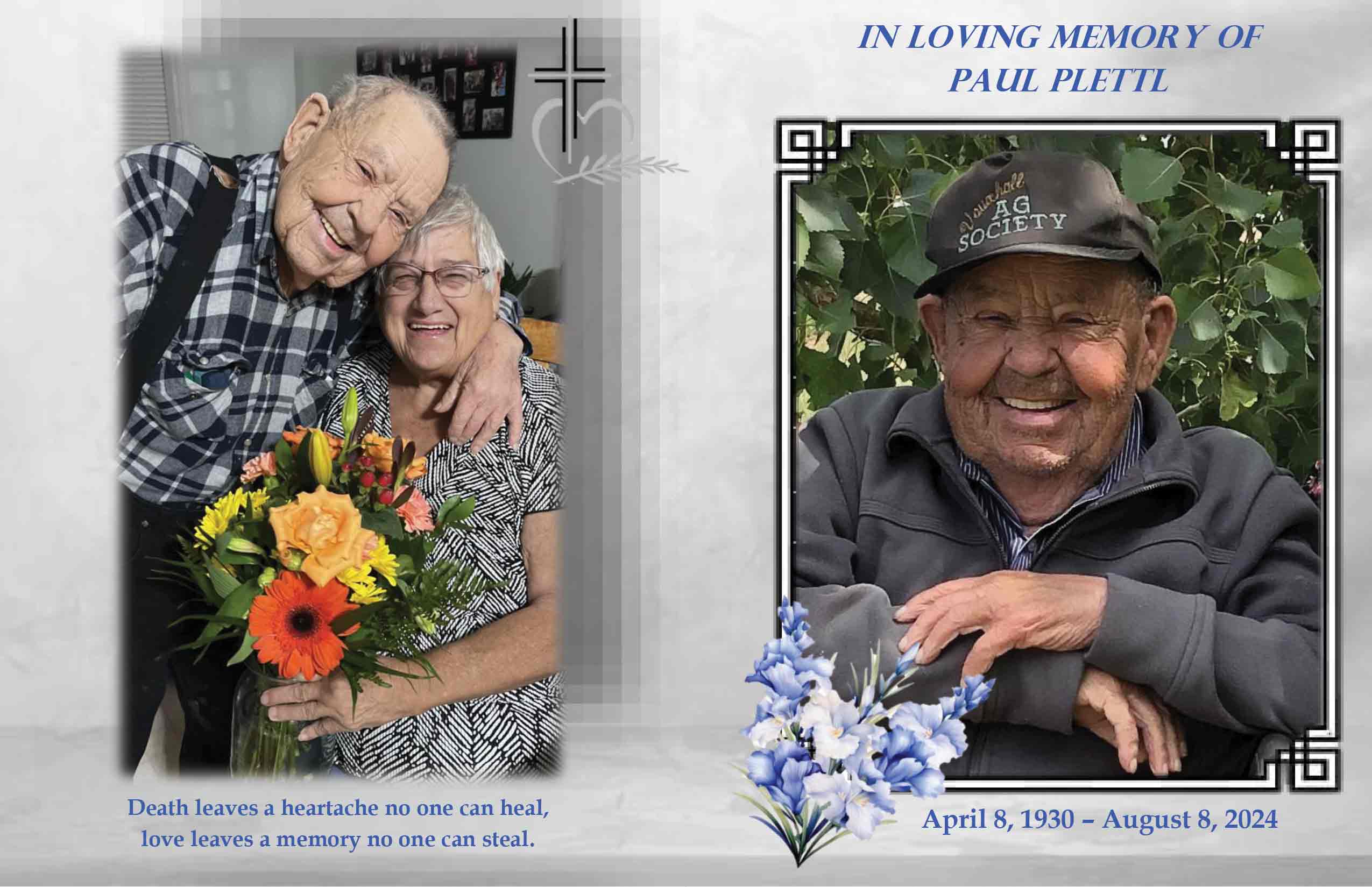 Paul Plettl, beloved husband of Dixie Plettl, passed away peacefully in his home in Vauxhall on Thursday, August 8, 2024 at the age of 94 years.