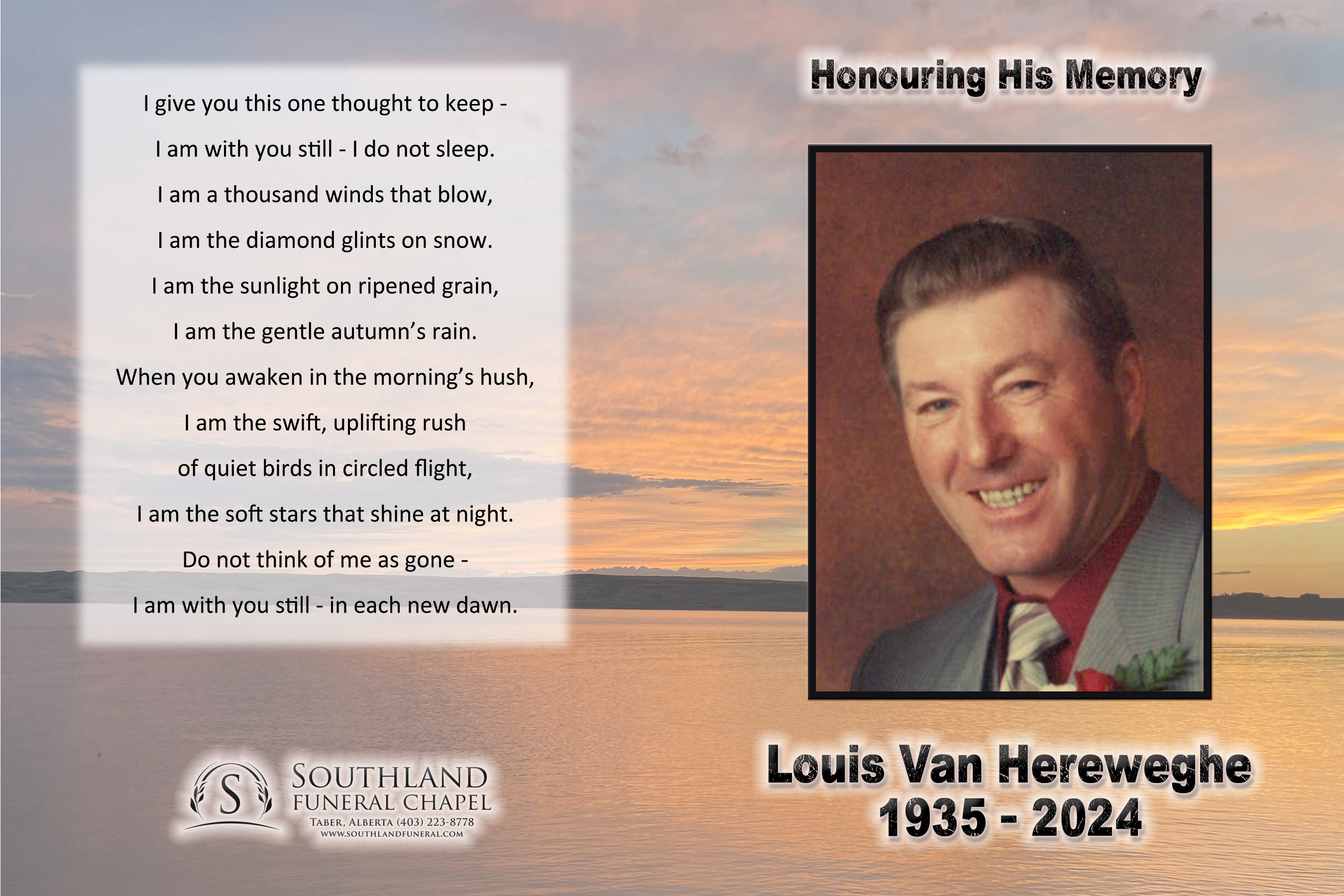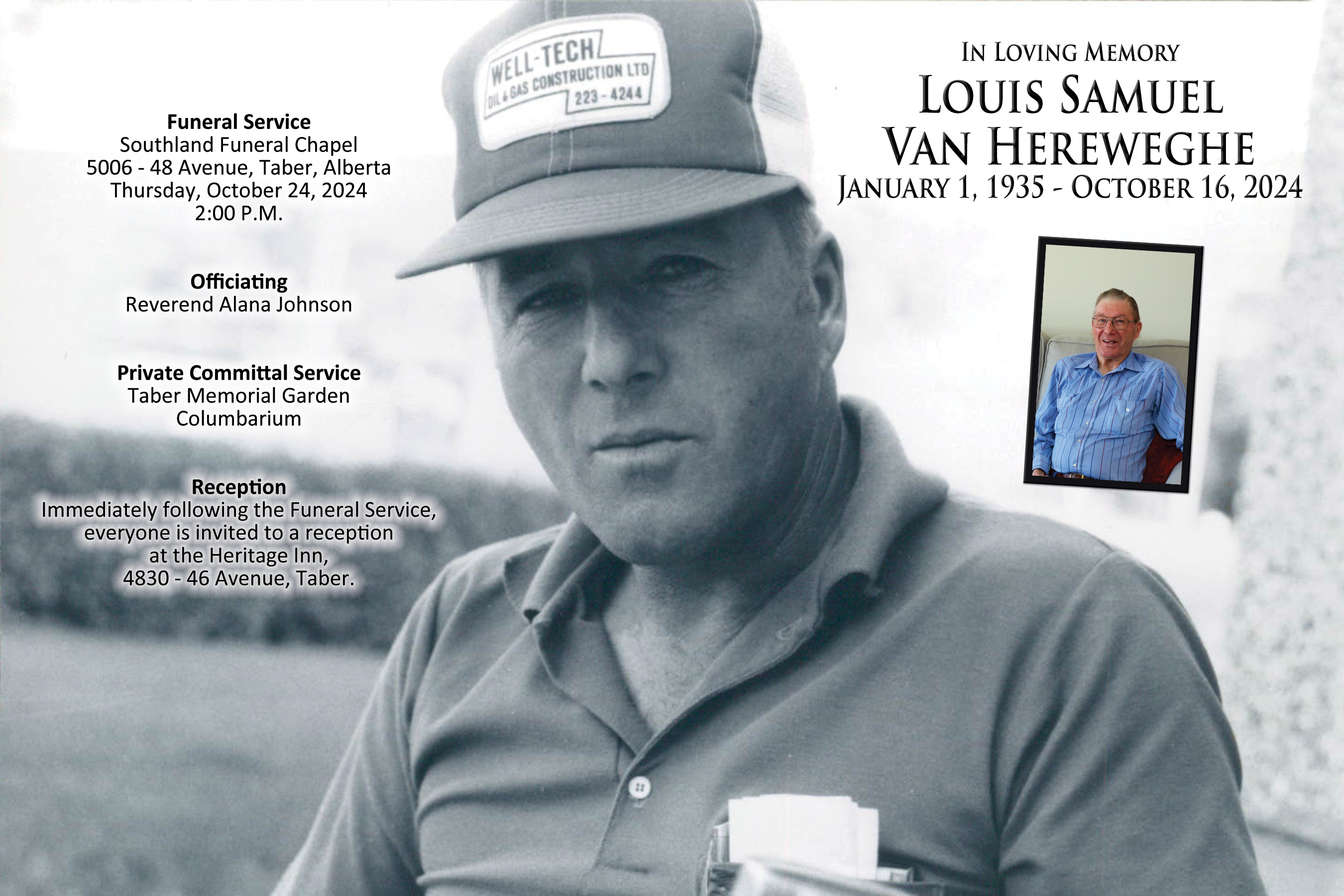 Louis Samuel Van Hereweghe, beloved husband of the late Joyce Van Hereweghe, passed away in Taber on Wednesday, October 16, 2024 at the age of 89 years.
