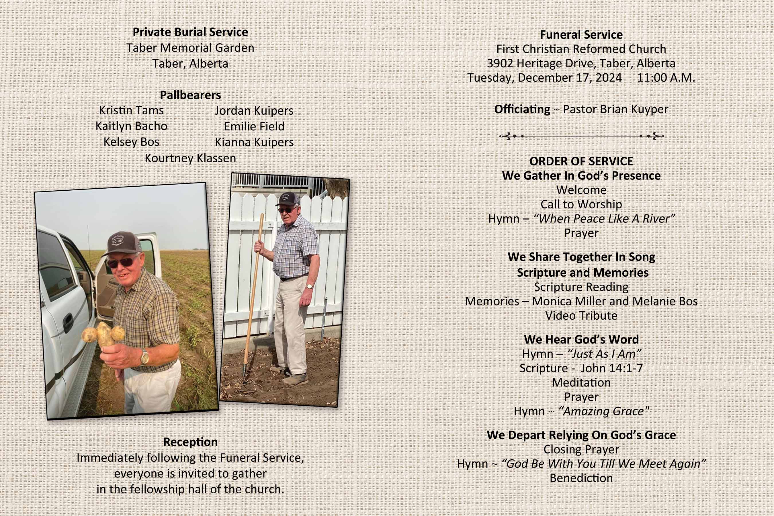 The Funeral Service was held at the First Christian Reformed Church, 3902 Heritage Drive, Taber on Tuesday, December 17, 2024 at 11:00 A.M.