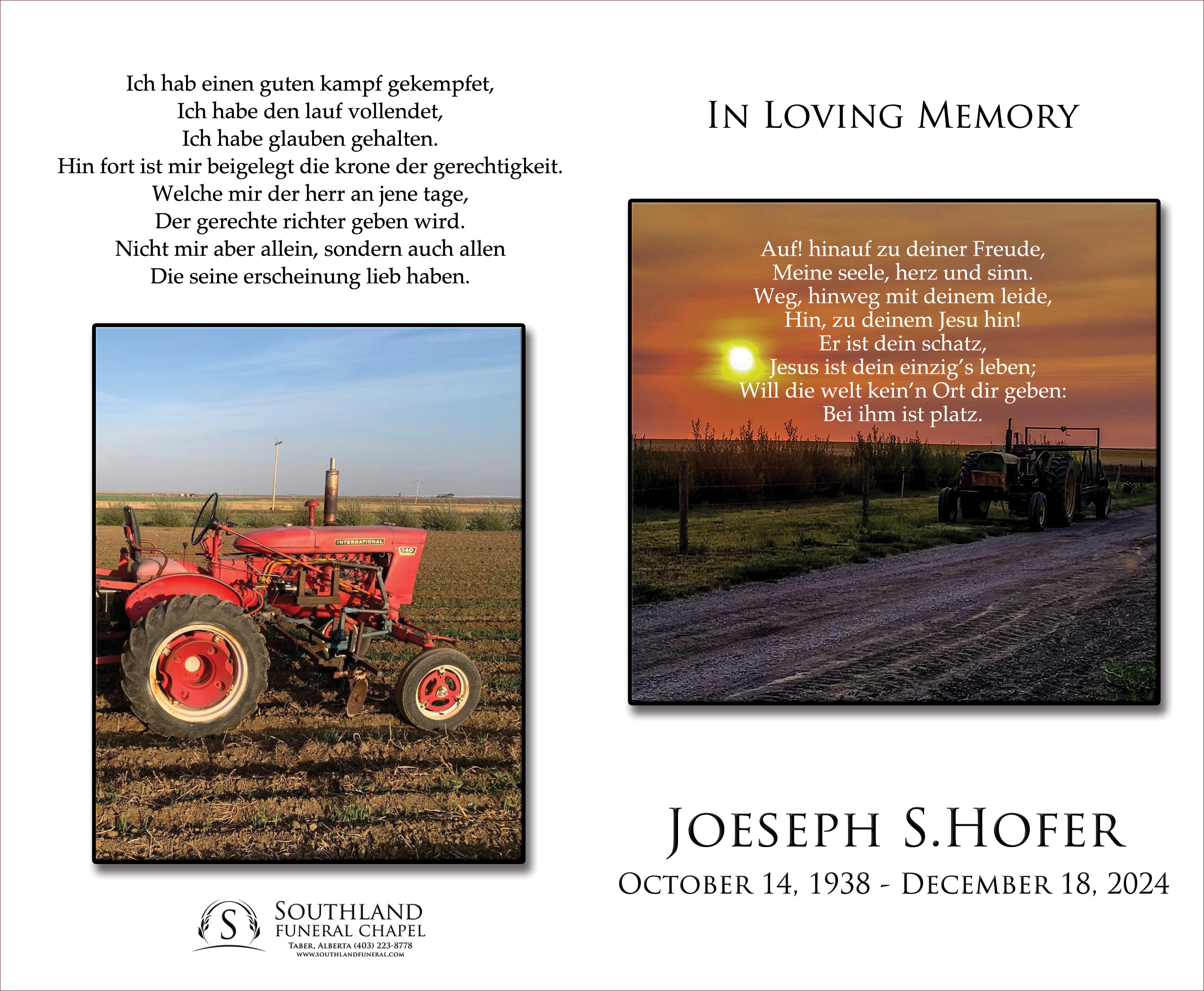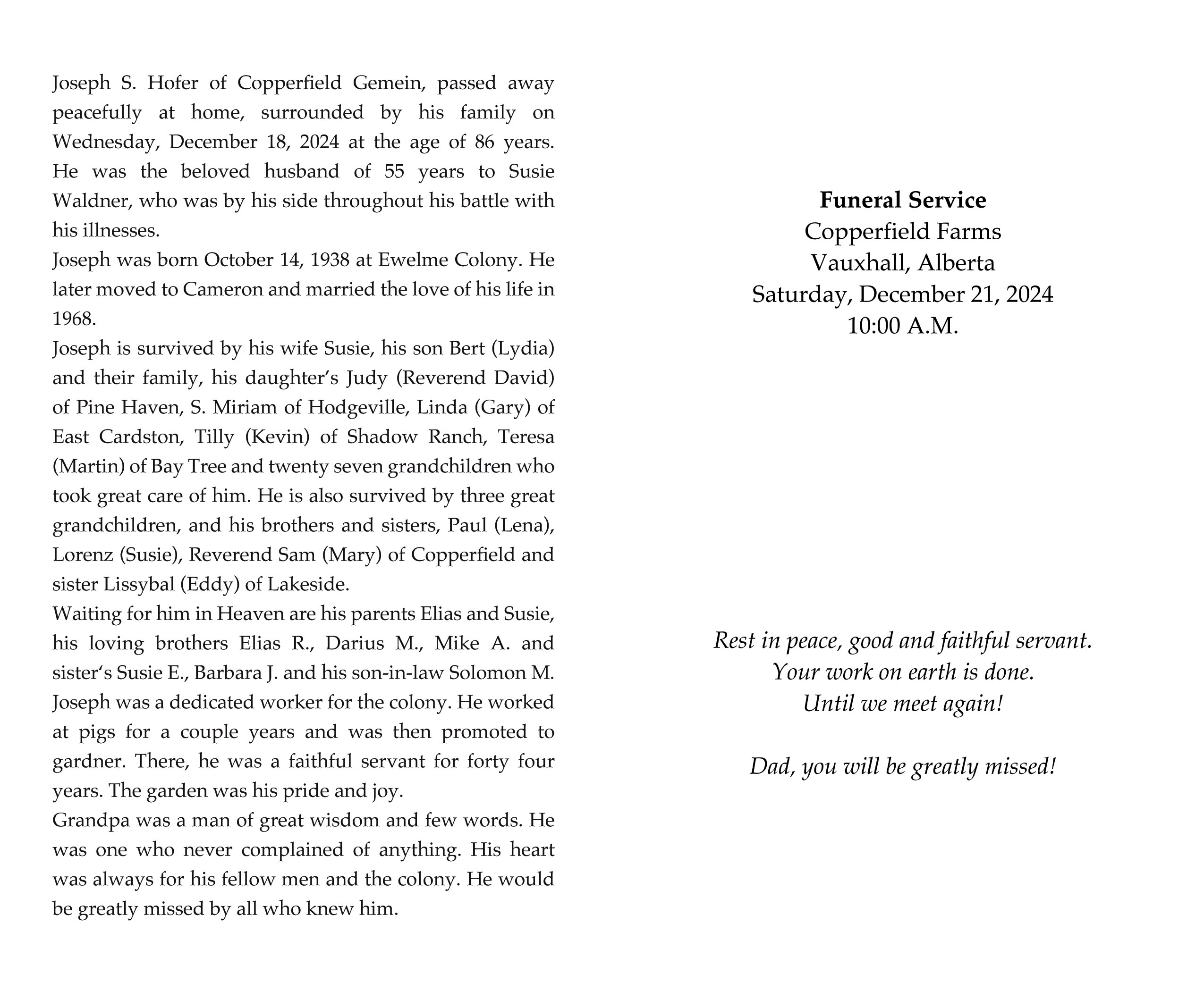 The Funeral Service was held at the Copperfield Farms Colony, Vauxhall on Saturday, December 21, 2024 at 10:00 A.M. Burial followed at the Copperfield Farms Colony Cemetery.