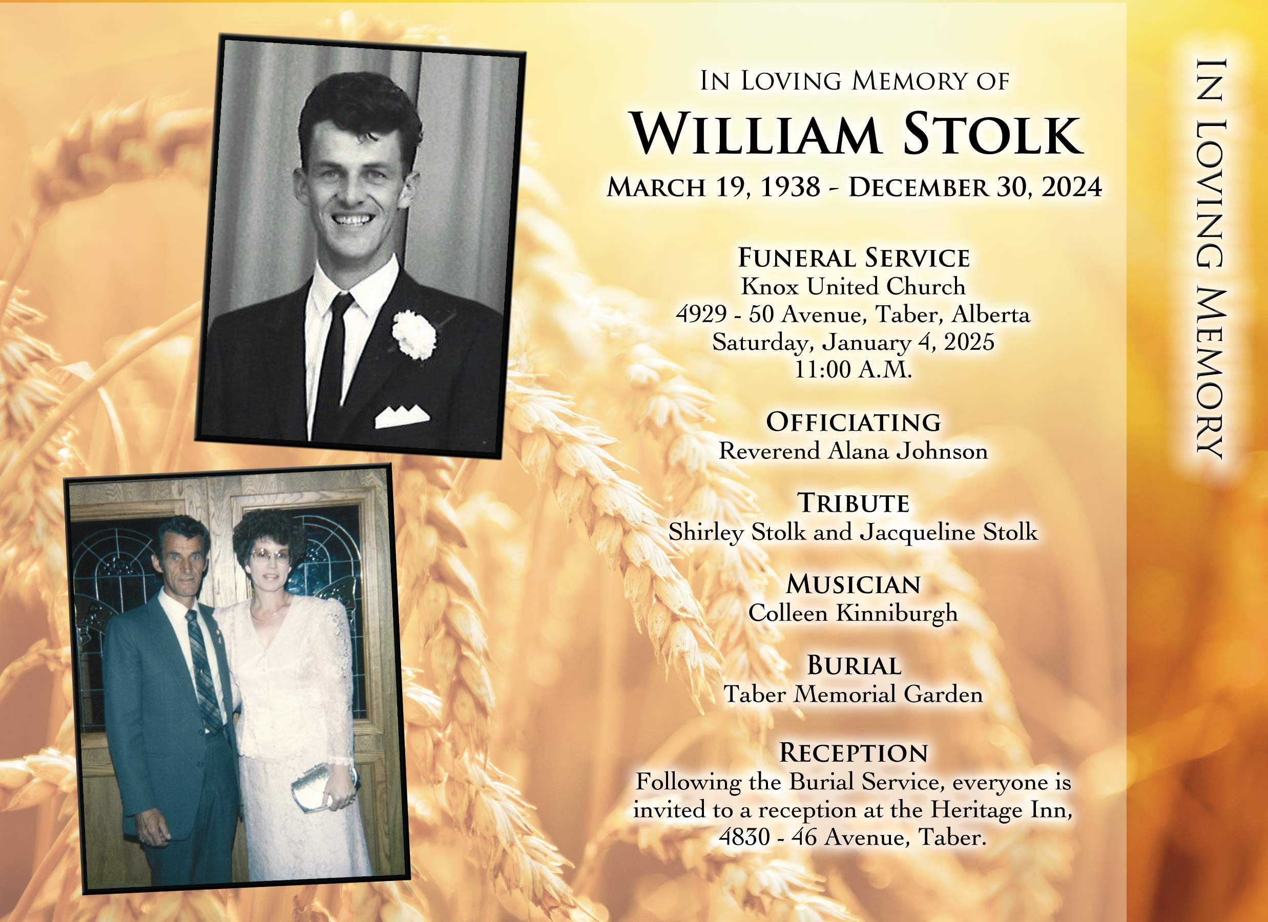 William Stolk, beloved husband of Darlien Stolk, passed away in Taber on Monday, December 30, 2024 at the age of 86 years.