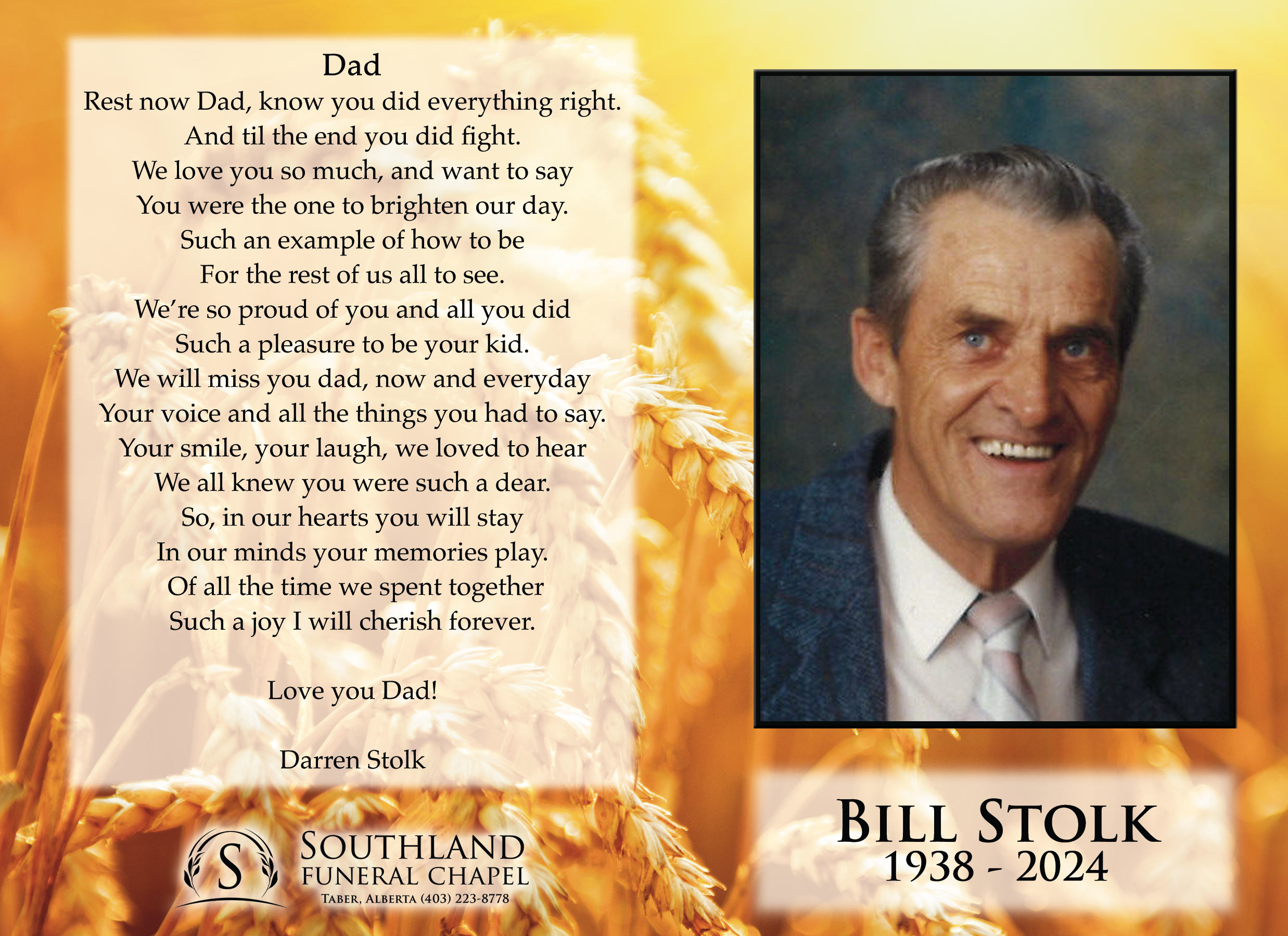 Bill was born March 19, 1938 in Naaldyk, Holland to Frank and Cora Stolk. In 1949, at the age of eleven, the family immigrated to Canada. They came by ship to Quebec then headed west by train to Lethbridge and settled in Picture Butte. In 1952, the family moved to the Purple Springs area to take up farming. In 1963 Bill bought his then first quarter of land and a few years later enlarged the farm to a half section. He found he preferred working cattle to grain and vegetables, so he grew his herd to ninety but still kept mixed farming as well. In later years as Bill began to slow down, he went from cow calf to bred heifers. He eventually was tired and moved into Taber to enjoy a little bit of life without the problems that follow a farmer. Bill loved his home in Taber. He loved to sit on the patio during the golfing season and watch the golfers go by. A few would even stop in for a beer before they would carry on through.