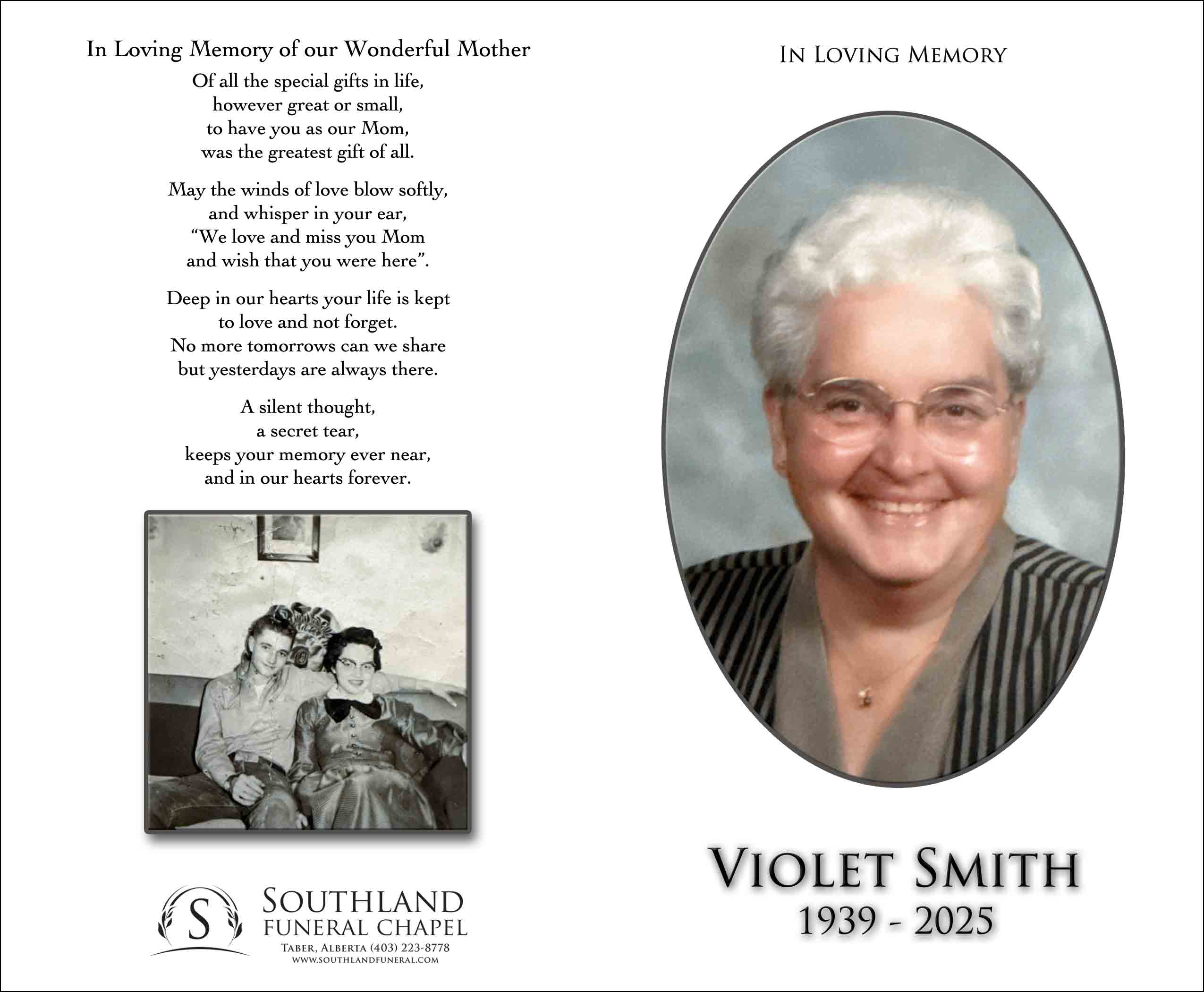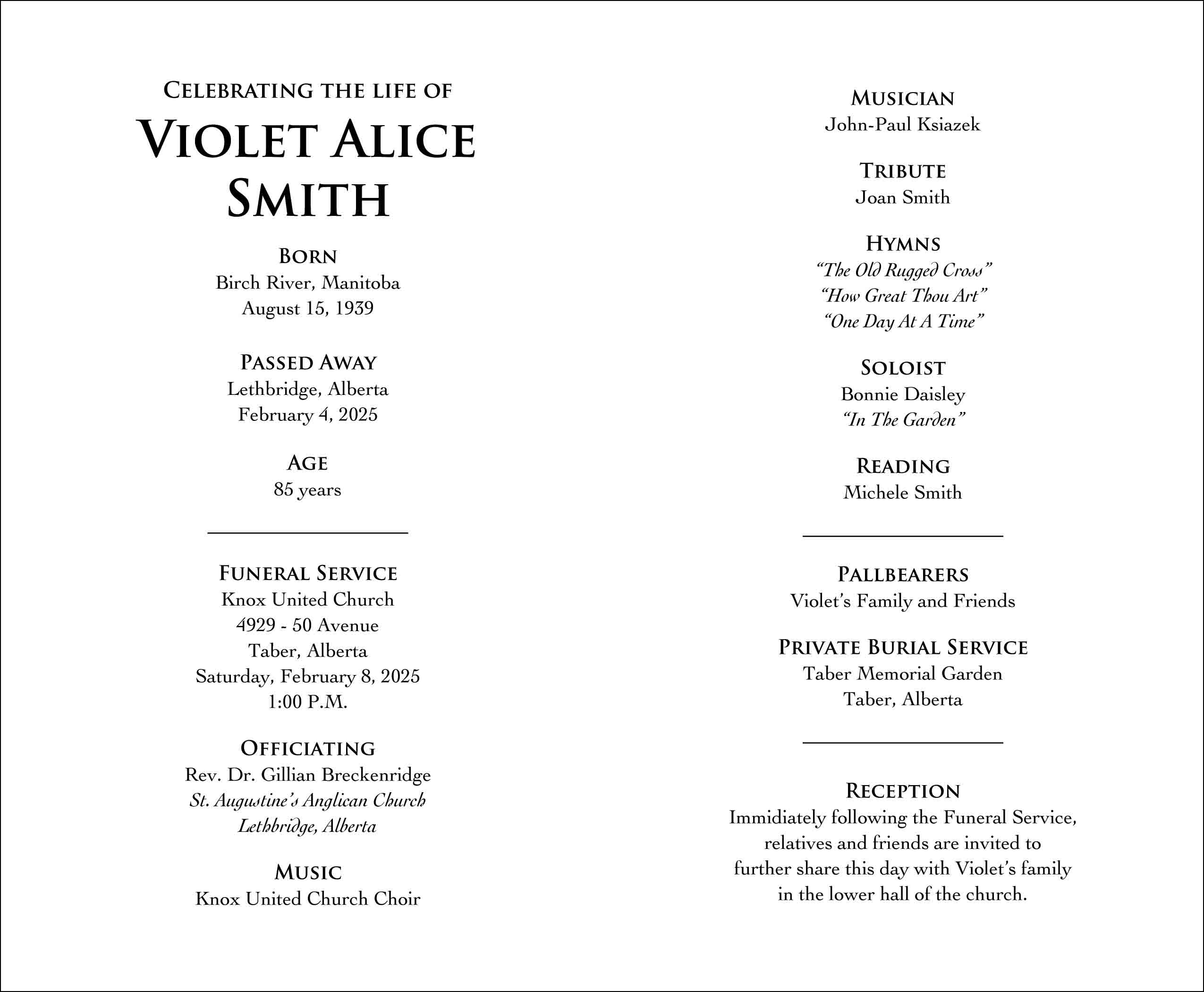 Violet Alice Smith, beloved wife of the late Frank Smith, passed away in Lethbridge on Tuesday, February 4, 2025 at the age of 85 years.
