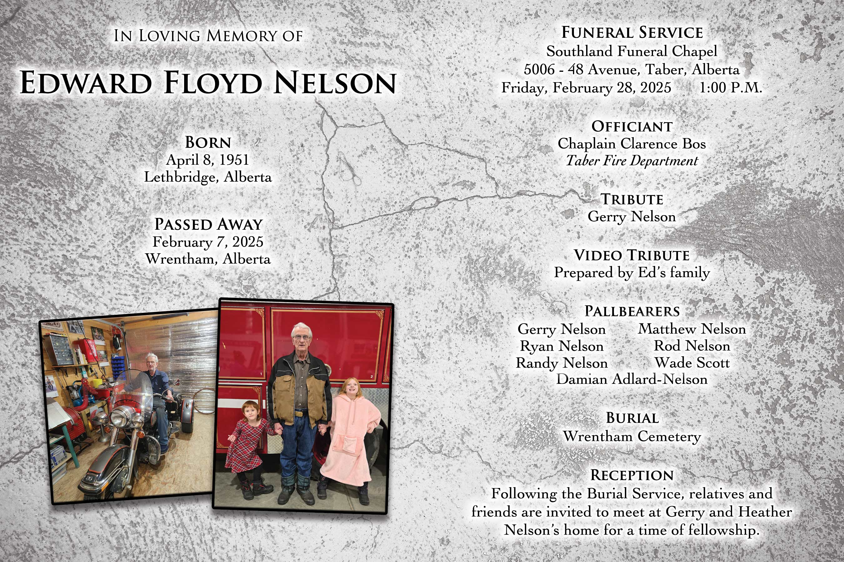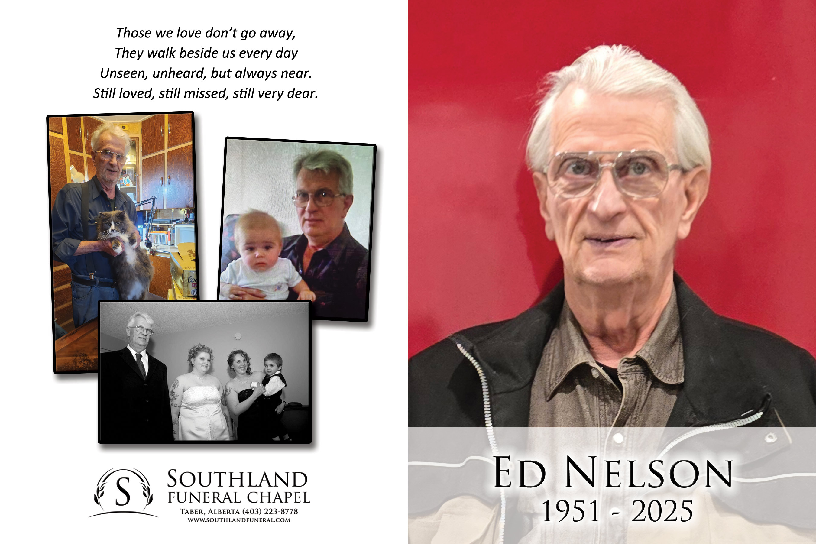 The Funeral Service was held at Southland Funeral Chapel, 5006 - 48 Avenue, Taber on Friday, February 28, 2025 at 1:00 P.M. Burial followed at Wrentham Cemetery.