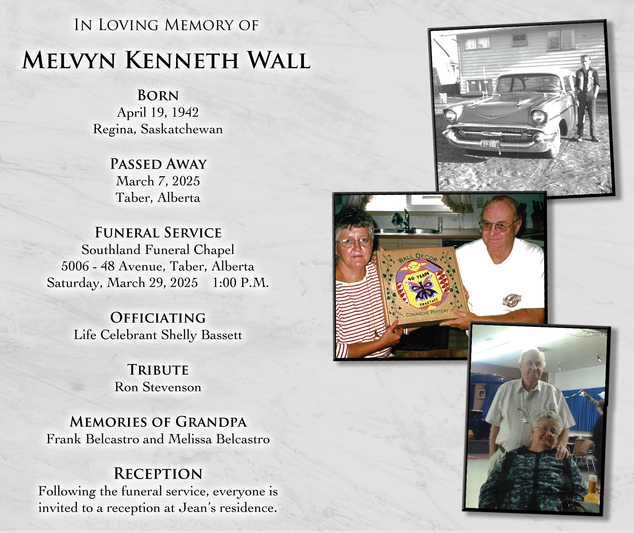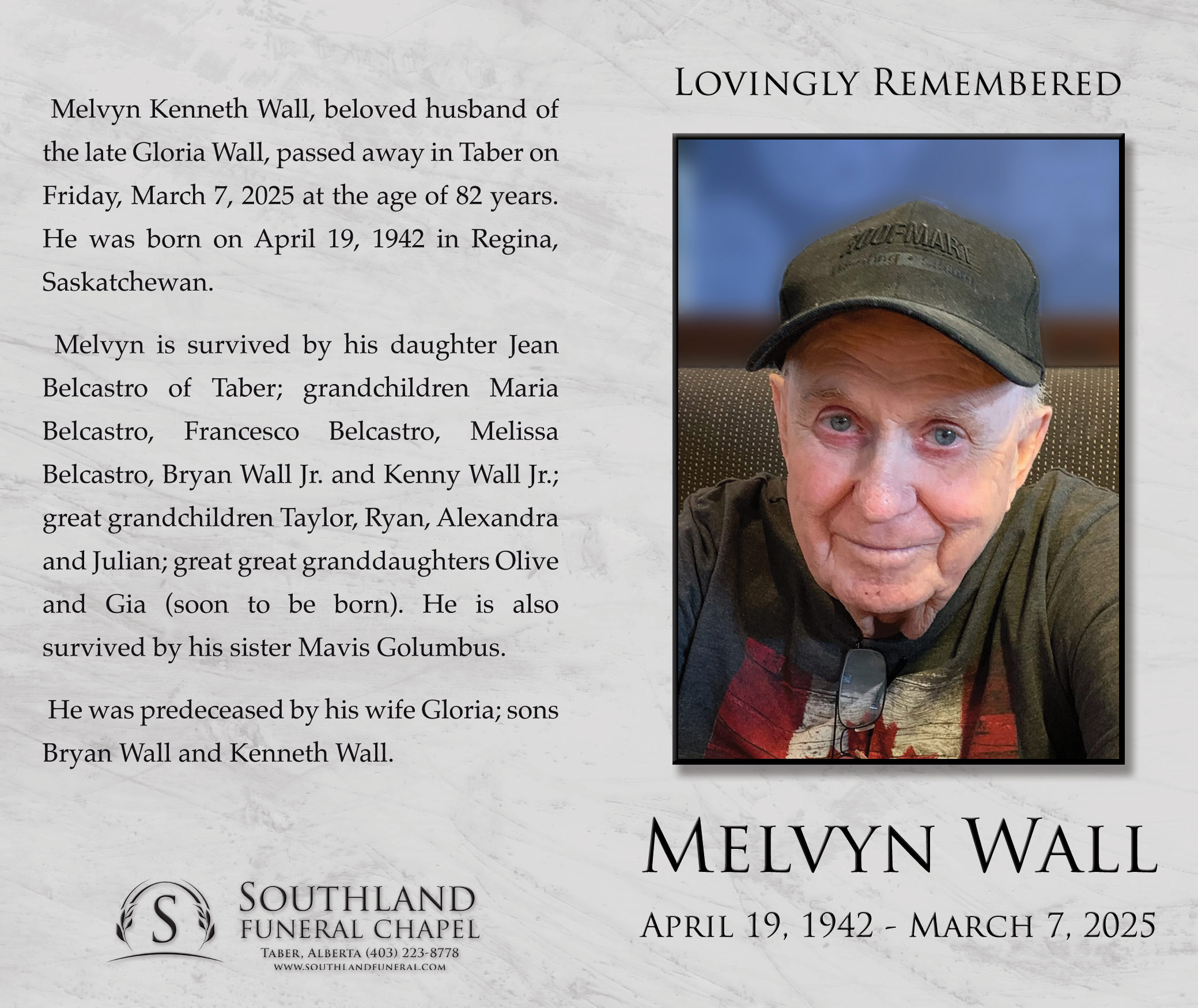 Melvyn Kenneth Wall, beloved husband of the late Gloria Wall, passed away in Taber on Friday, March 7, 2025 at the age of 82 years. Melvyn was born on April 19, 1942 in Regina, Saskatchewan.