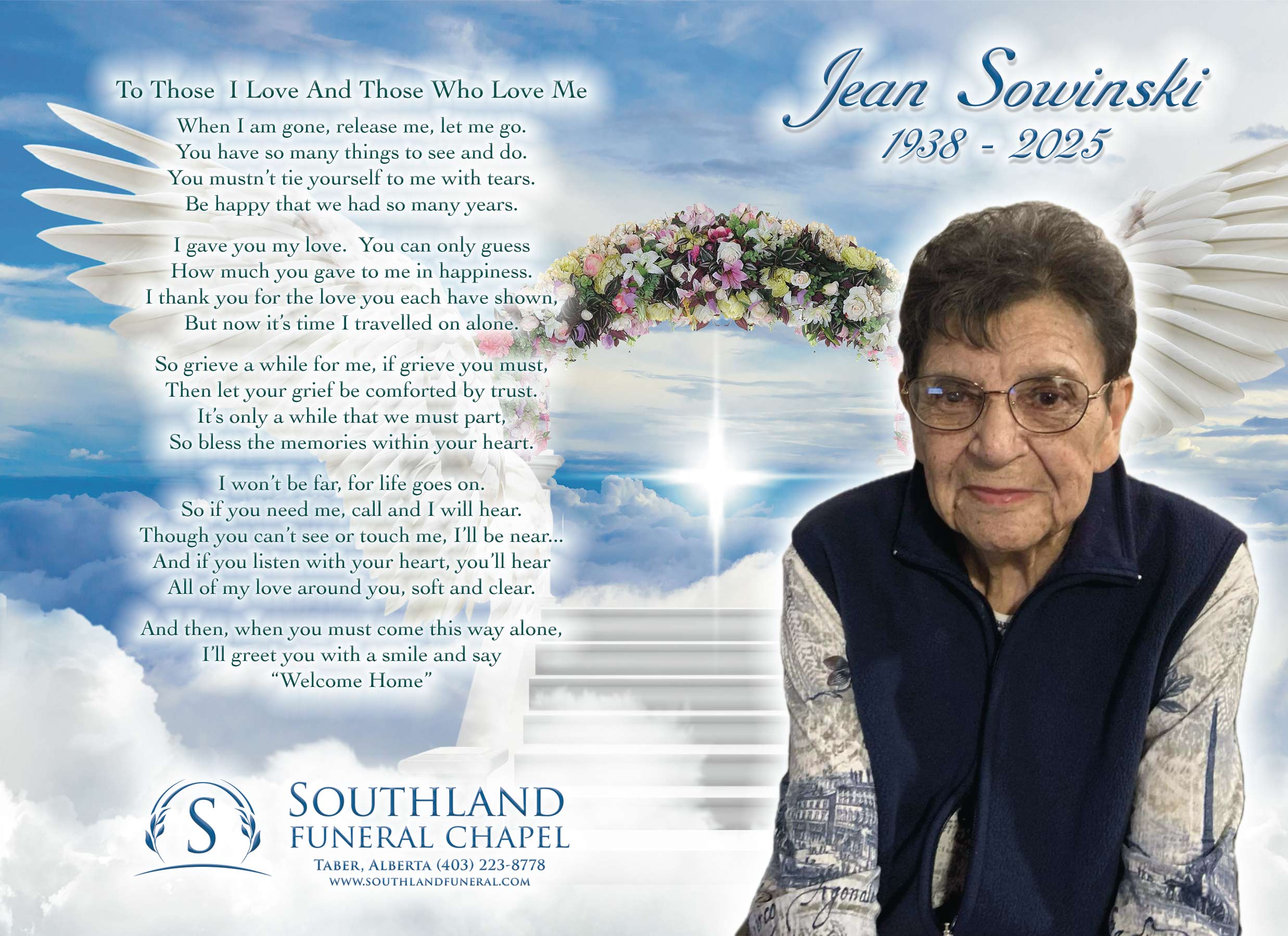 Jean Bertha Sowinski, beloved wife of the late Harry Sowinski passed away peacefully with her family at her side in Taber on Saturday, April 19, 2025 at the age of 87 years.